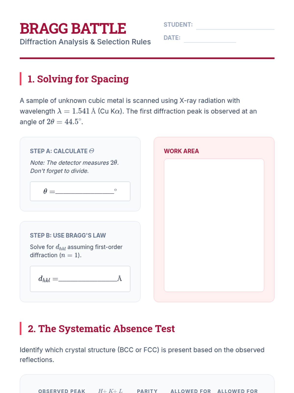 An undergraduate-level exploration of solid-state crystallography, moving from real-space lattice geometry and packing efficiency to the mathematical abstraction of reciprocal space and X-ray diffraction analysis. Students master the geometric principles that govern material properties at the atomic scale.