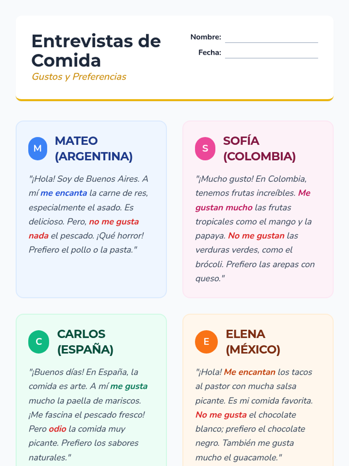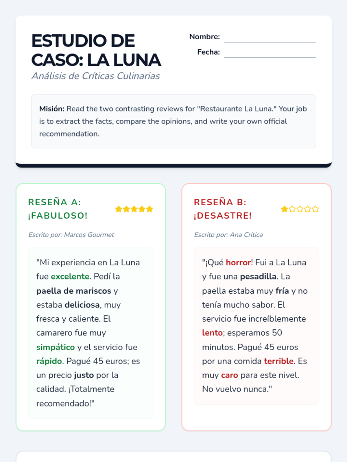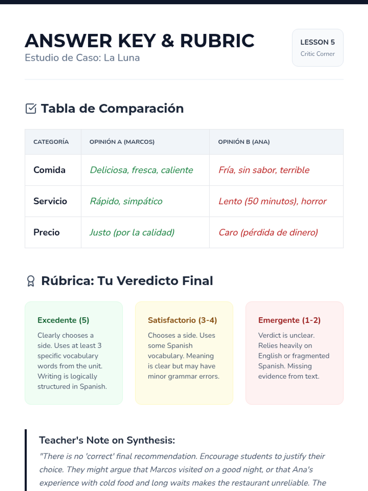 A comprehensive unit for high school Spanish beginners focusing on culinary literacy. Students move from basic food categorization to analyzing complex restaurant reviews, mastering vocabulary and the verb 'gustar' through authentic texts.