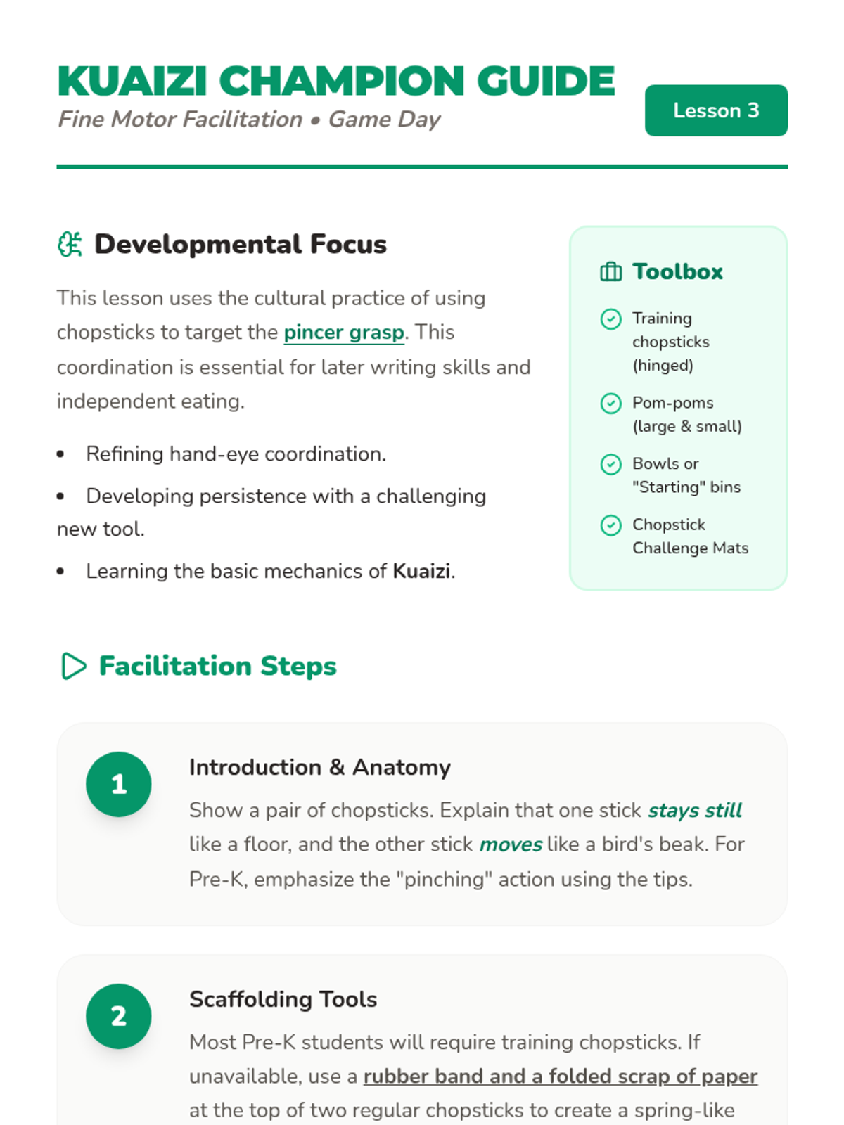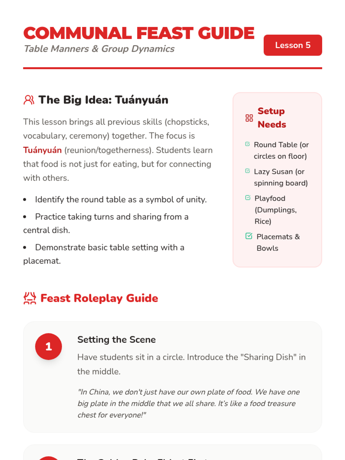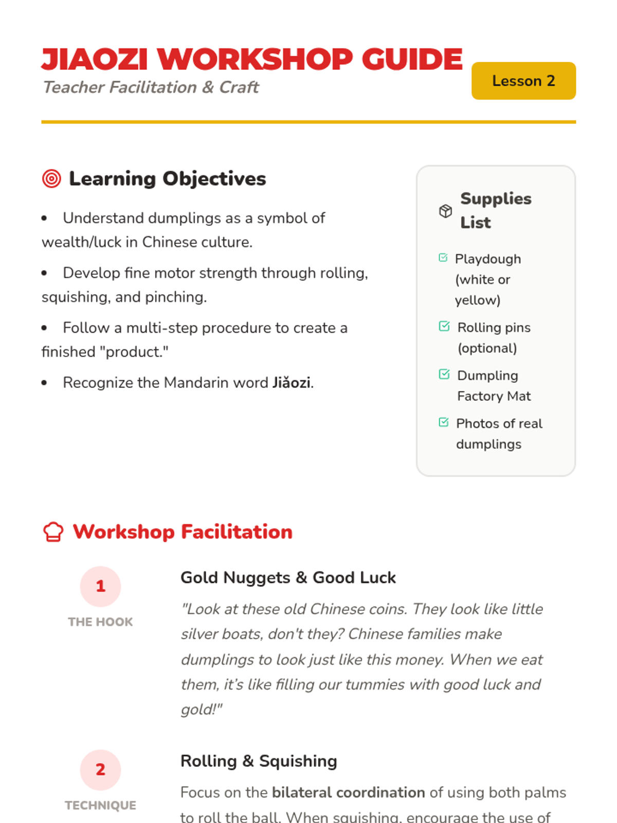 This sequence explores Chinese culinary traditions and table manners through sensory play, fine motor activities, and cultural simulations. Pre-K students will learn about staple foods, dumpling preparation, chopstick use, tea rituals, and communal dining etiquette.