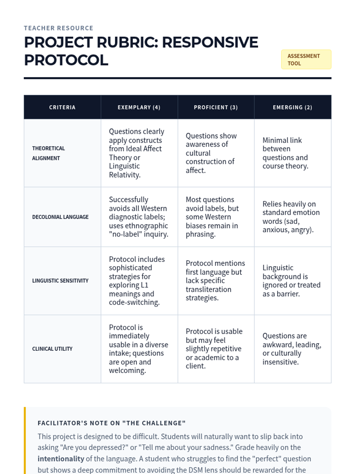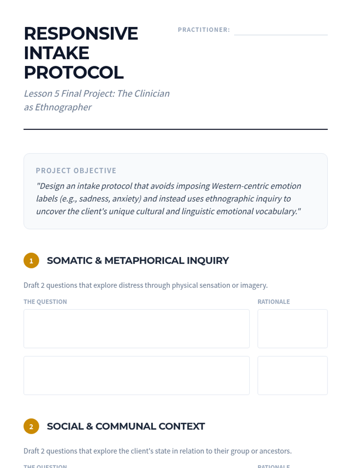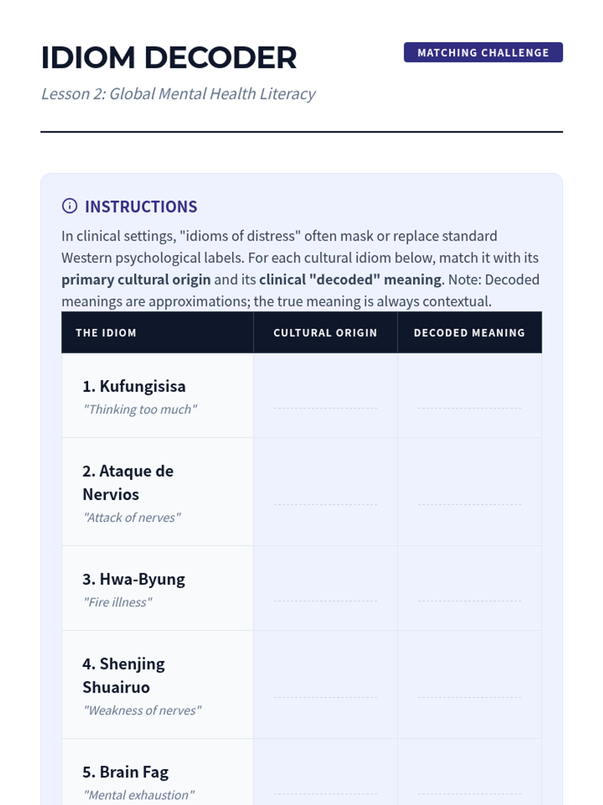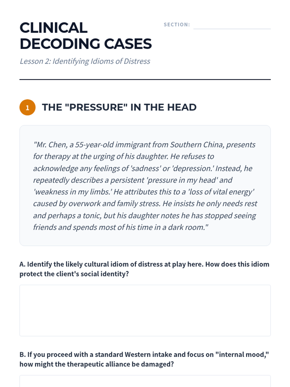 This sequence for graduate counseling students examines how culture, language, and systemic context shape emotional labeling and expression. It challenges Western-centric models and prepares students to use culturally humble inquiry in clinical settings.