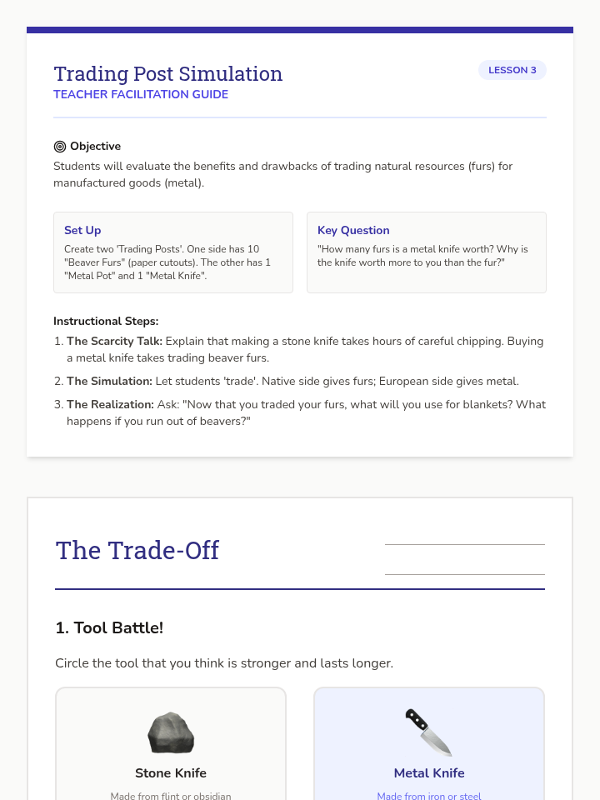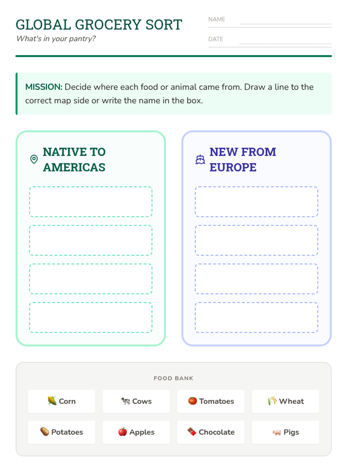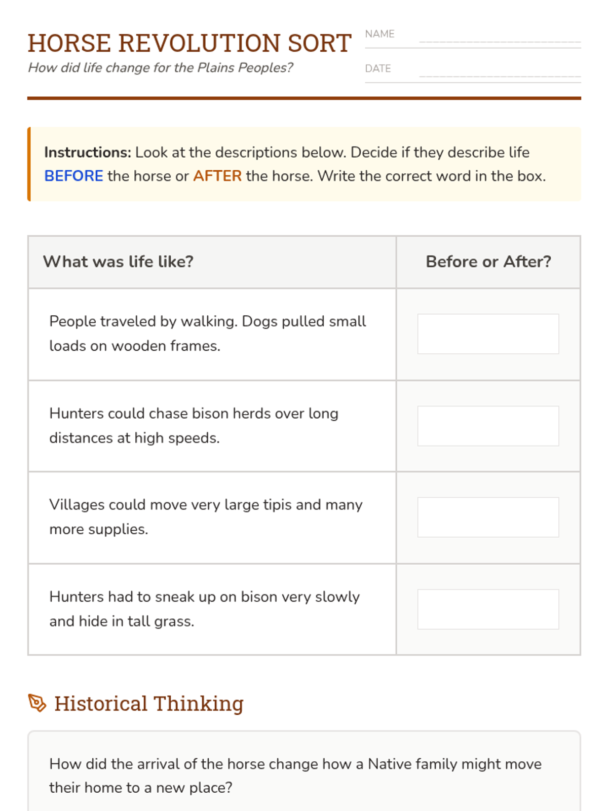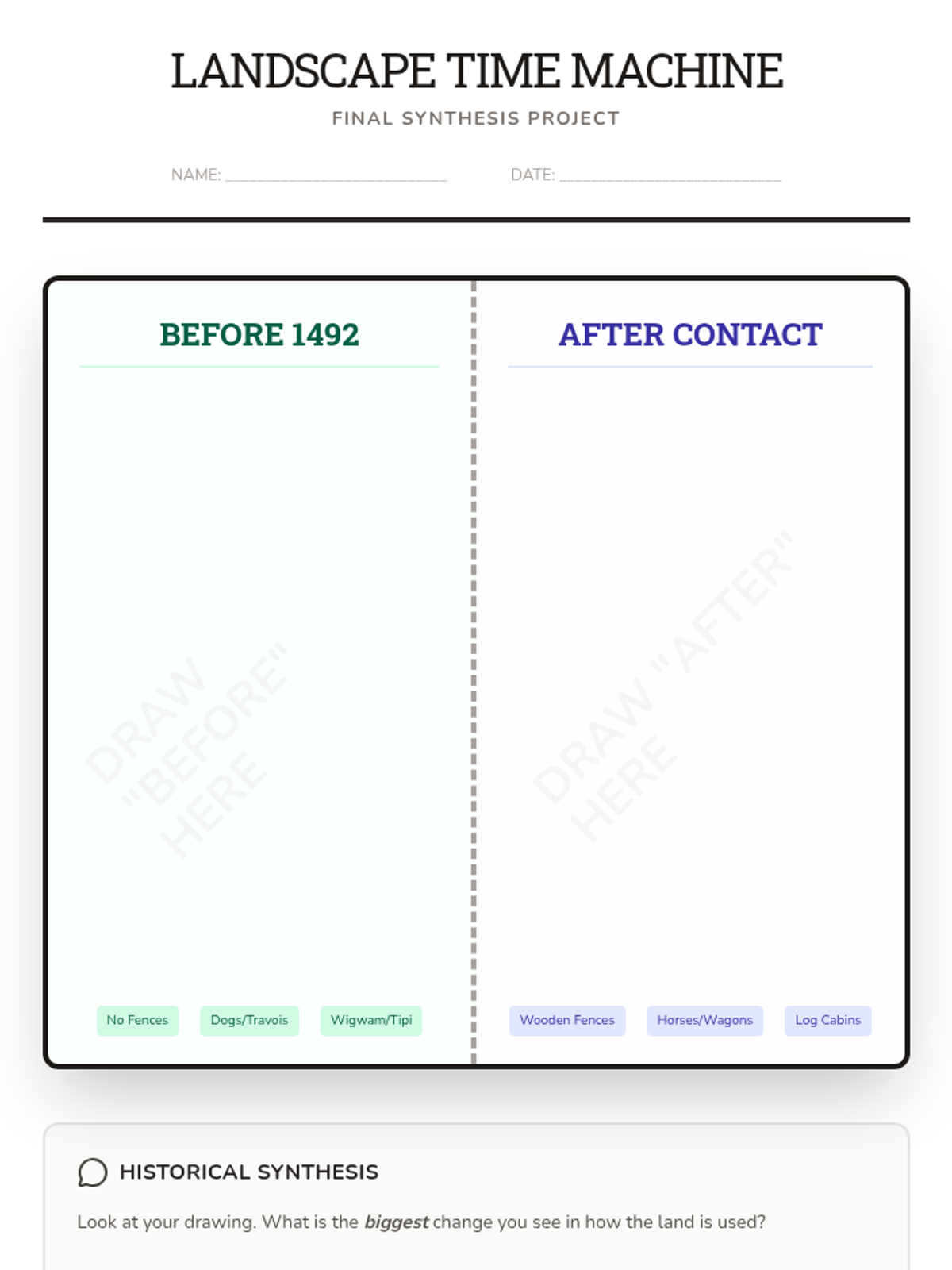 This sequence introduces 2nd-grade students to historical change and cultural exchange through the meeting of Native Peoples and Europeans. It focuses on how new animals, materials, and foods transformed daily life and the landscape, using a 'Before and After' comparative approach.
