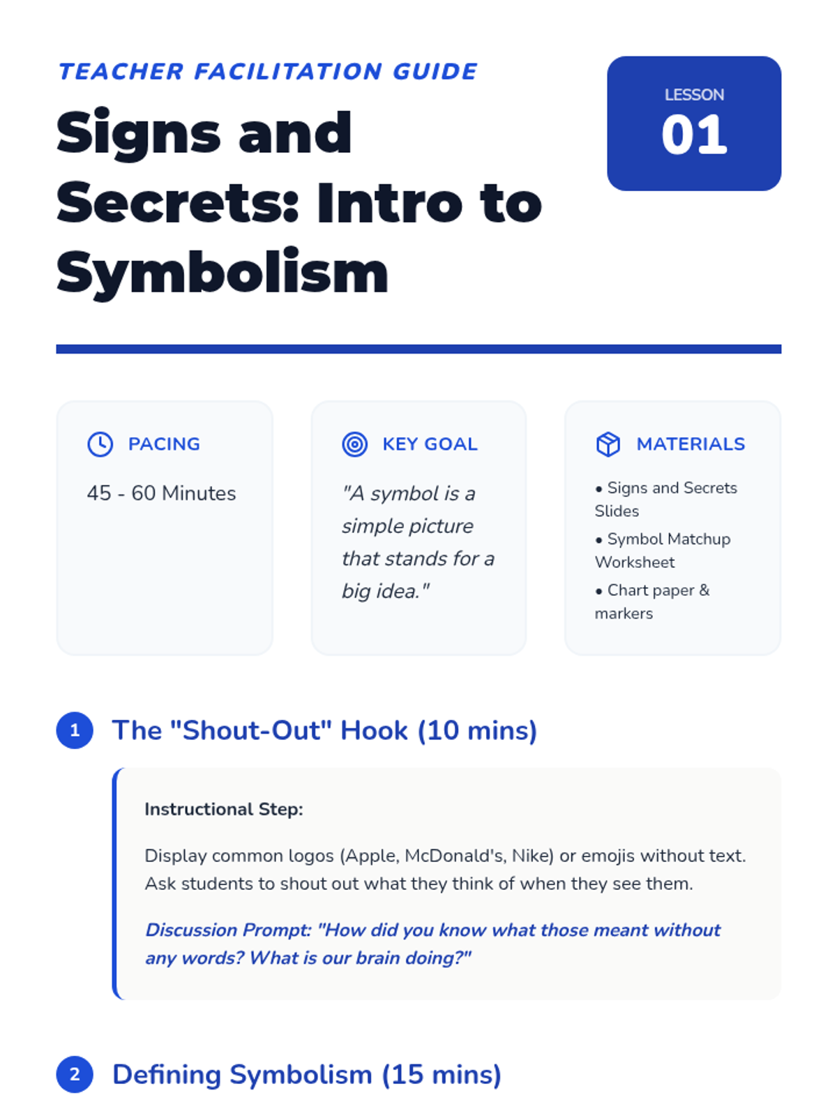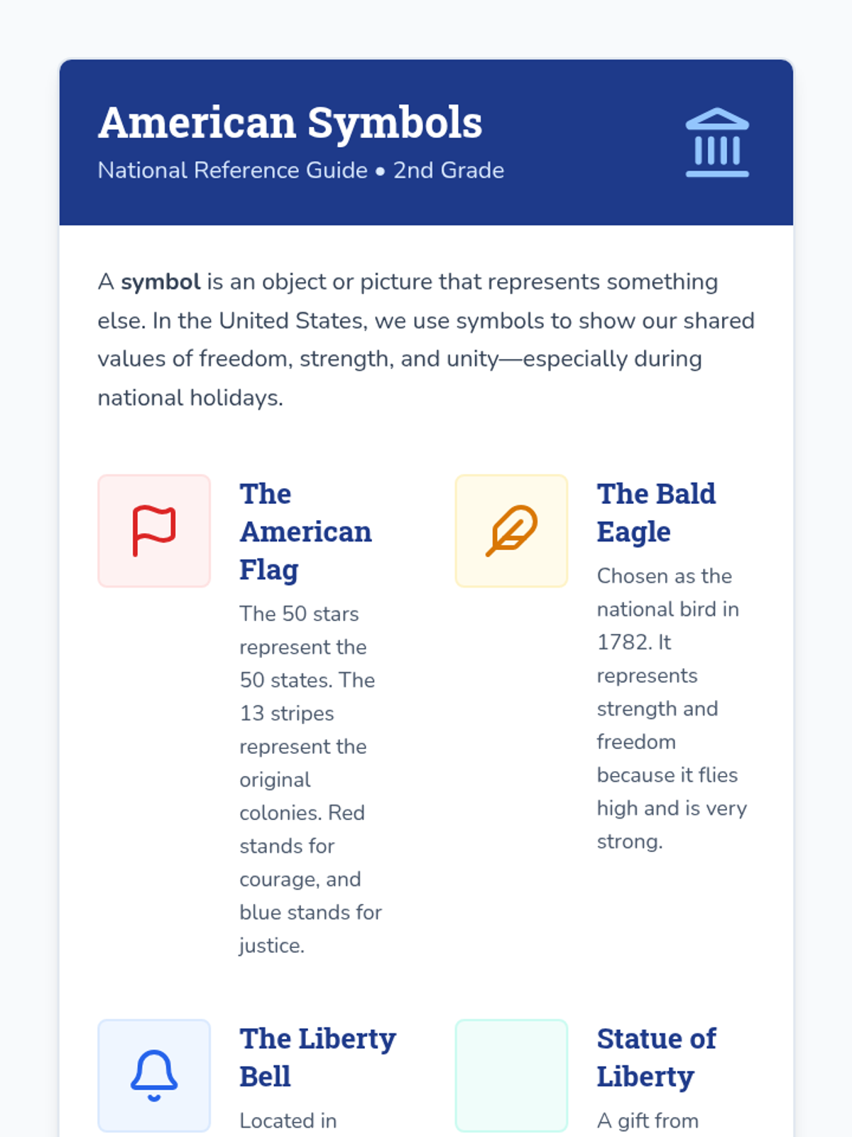 An inquiry-driven geography and civics sequence where 2nd-grade students explore the meaning of symbols, starting with familiar daily signs and progressing to iconic American landmarks like the flag, the bald eagle, and the Statue of Liberty.