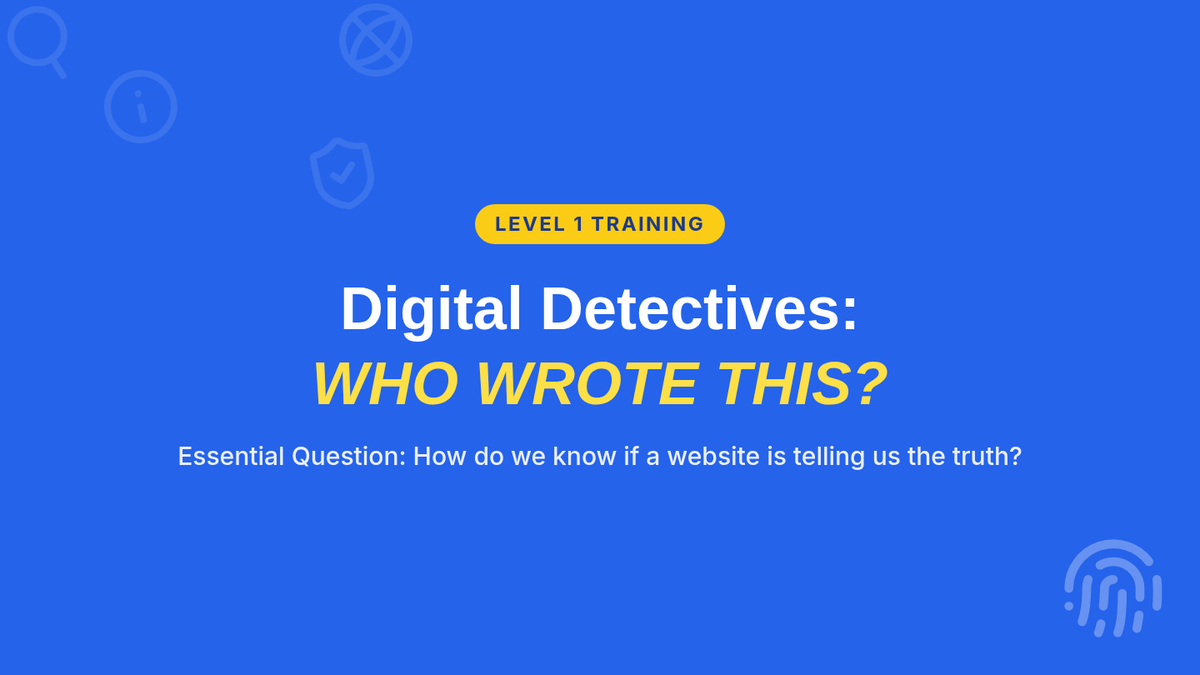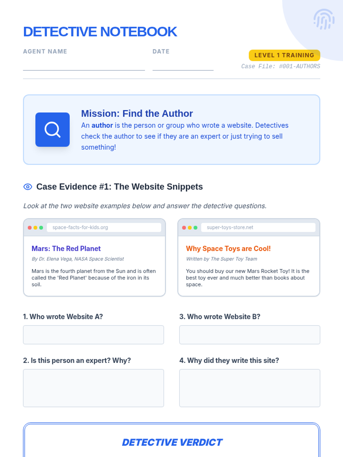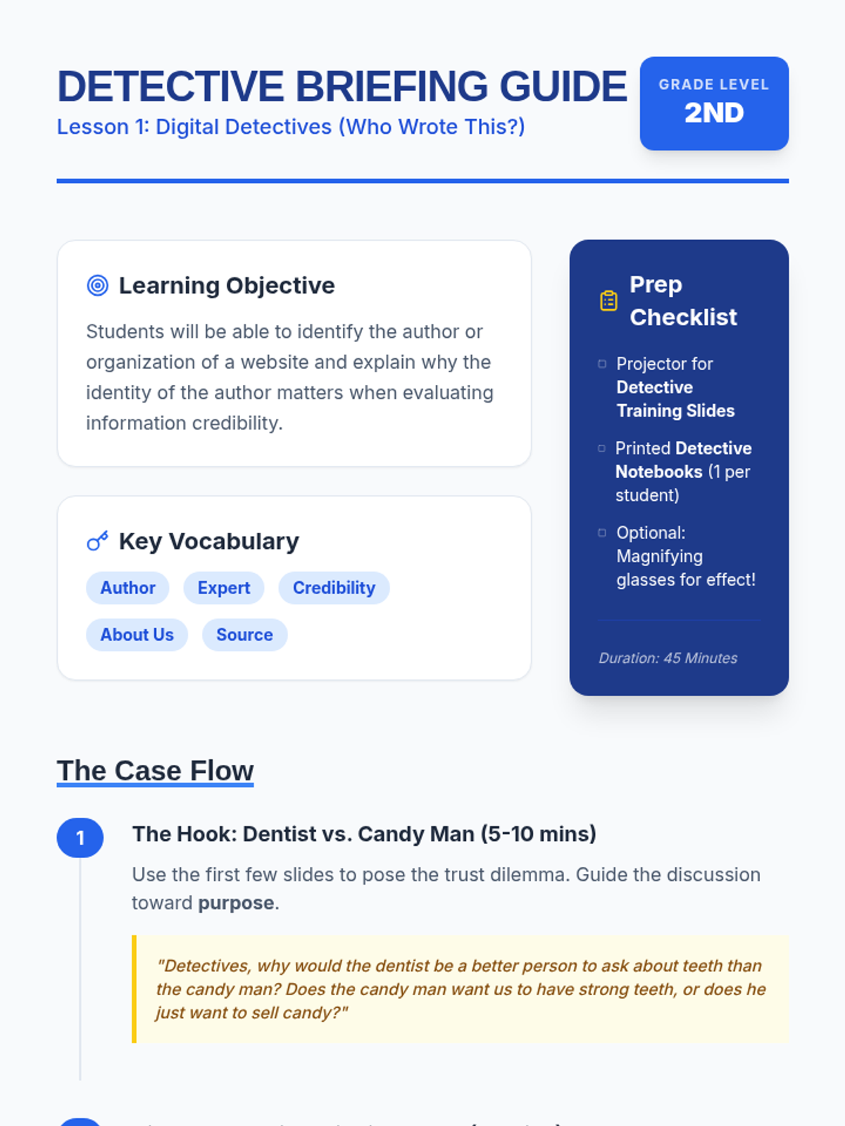 A comprehensive 5-lesson sequence for 2nd graders to develop critical thinking skills for the internet. Students use a 'Digital Detective' theme to investigate authorship, fact vs. opinion, advertisements, and information currency to determine if a website is safe and credible for school research.