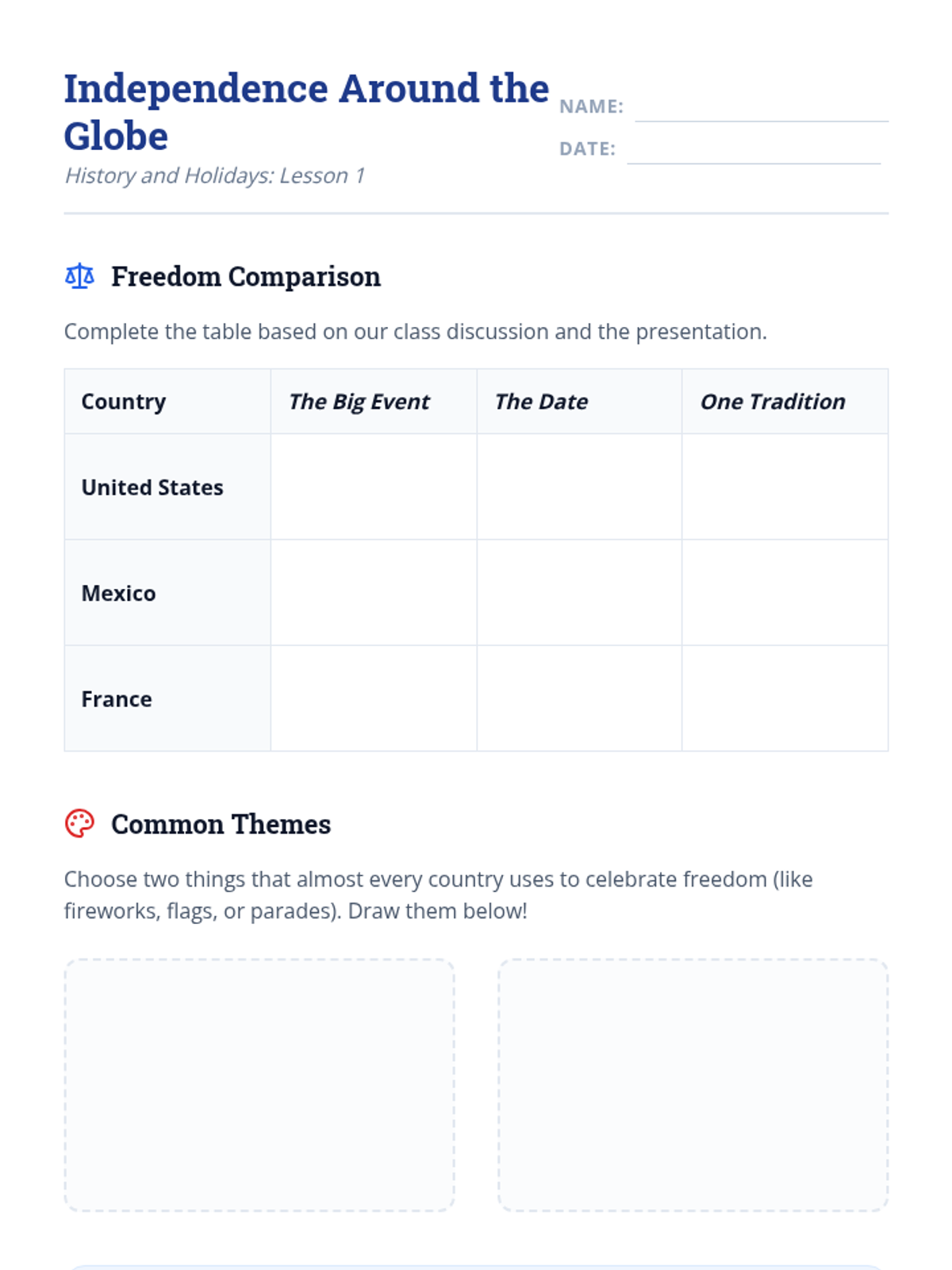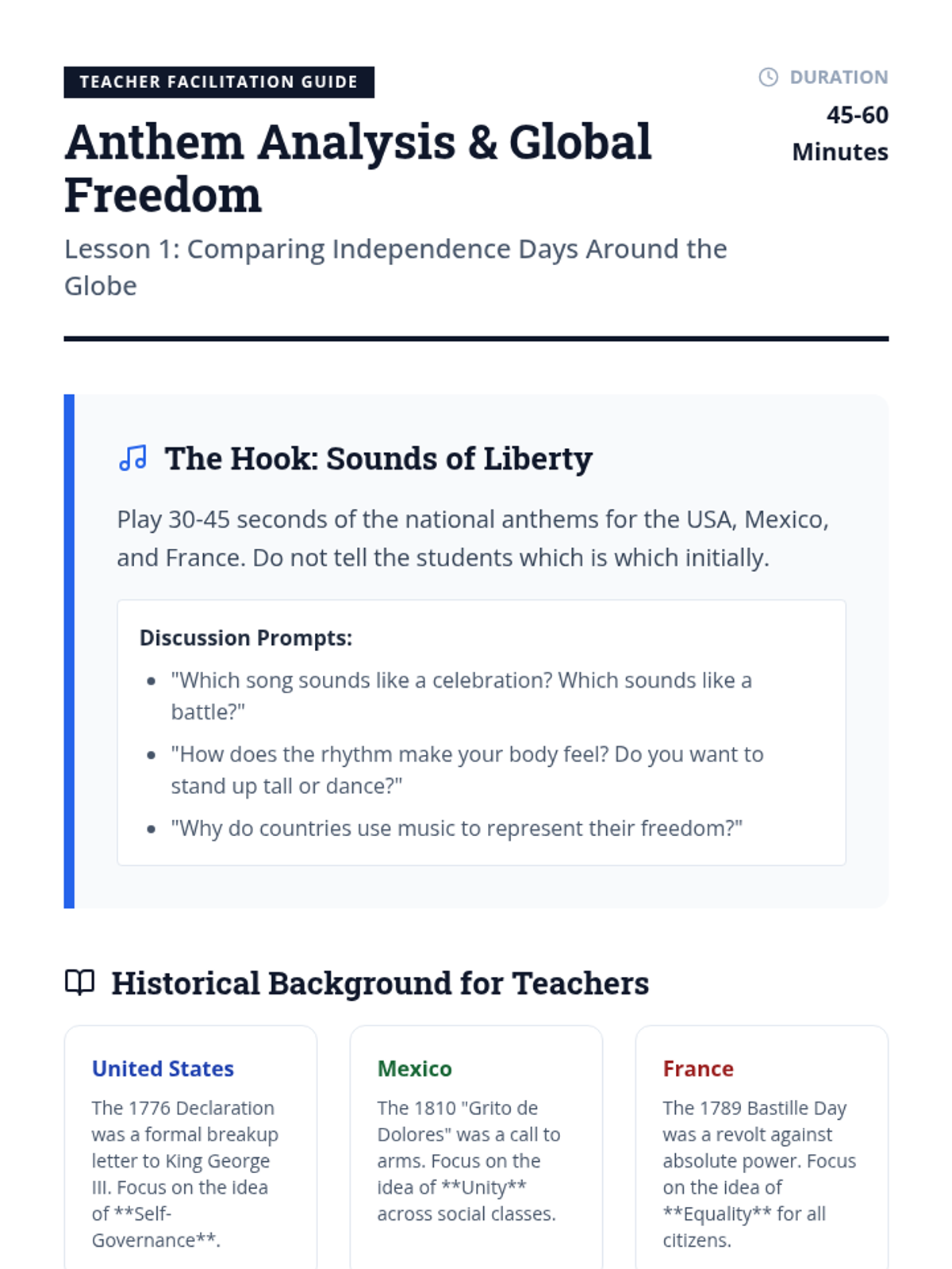 This sequence explores the historical and civic foundations of national holidays, helping students understand how nations remember their past. Students will investigate independence movements, leadership legacies, the nature of remembrance, chronological context, and national symbolism through comparative analysis and historical thinking.
