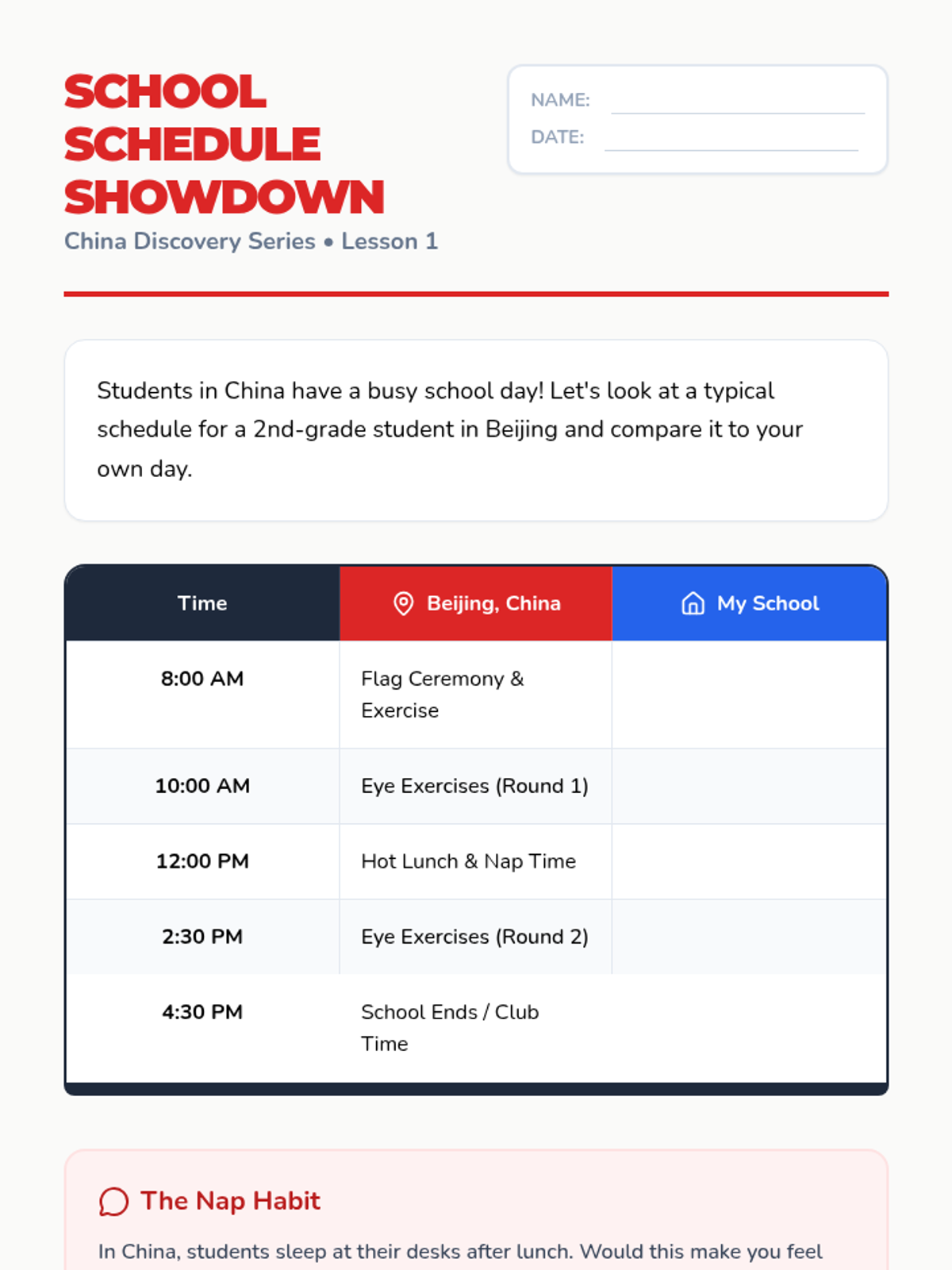 This sequence explores modern Chinese culture through the lens of daily life, comparing school routines, transportation, play, and urban landscapes to help 2nd-grade students understand their peers in China.