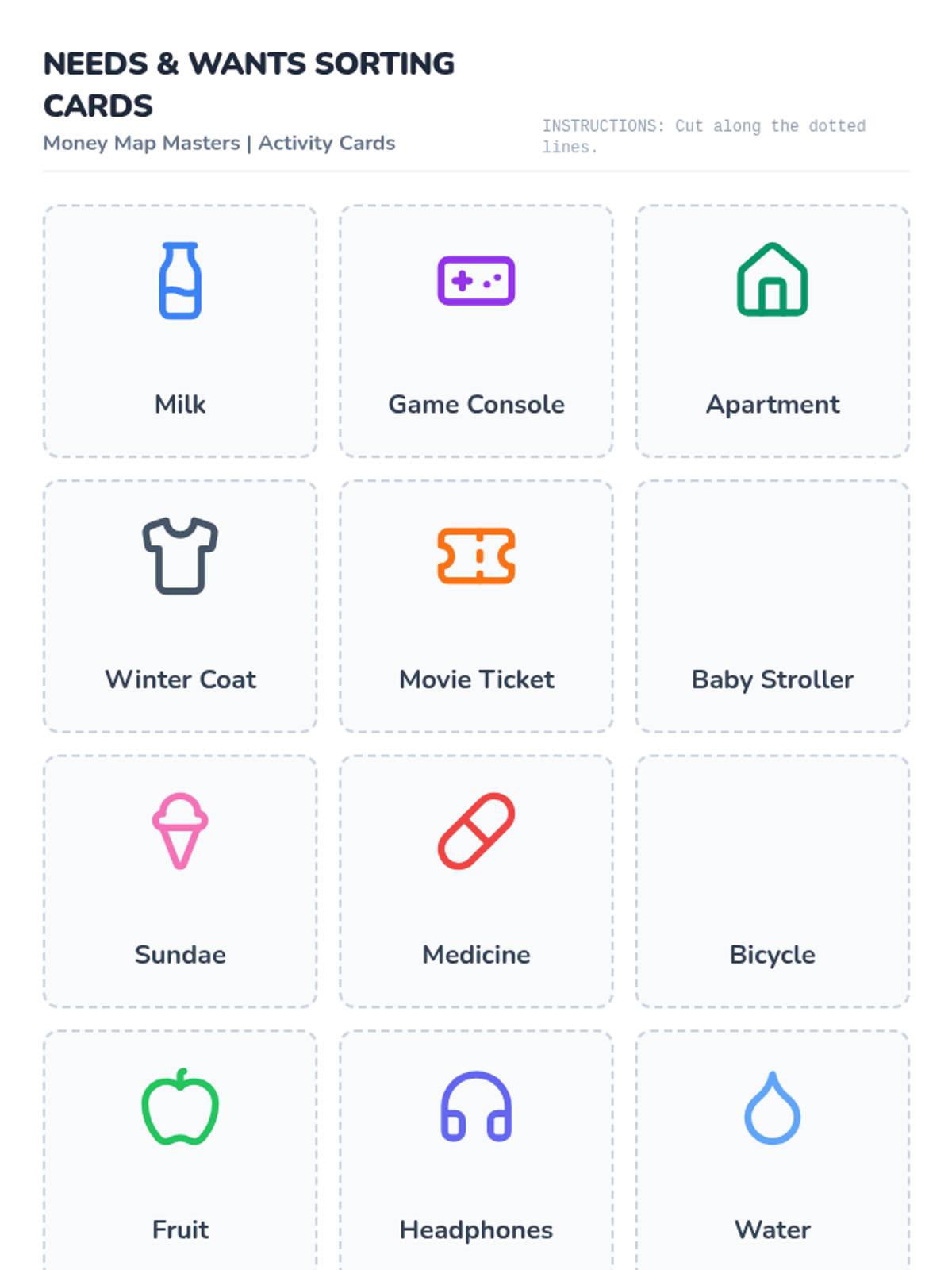 Students navigate a simulated classroom economy to learn budgeting, opportunity cost, and the difference between needs and wants through games and real-world scenarios.