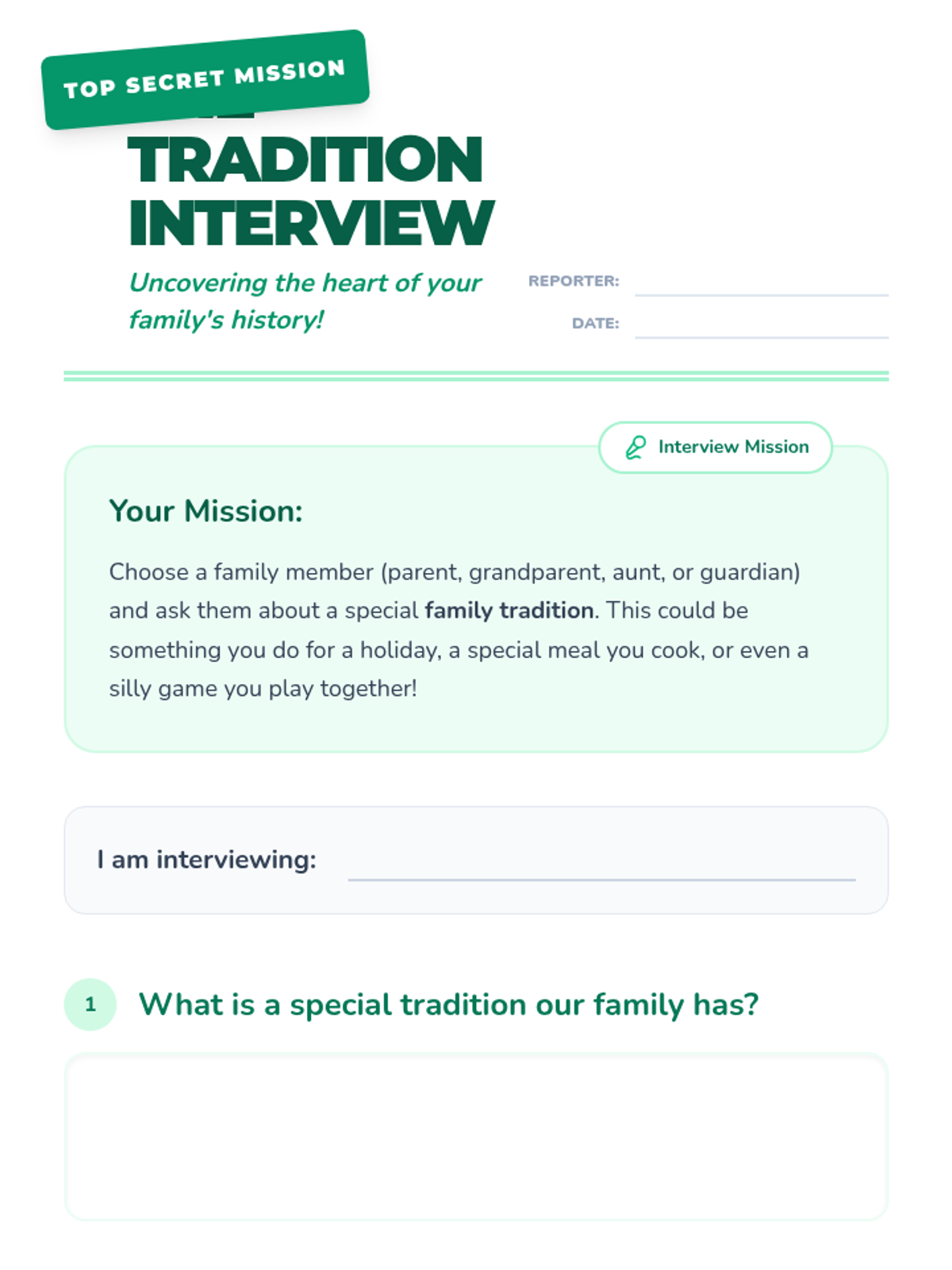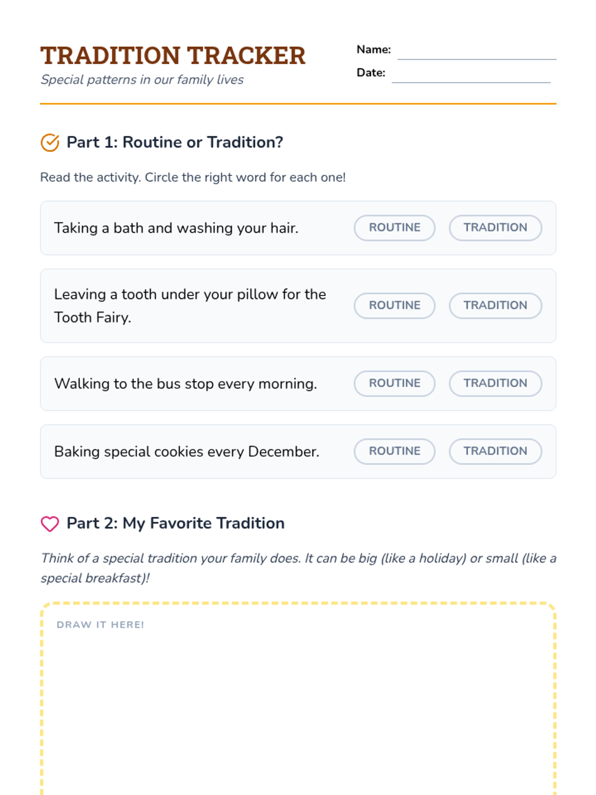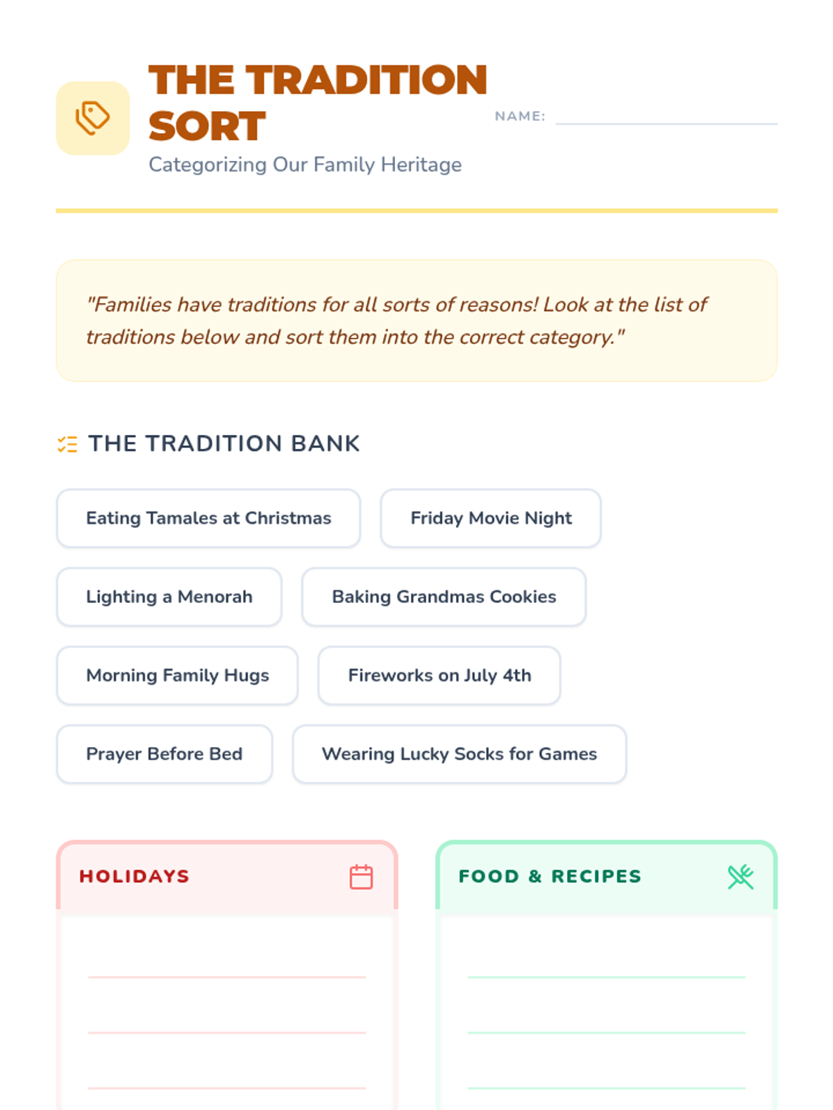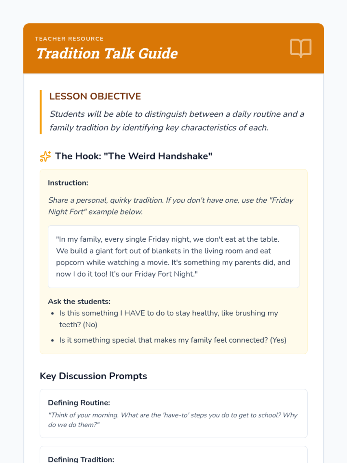 This 2nd-grade history sequence explores family heritages and cultural customs. Students learn to distinguish traditions from routines, investigate global ancestor-honoring holidays like Dia de los Muertos, practice oral history skills by interviewing elders, and discover how food connects history to geography, culminating in a collaborative class tradition book.