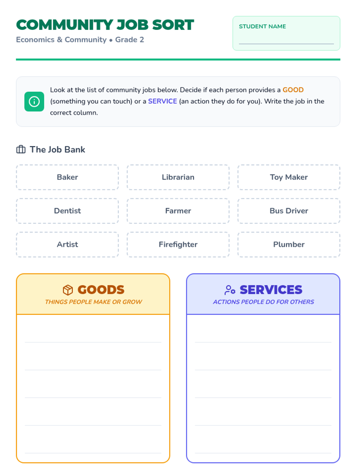 This sequence introduces 2nd graders to the fundamentals of economics through the lens of production and earning. Students learn to distinguish between goods and services, understand the link between labor and income, and participate in a project-based learning experience where they create products and simulate a classroom market.