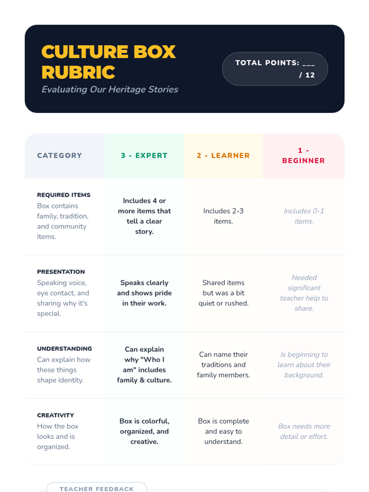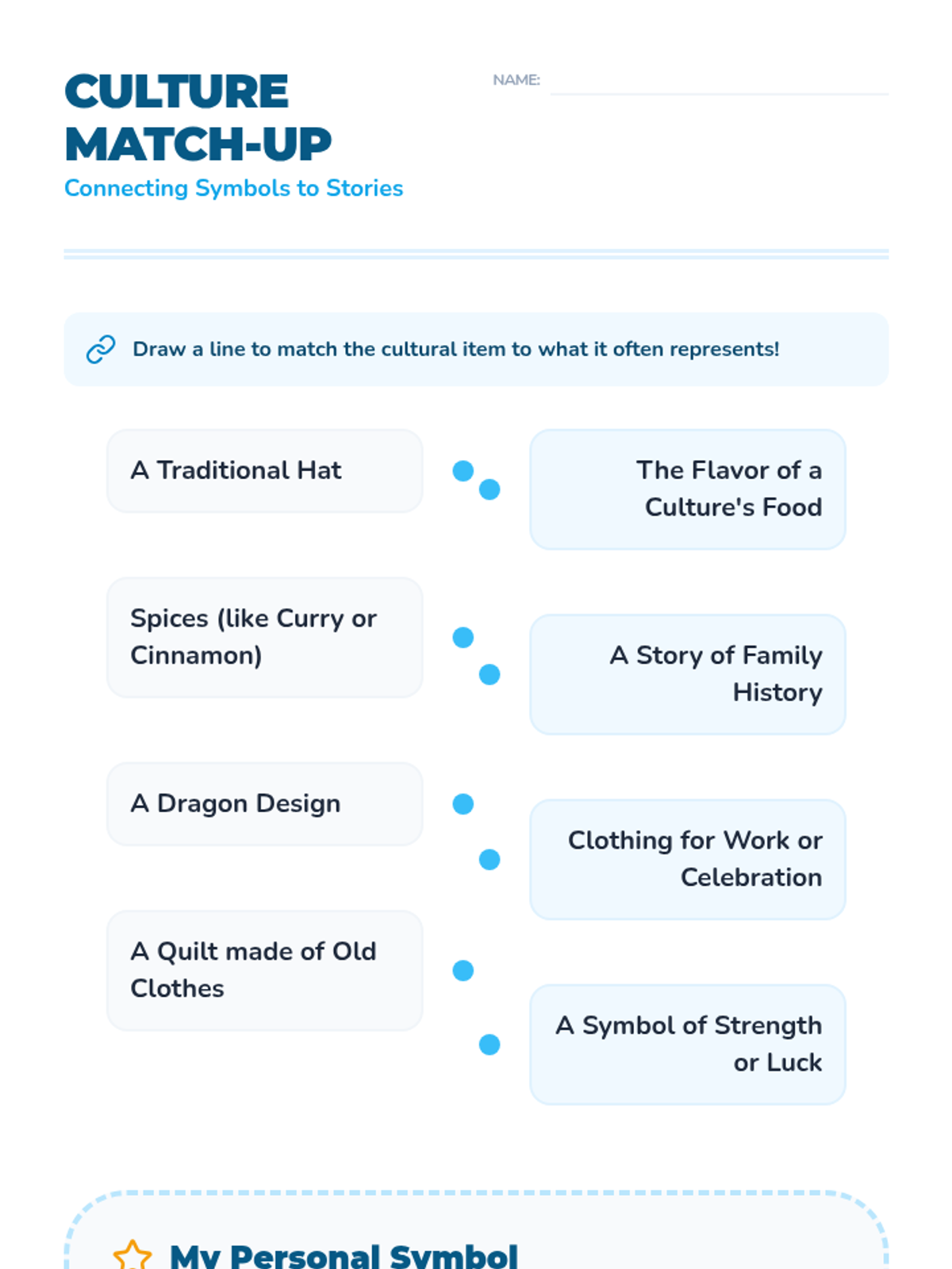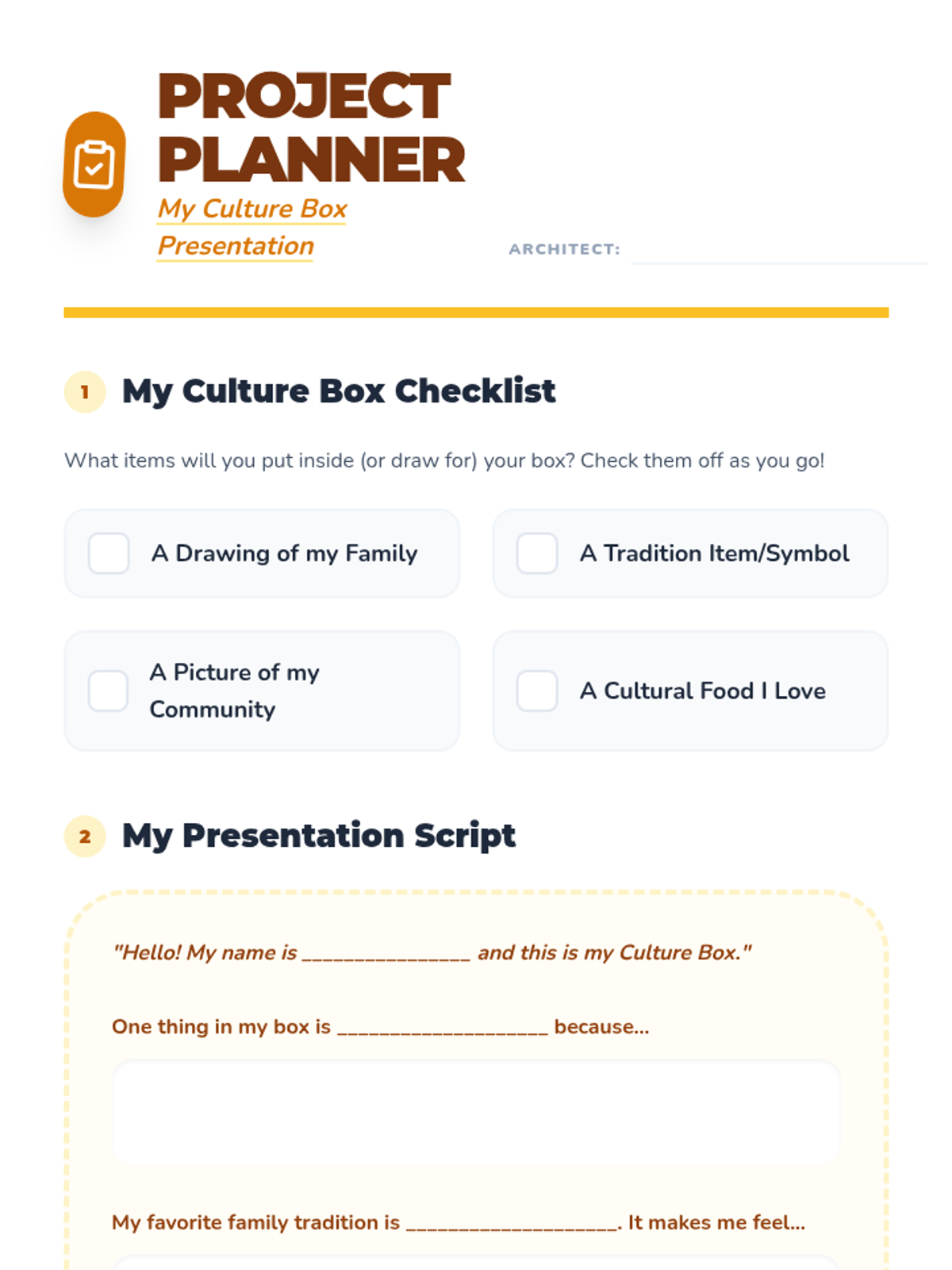 A 5-lesson sequence for 2nd graders exploring how family, culture, and traditions shape individual identity. Students investigate their own backgrounds through inquiry and interviews, culminating in a 'Culture Box' project.