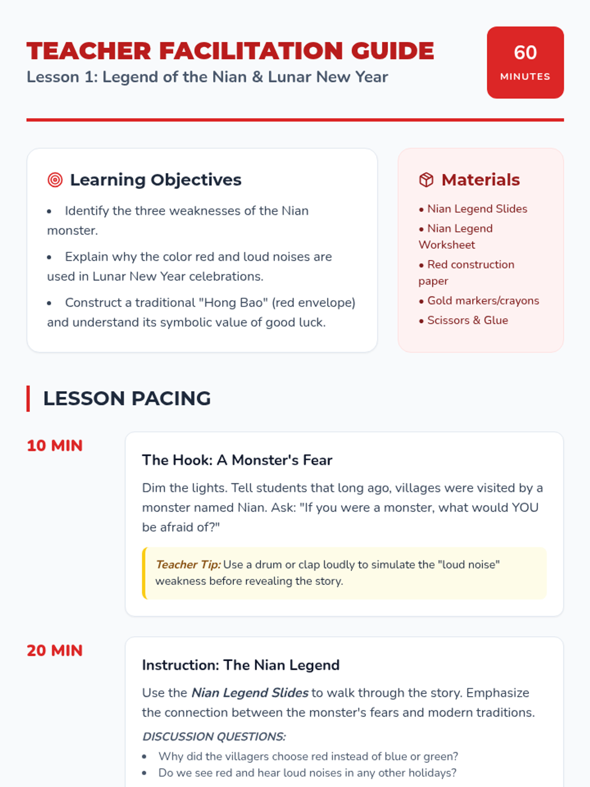 A 5-lesson sequence for 2nd Grade students exploring the stories, symbols, and traditions of major Chinese festivals, including Lunar New Year, the Lantern Festival, the Dragon Boat Festival, and the Mid-Autumn Festival.