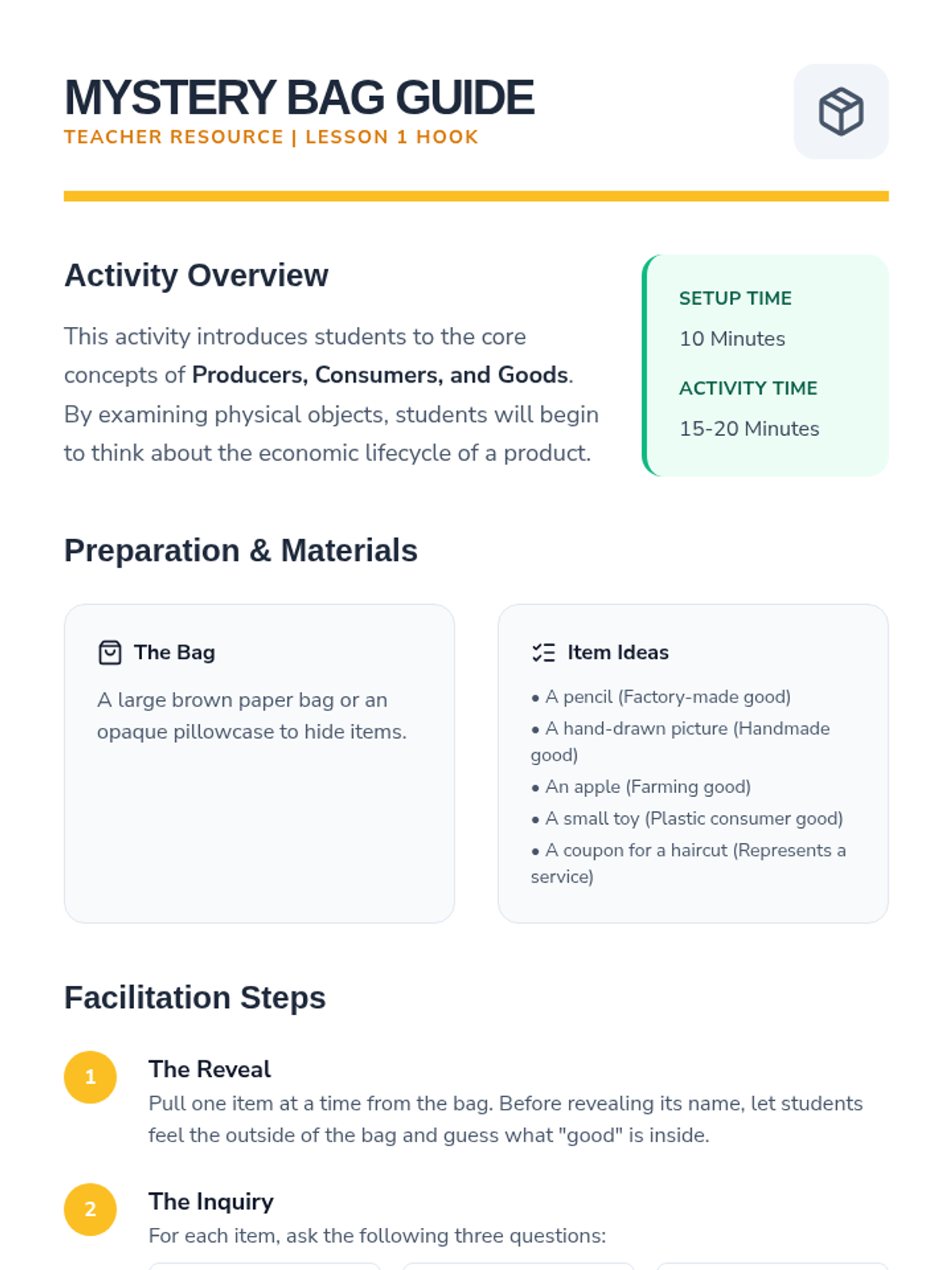 This immersive sequence guides second-grade students through the evolution of trade, from bartering to modern currency. Students participate in simulations to discover the inefficiencies of direct trade and the necessity of money as a medium of exchange, unit of account, and store of value.