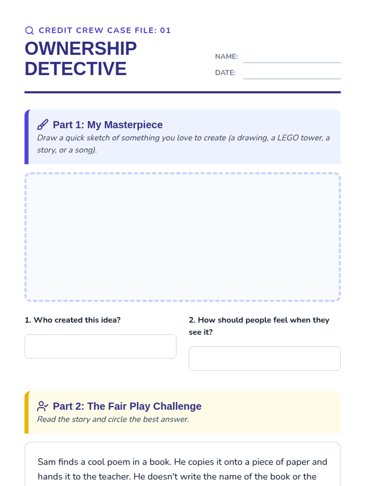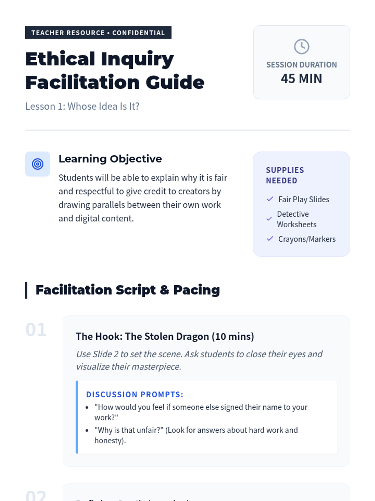 A 2nd-grade sequence introducing the ethics of digital citizenship. Students explore why we give credit to creators, how to find authorship information on websites, and how to format simple citations using the 'Citation Sandwich' method.