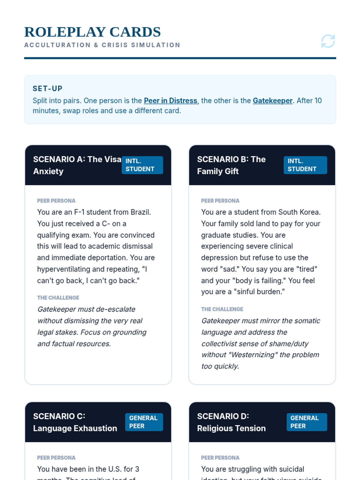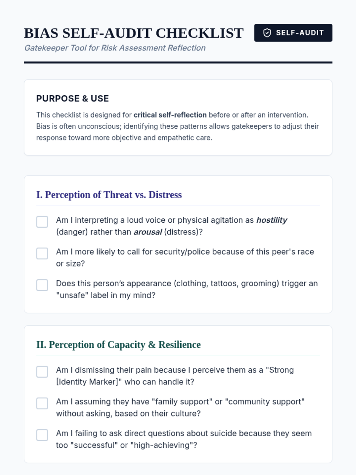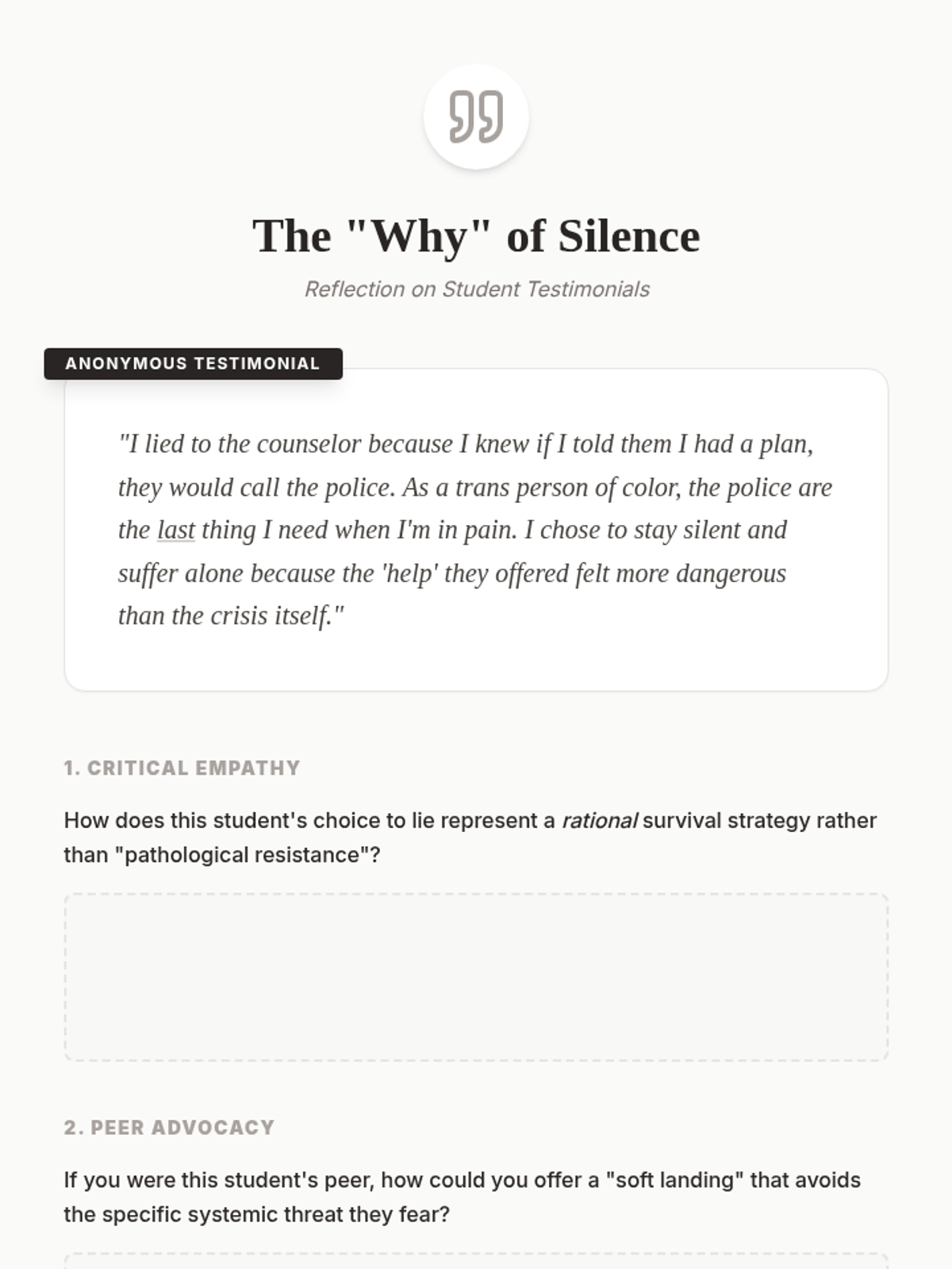 A comprehensive graduate-level training sequence exploring how cultural identity, systemic barriers, and implicit bias influence crisis presentation and peer support. Students move from understanding diverse cultural idioms of distress to developing culturally responsive safety plans that challenge traditional Western medical models.
