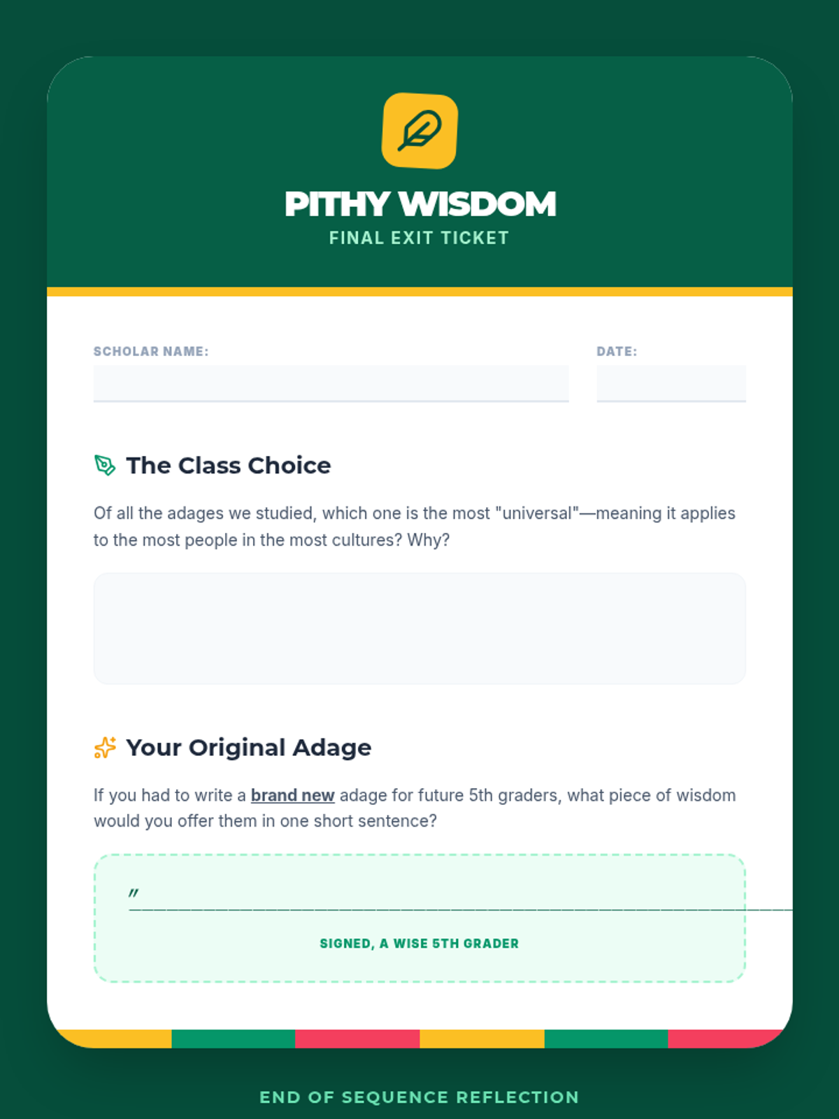 This sequence explores adages and proverbs as cultural artifacts that convey values and wisdom. Students distinguish them from idioms, compare global examples, connect them to fables, apply them to modern life, and debate their nuances in a Socratic Seminar.