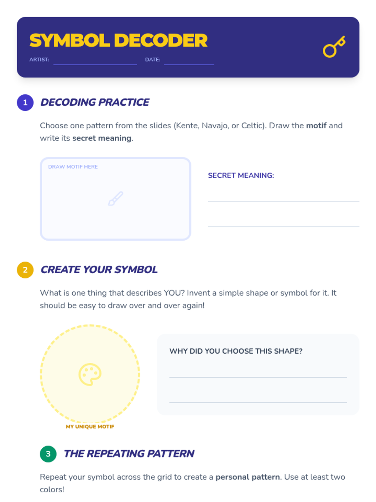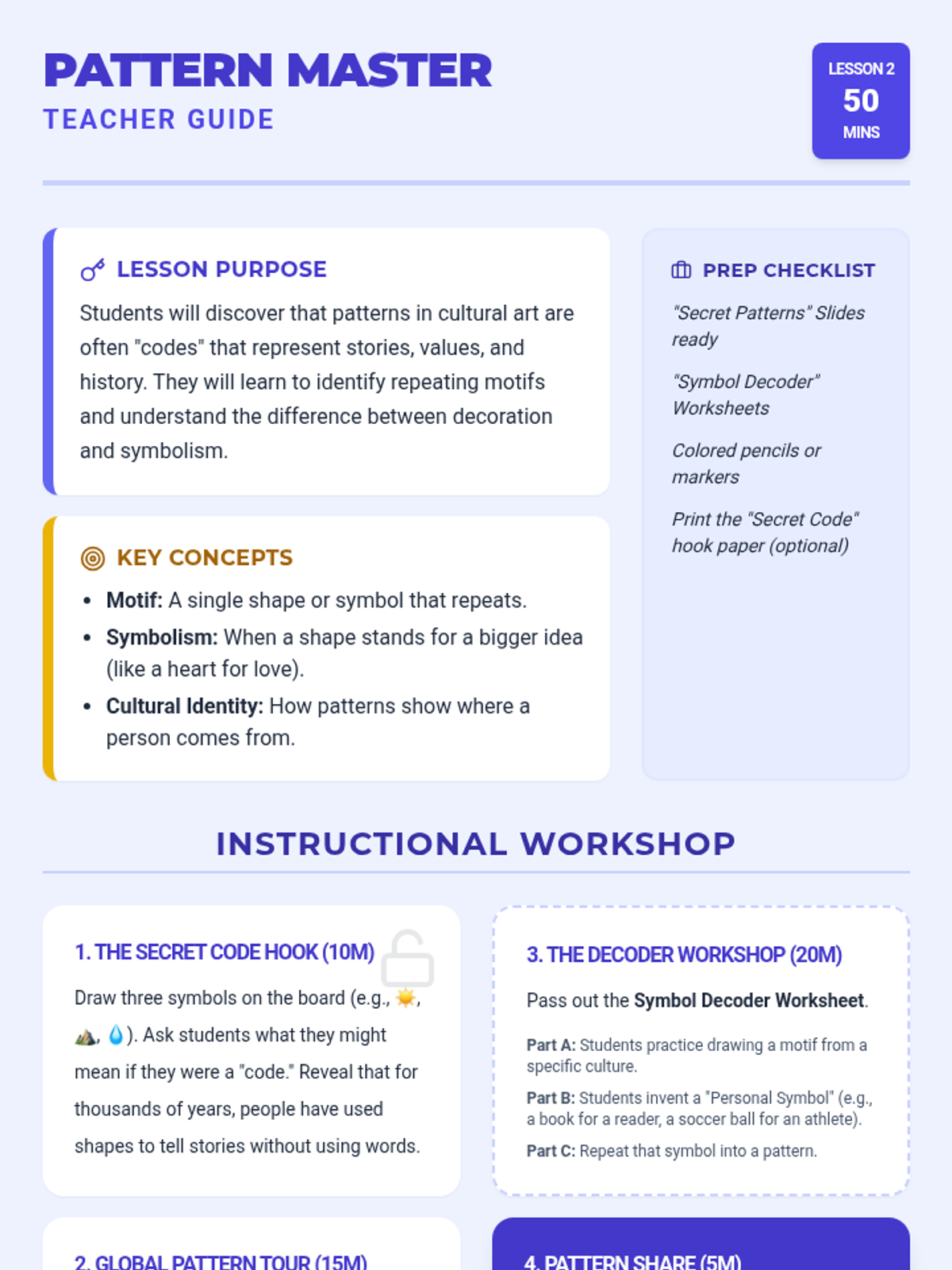 A 2nd-grade art sequence investigating how art serves as a vessel for cultural identity, heritage, and storytelling through everyday artifacts, symbolic patterns, and festive celebrations. Students move from analyzing global case studies to creating their own heritage-inspired artwork for a classroom museum.