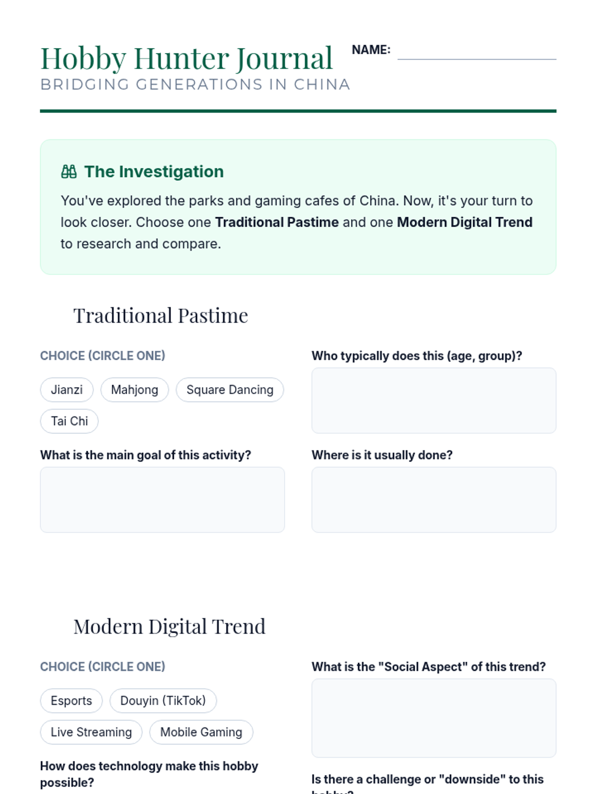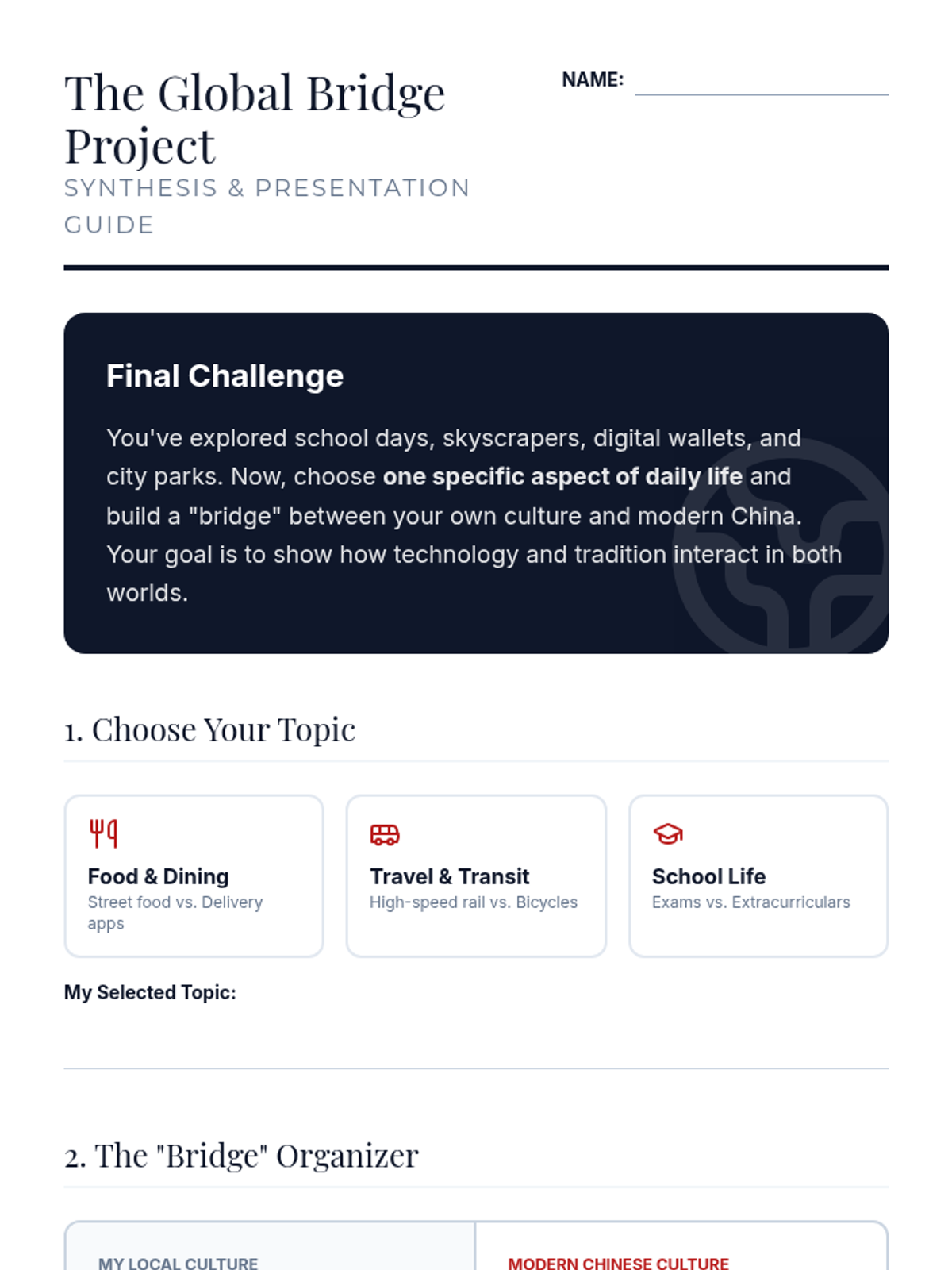 A 5-lesson inquiry into modern Chinese culture, comparing traditional values with rapid technological advancement through the lens of daily student life, housing, technology, and leisure.