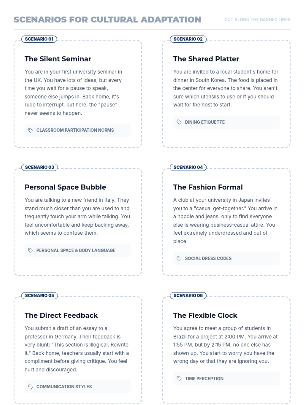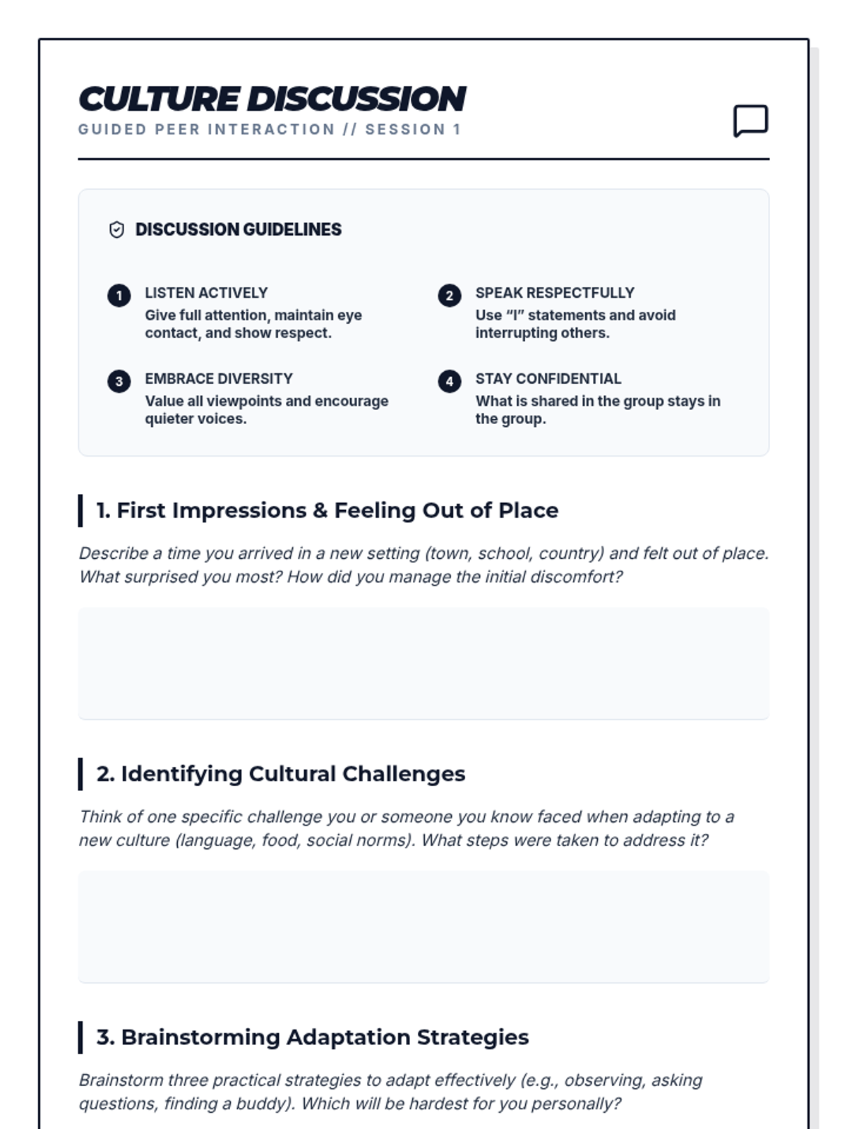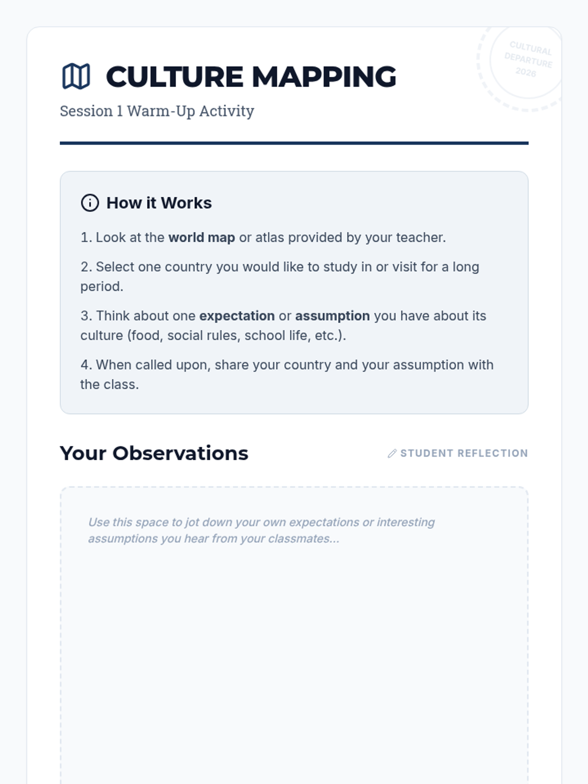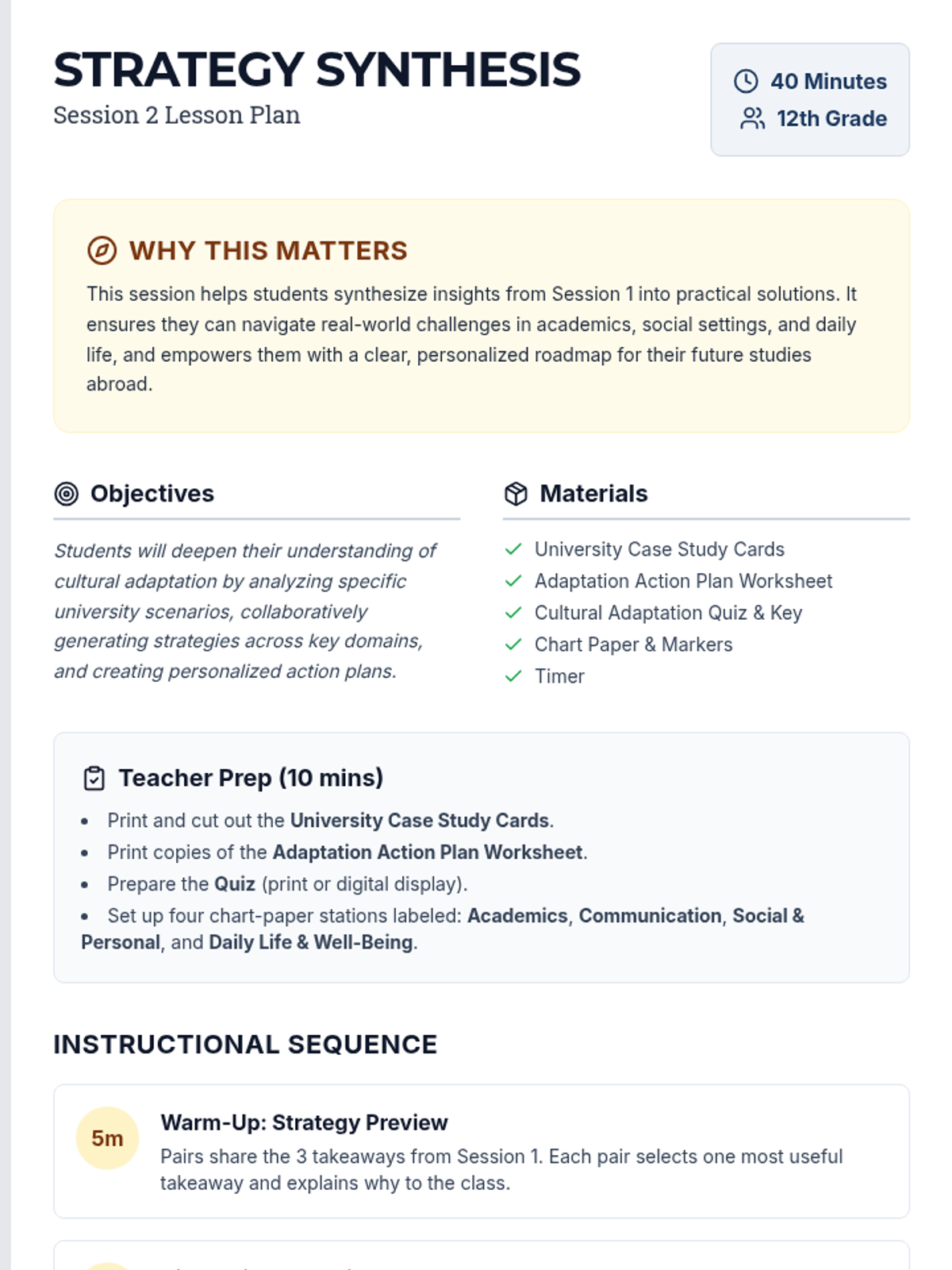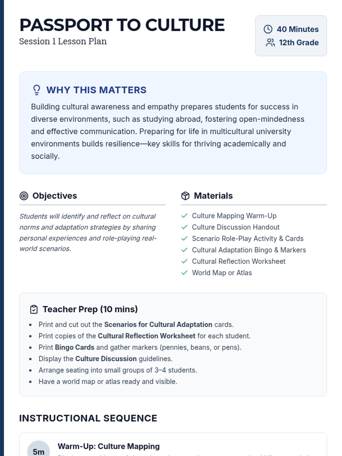 A 2-session sequence designed for 12th graders preparing for international studies, focusing on cultural awareness, adaptation strategies, and building resilience in multicultural university environments.