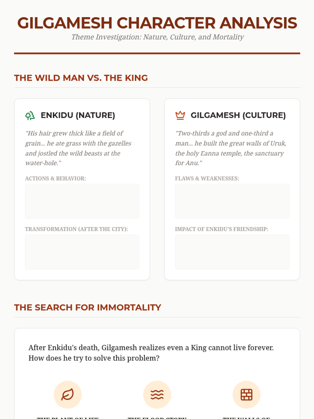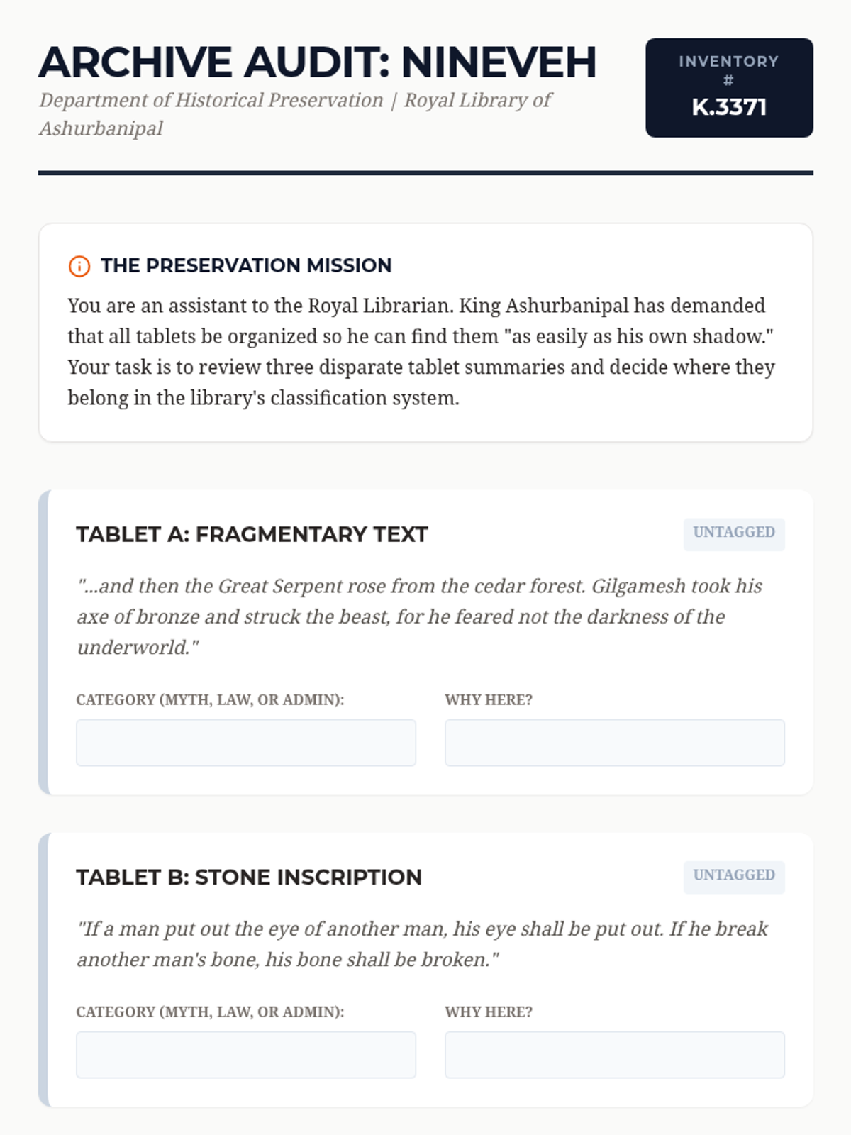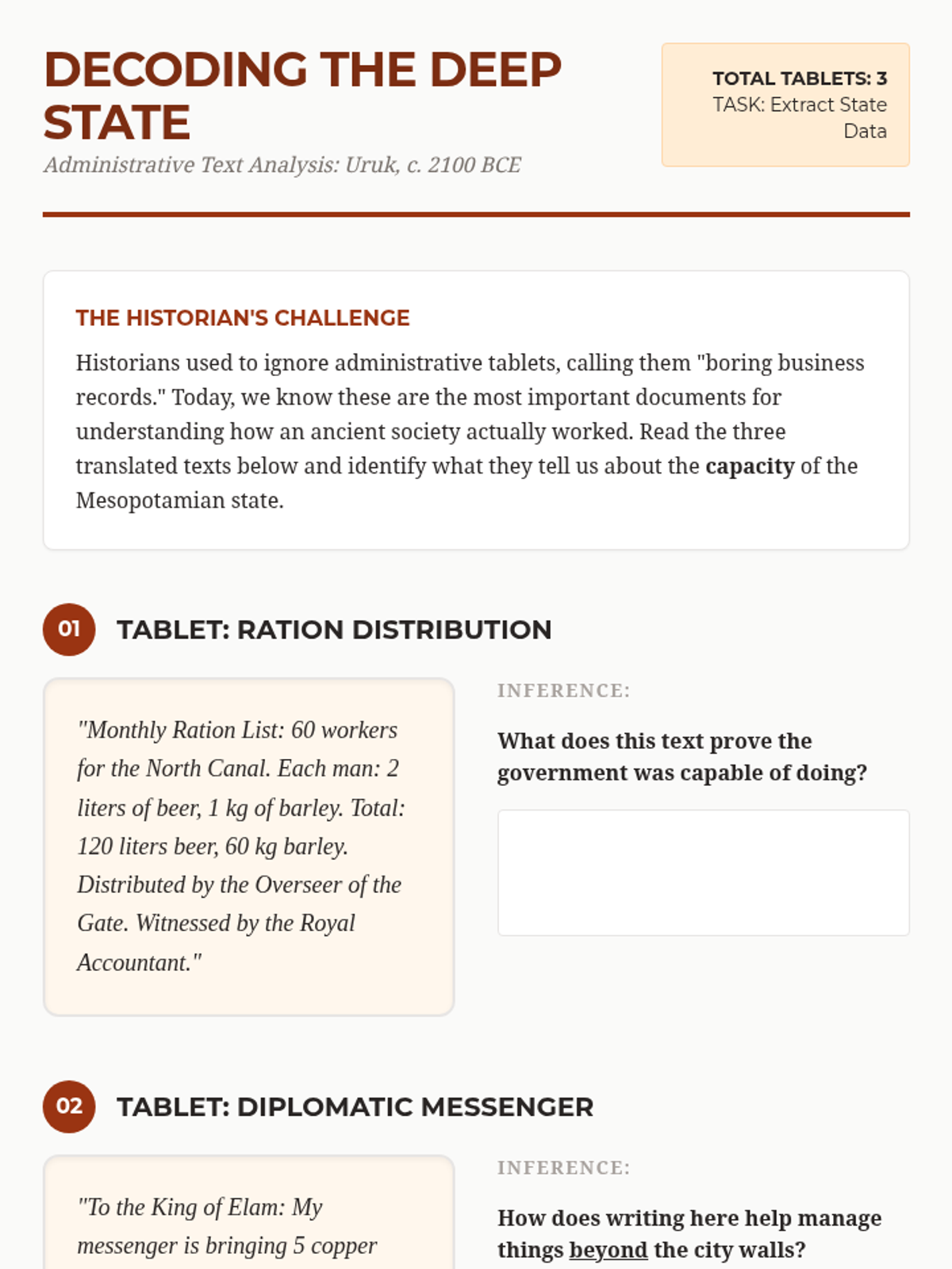 This skill-building sequence focuses on the cognitive revolution sparked by the invention of writing in Ancient Mesopotamia. Students explore the evolution from clay tokens to cuneiform script, analyze administrative texts for their role in state capacity, and study the Epic of Gilgamesh as a foundational literary work.