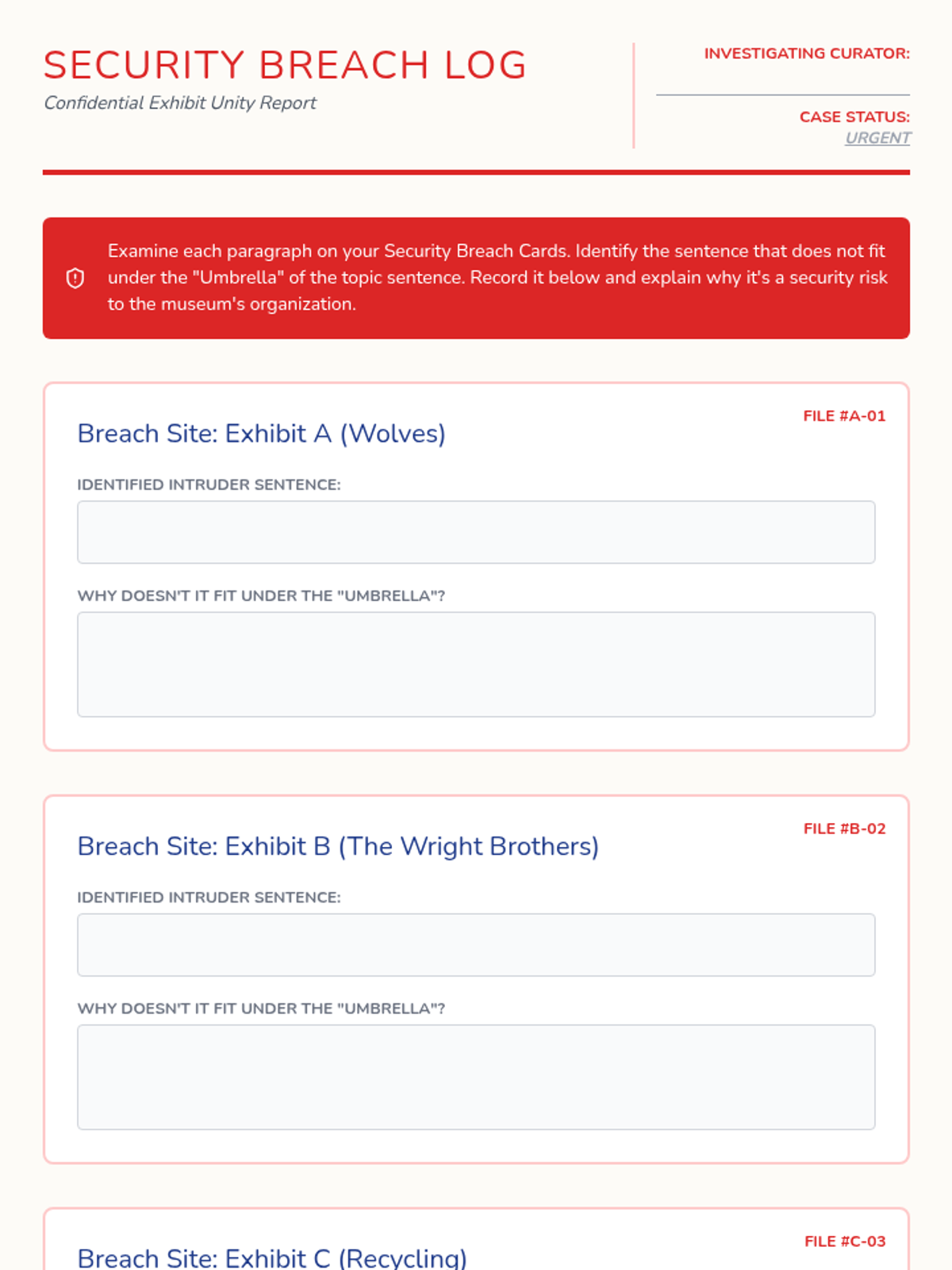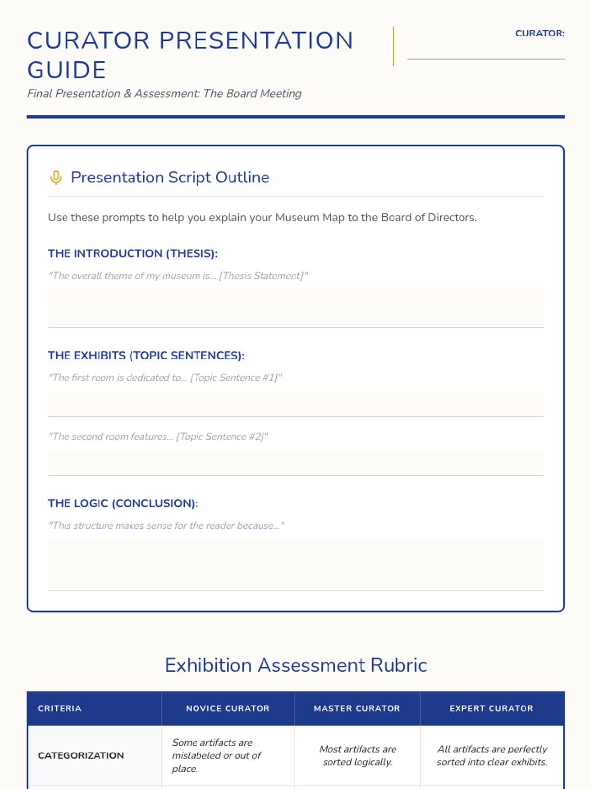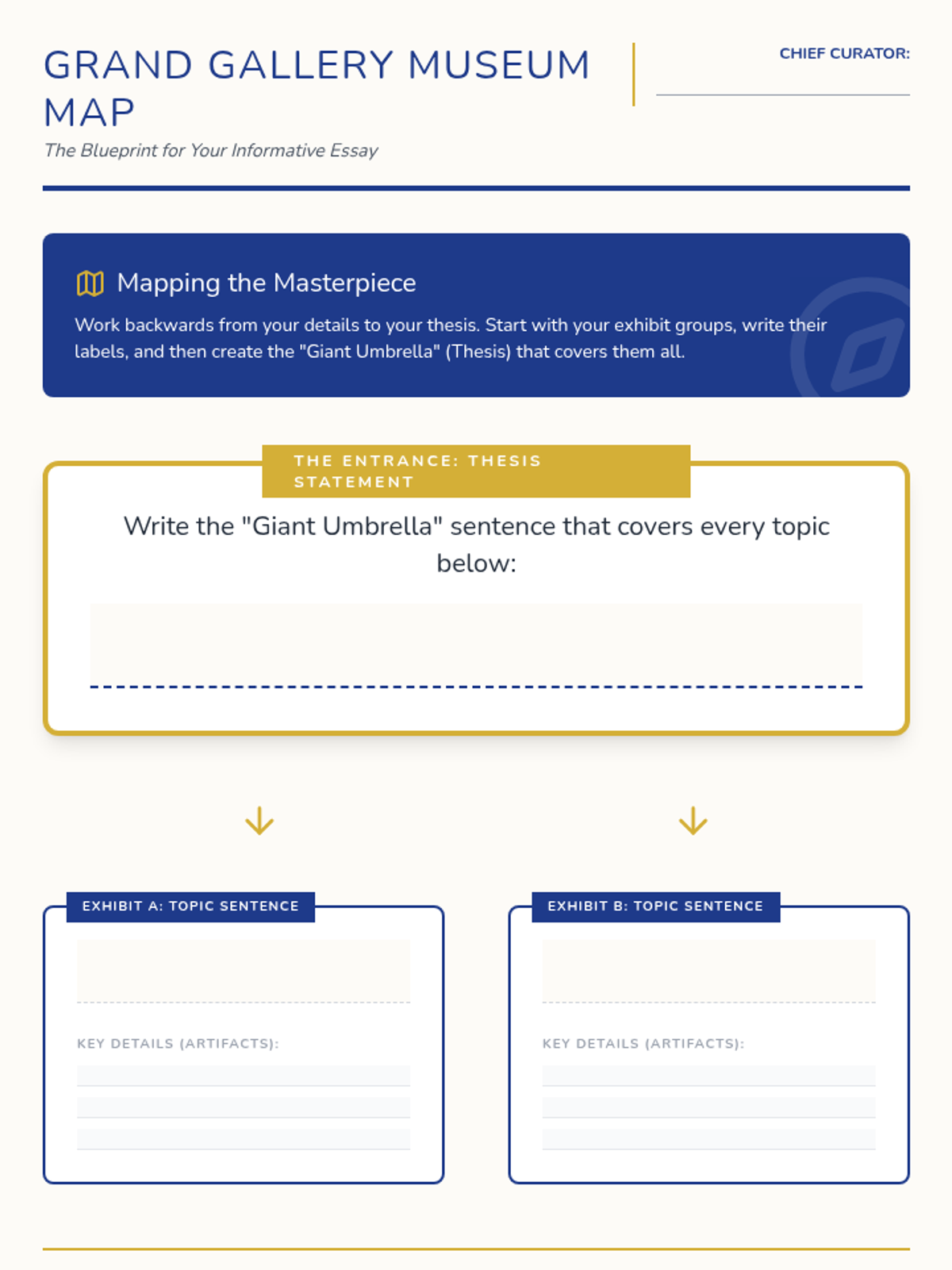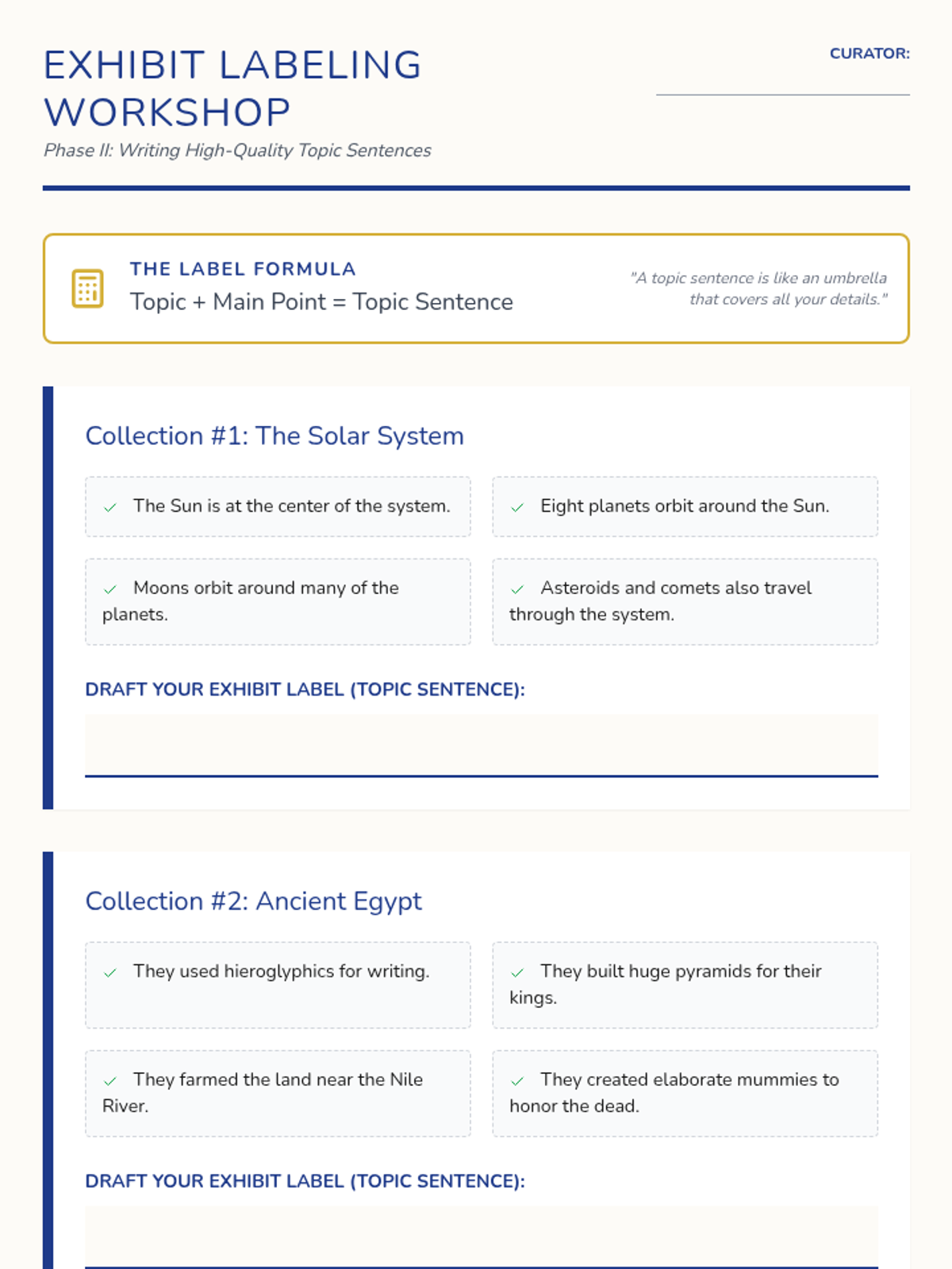 A 4th-grade writing sequence where students act as museum curators to master topic sentences and thesis statements through sorting, labeling, and organizing information.