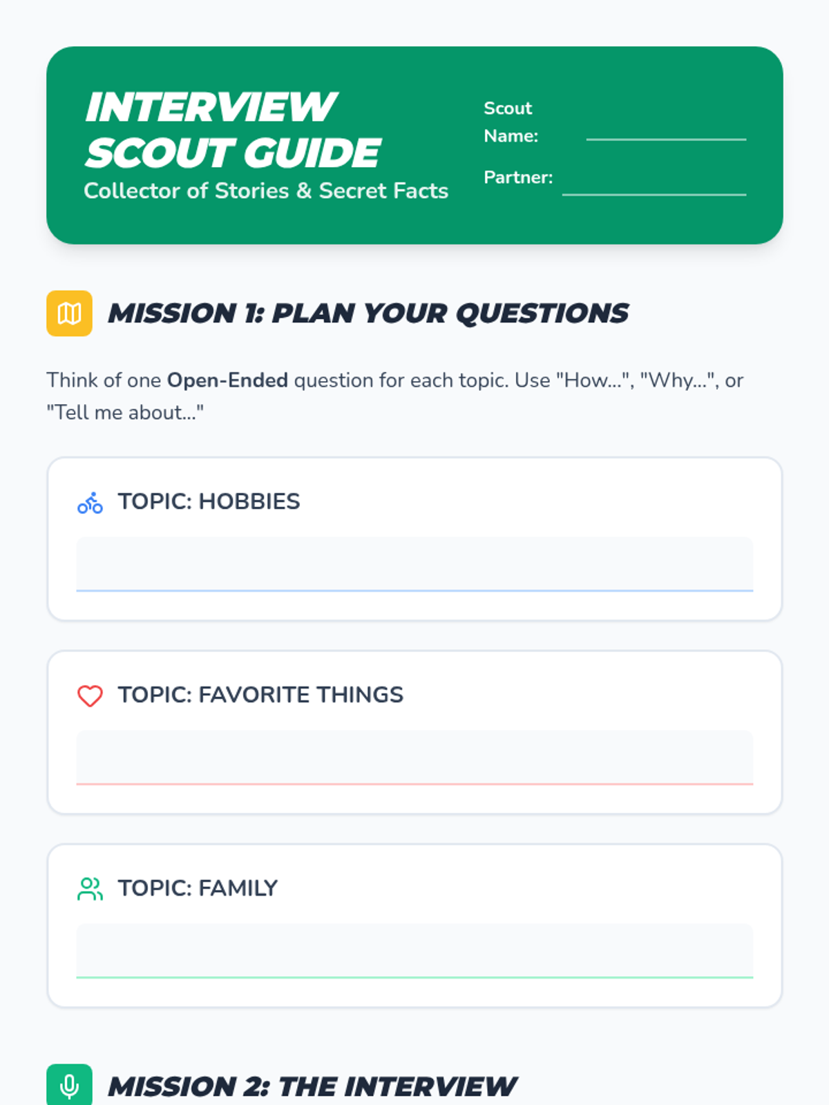 A two-part series designed for students aged 6-10 to master the art of the interview, focusing on crafting open-ended questions and practicing active listening to build connections.