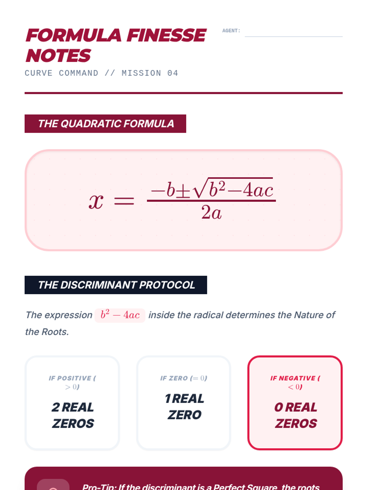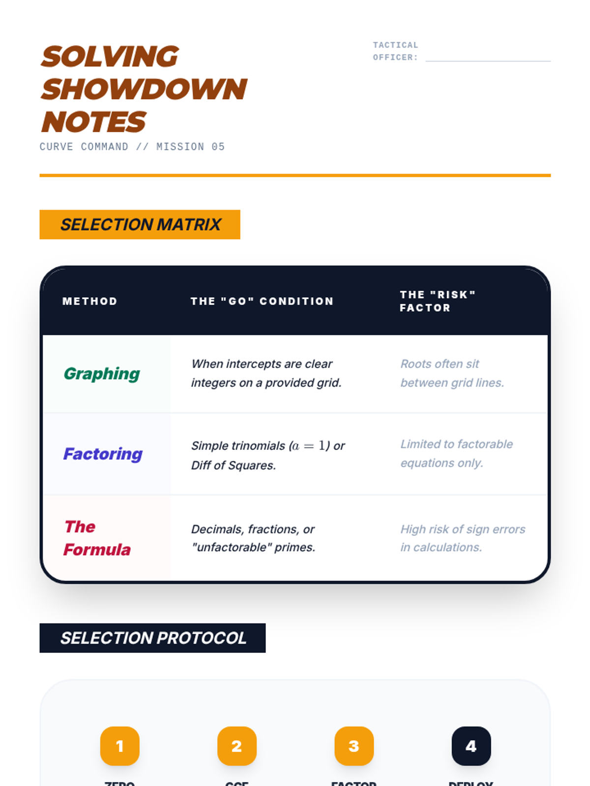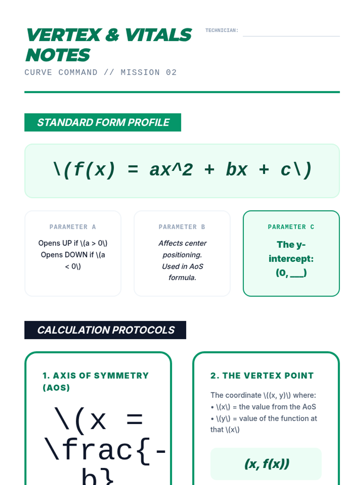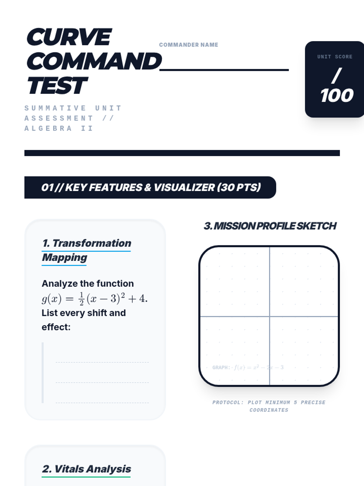 A comprehensive Algebra II unit on quadratic functions, covering parent functions, graphing, key features (vertex, intercepts, AOS), and solving via factoring and the quadratic formula, with a focus on real rational roots.