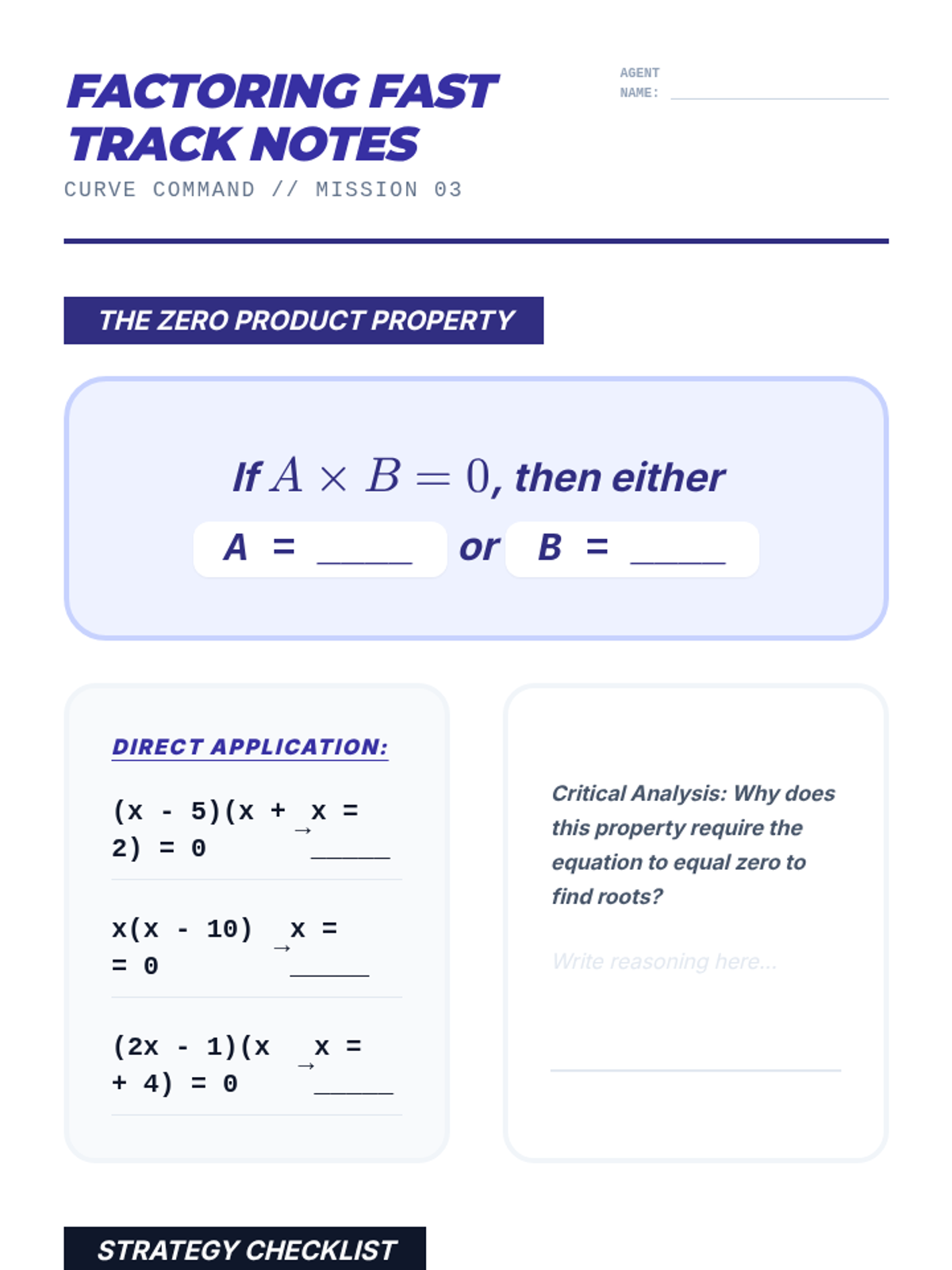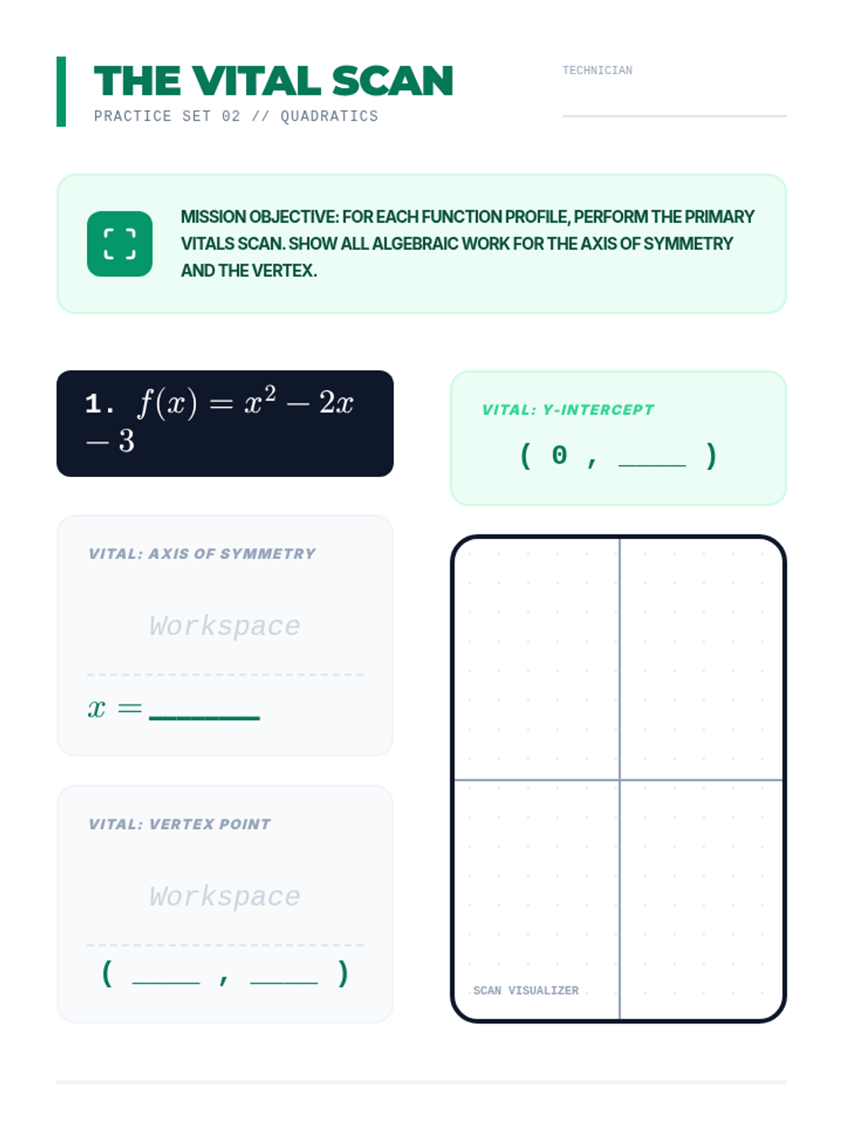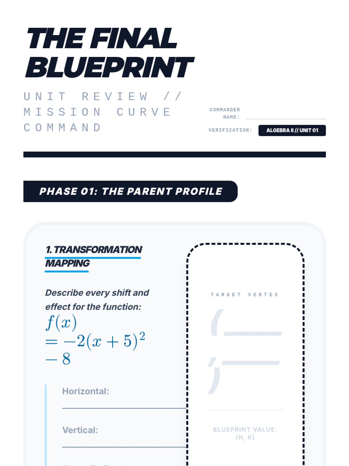 A 5-day Algebra 2 Credit Recovery unit focused on quadratic equations, covering parent functions, key features of graphs, factoring, and the quadratic formula. Designed for 40-minute class periods with a blueprint-inspired visual theme.