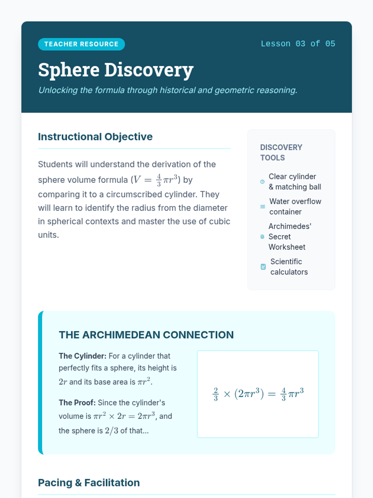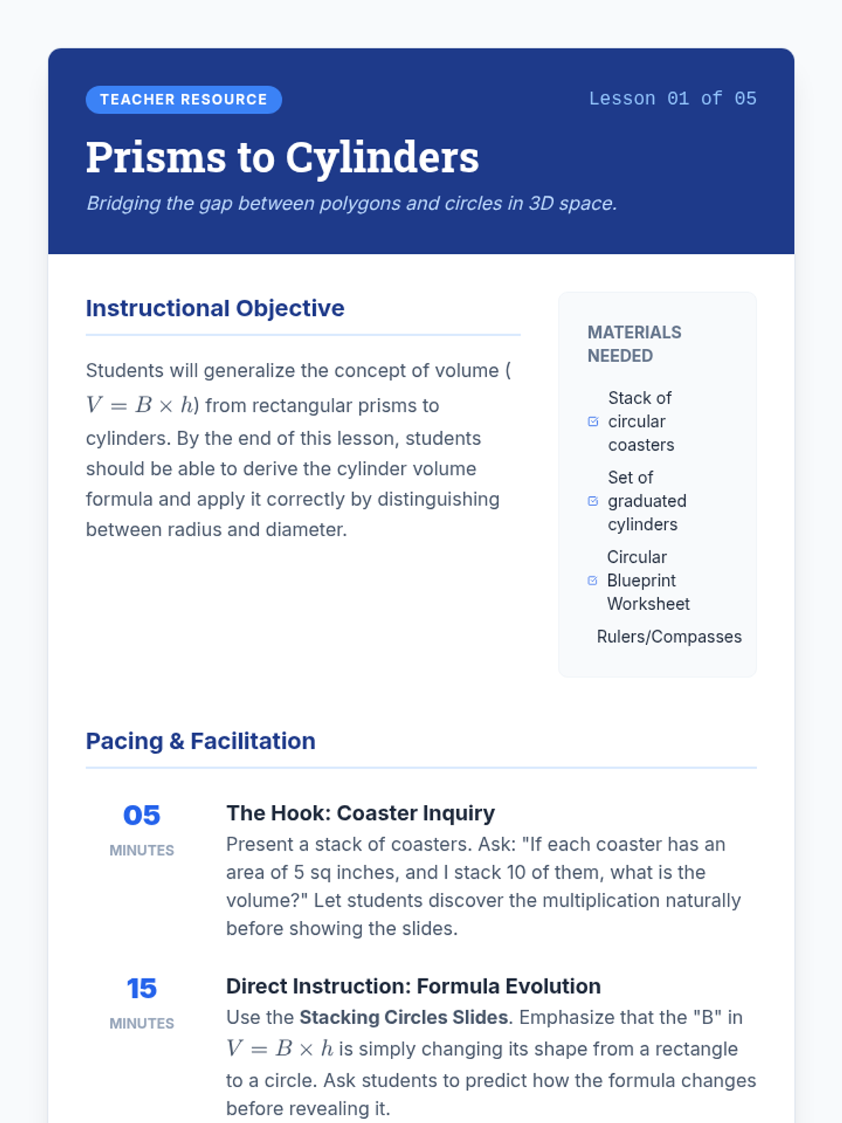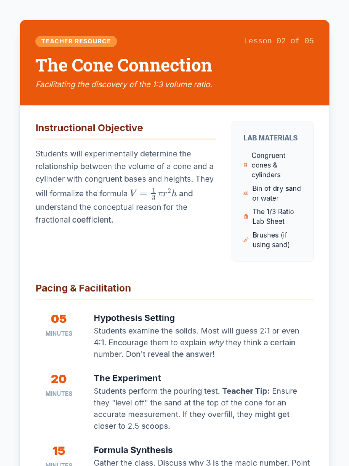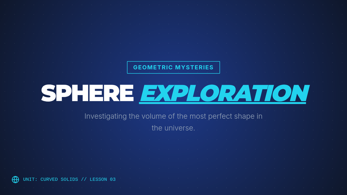 An inquiry-based 8th-grade geometry sequence exploring the derivation and application of volume formulas for cylinders, cones, and spheres. Students move from conceptual understanding to procedural mastery through hands-on labs and spatial reasoning.