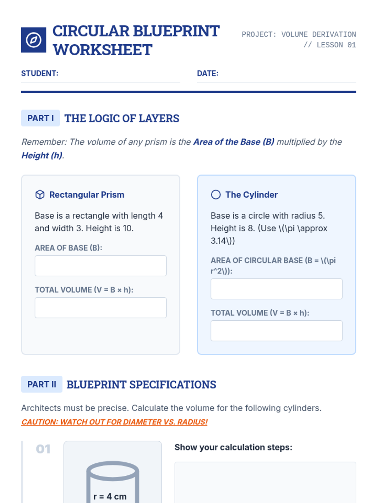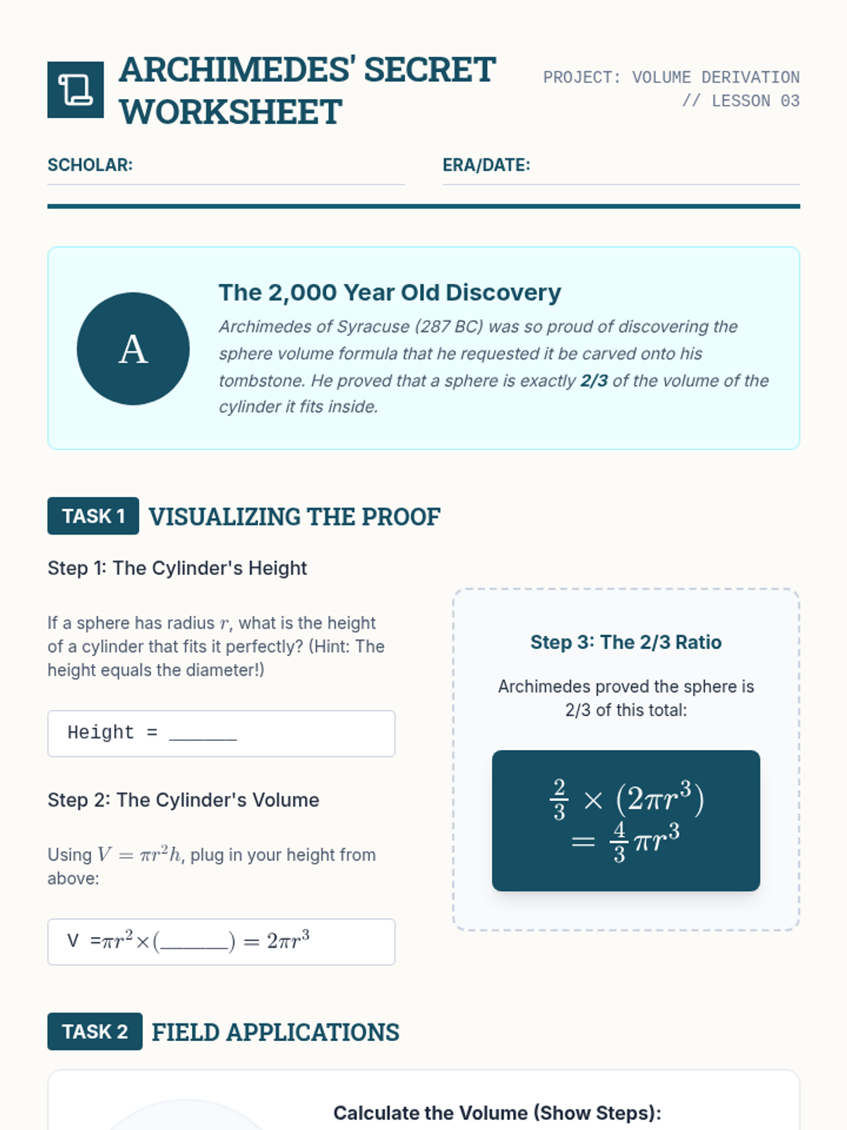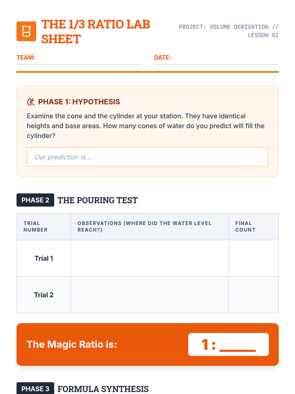 An inquiry-based 8th-grade geometry sequence exploring the derivation and application of volume formulas for cylinders, cones, and spheres. Students move from conceptual understanding to procedural mastery through hands-on labs and spatial reasoning.