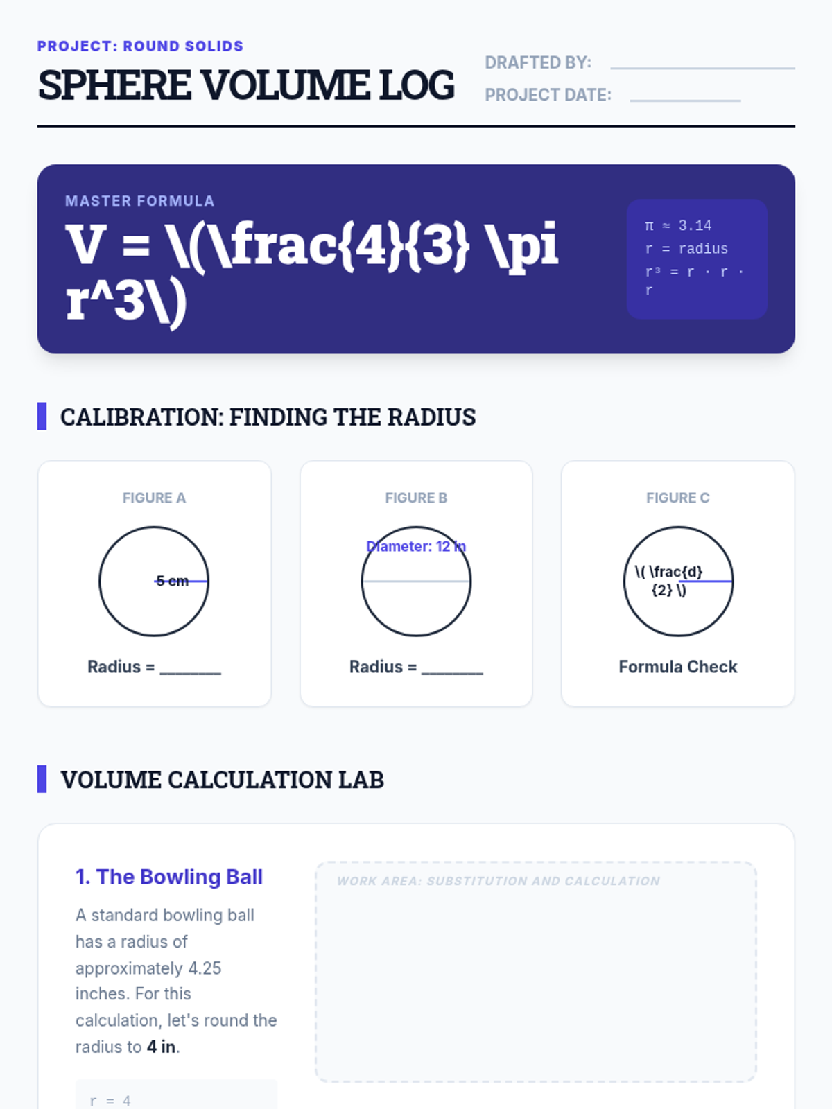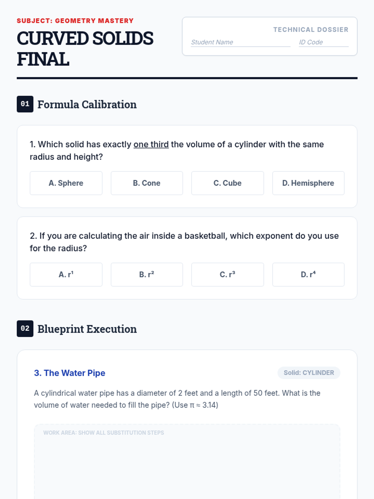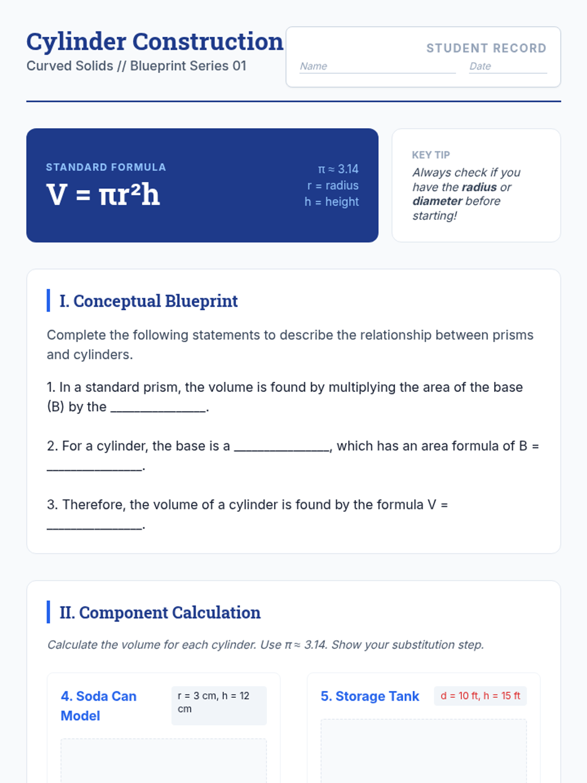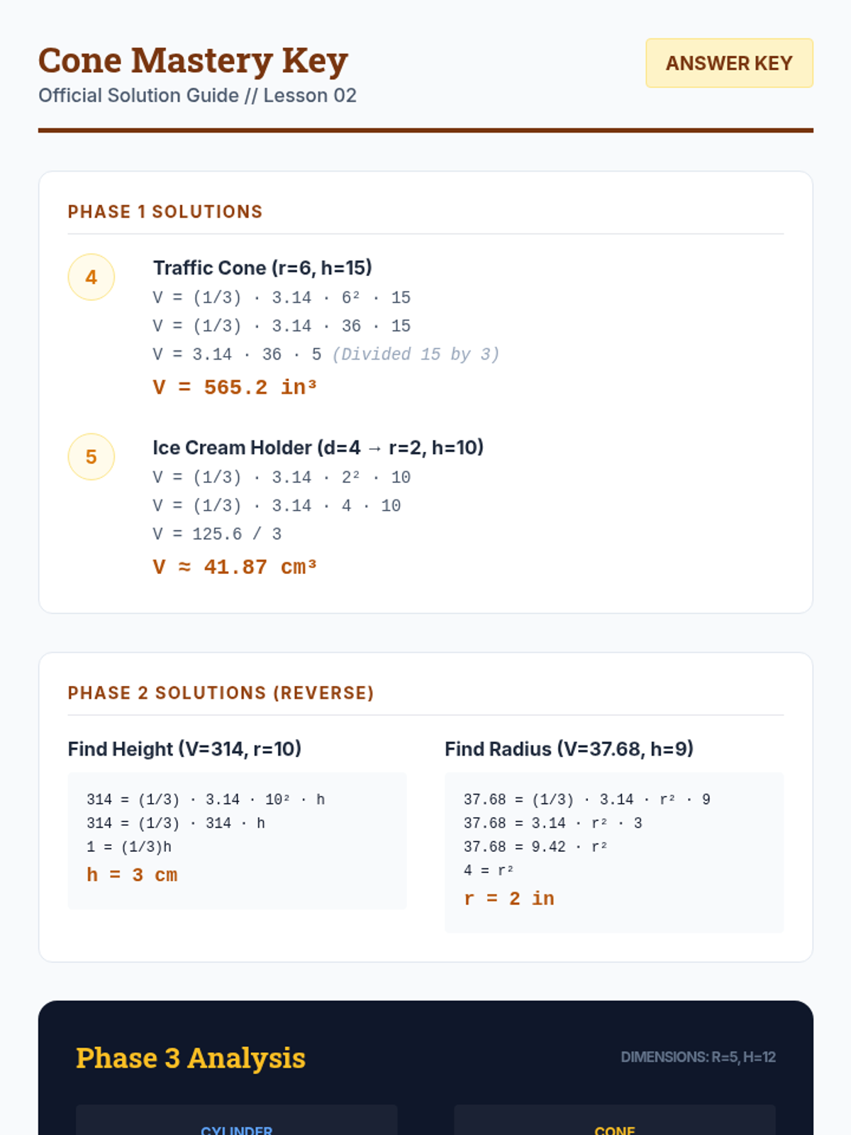 This sequence explores the volume of curved 3D solids, transitioning from polygonal prisms to cylinders, then investigating the proportional relationships between cylinders, cones, and spheres. Students apply these formulas to solve real-world problems involving capacity and missing dimensions.