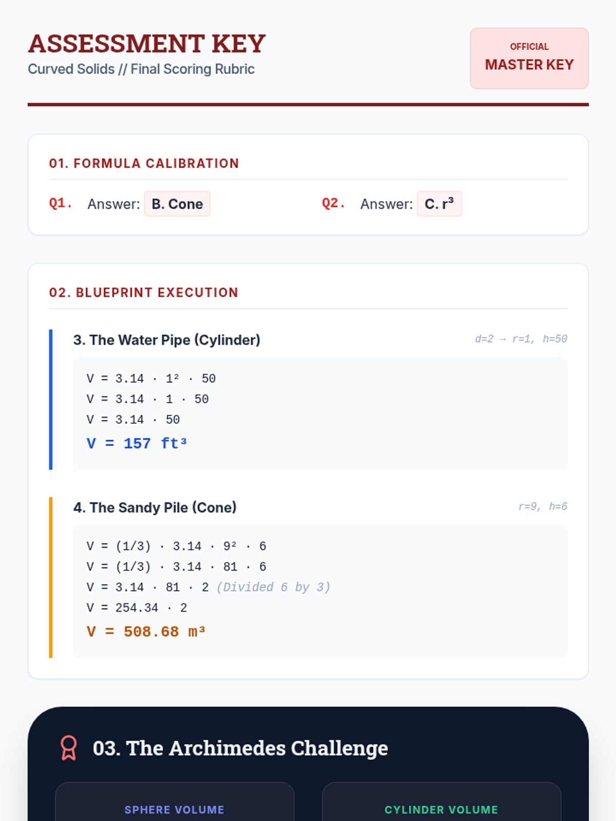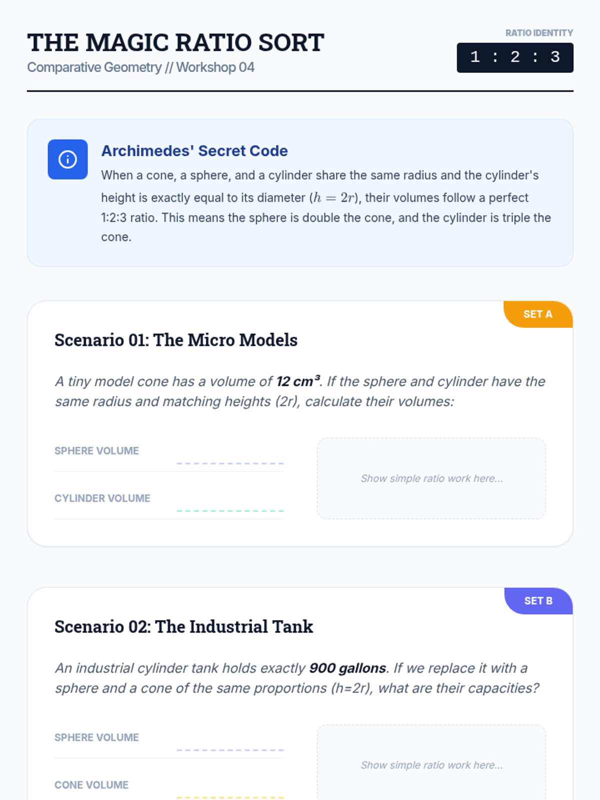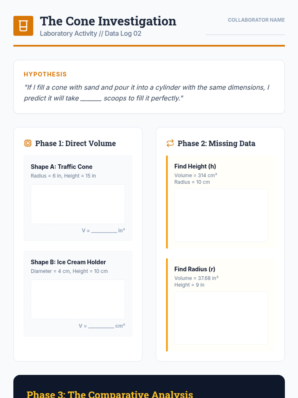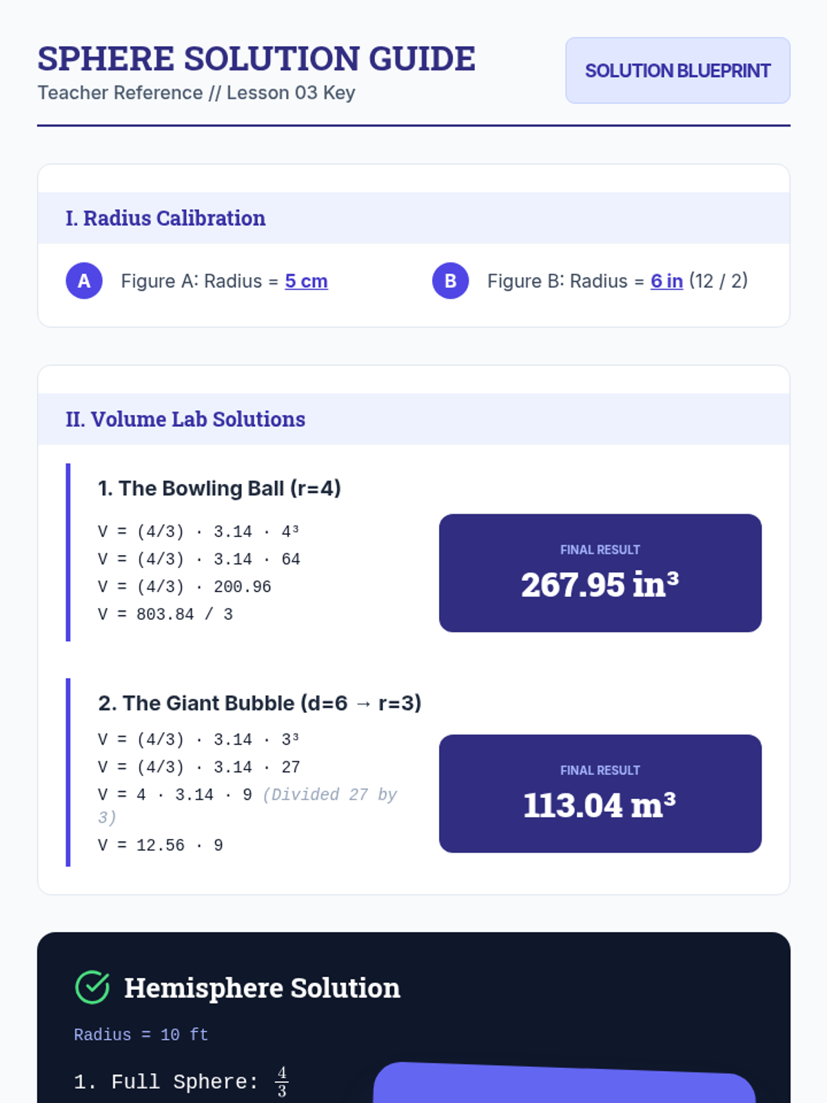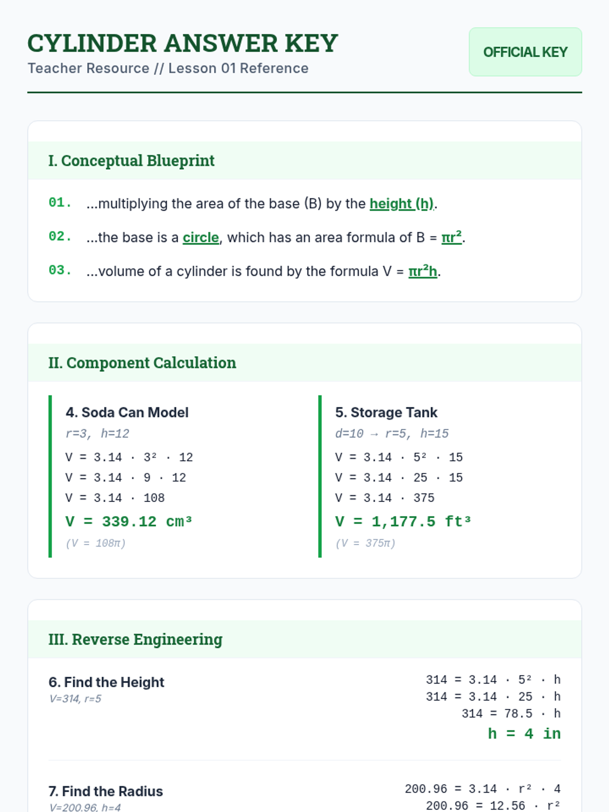 This sequence explores the volume of curved 3D solids, transitioning from polygonal prisms to cylinders, then investigating the proportional relationships between cylinders, cones, and spheres. Students apply these formulas to solve real-world problems involving capacity and missing dimensions.