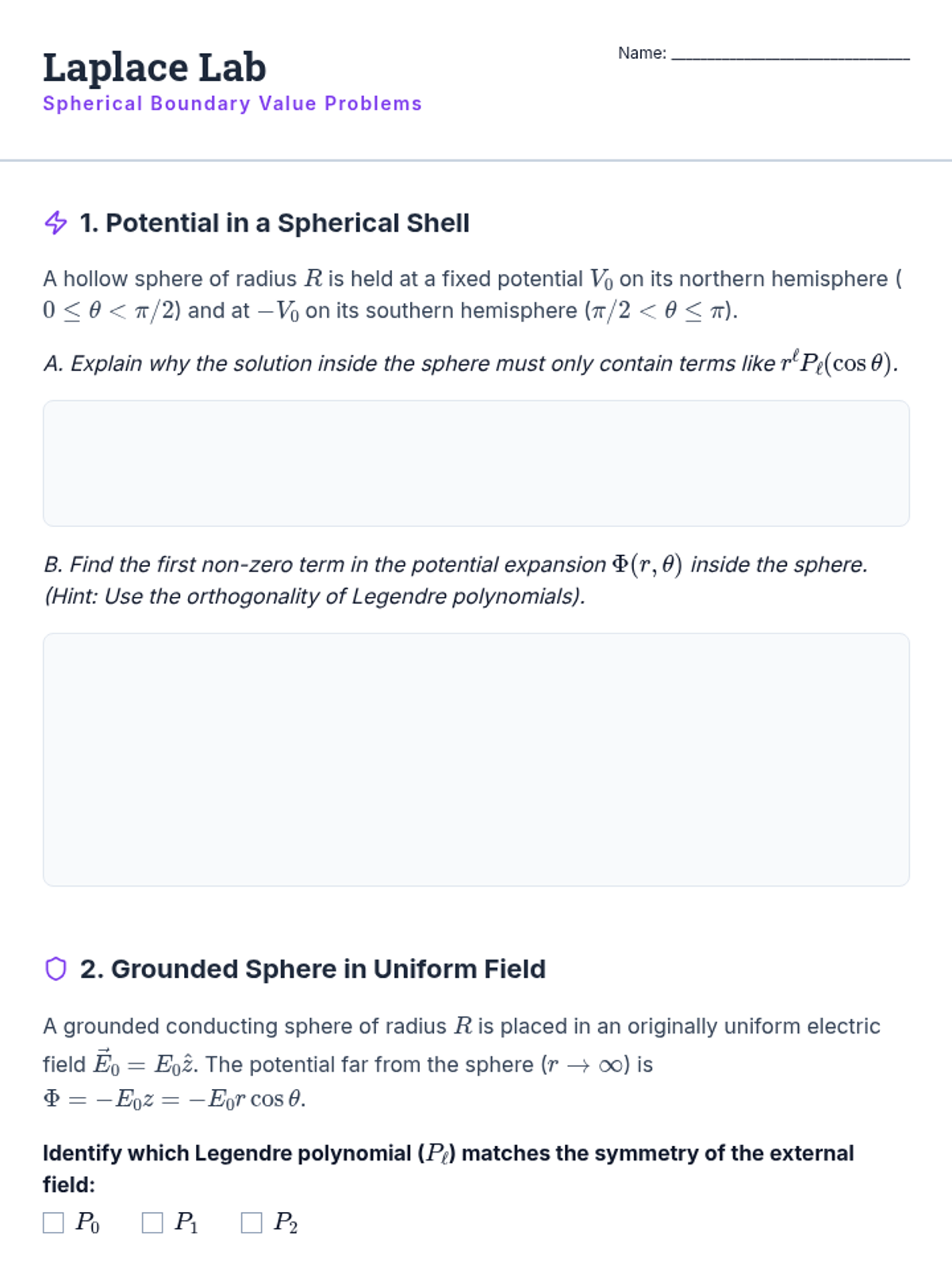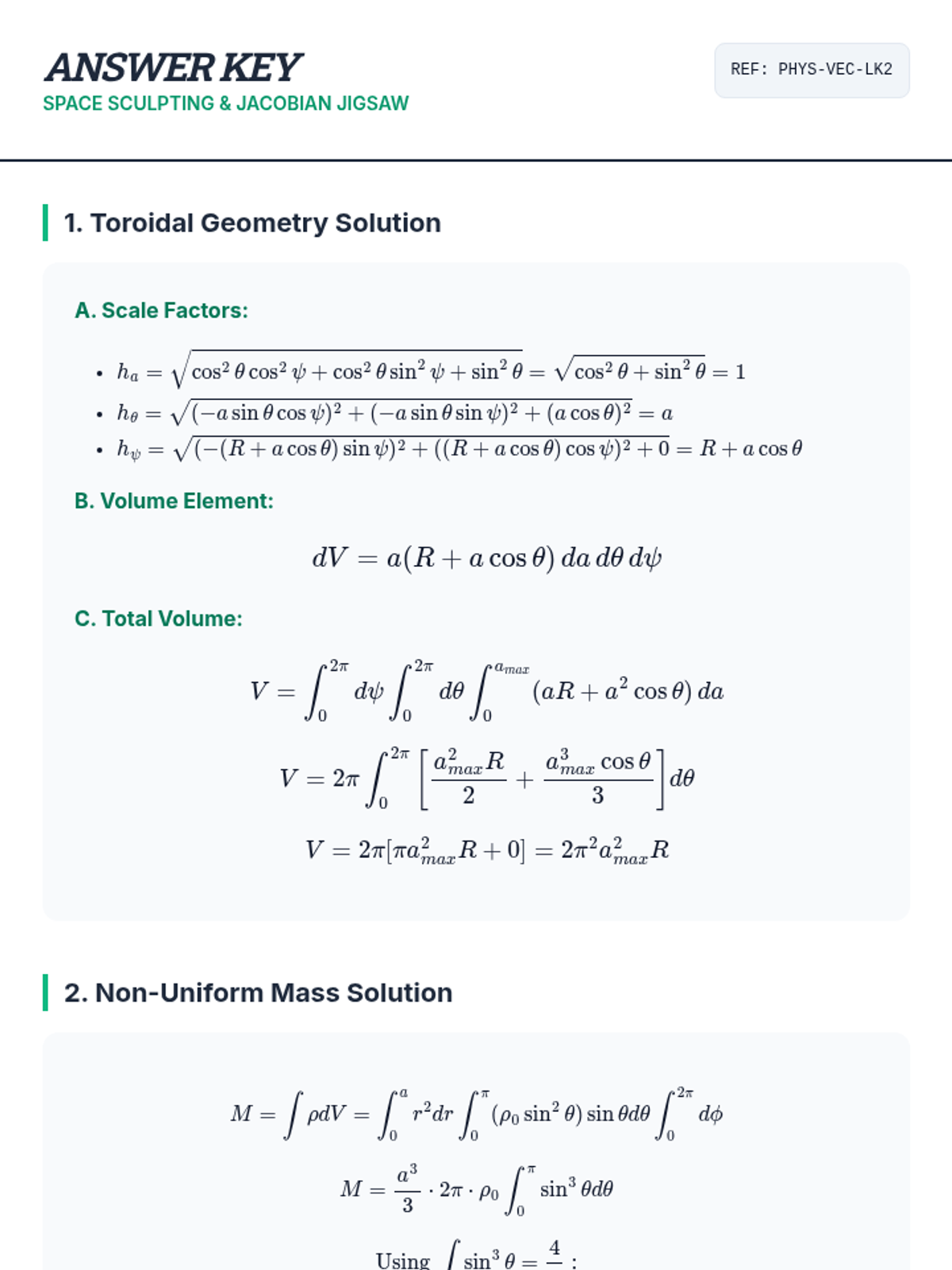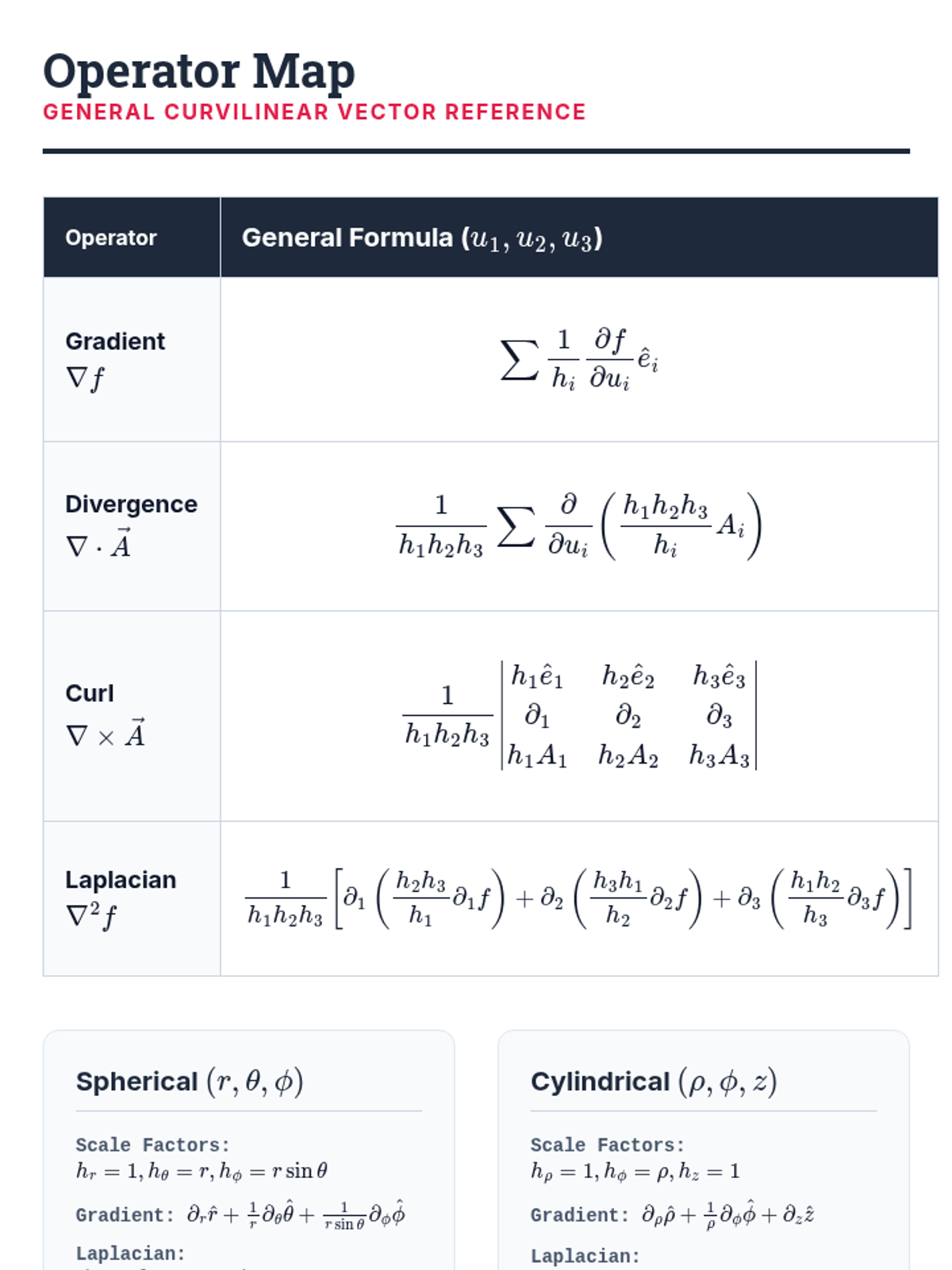 This mathematical physics sequence explores the coordinate systems necessary for solving problems involving complex shapes, moving beyond Cartesian coordinates to General Curvilinear systems. Students derive scale factors, volume elements, and differential operators, culminating in solving Laplace's equation and understanding metric tensors.