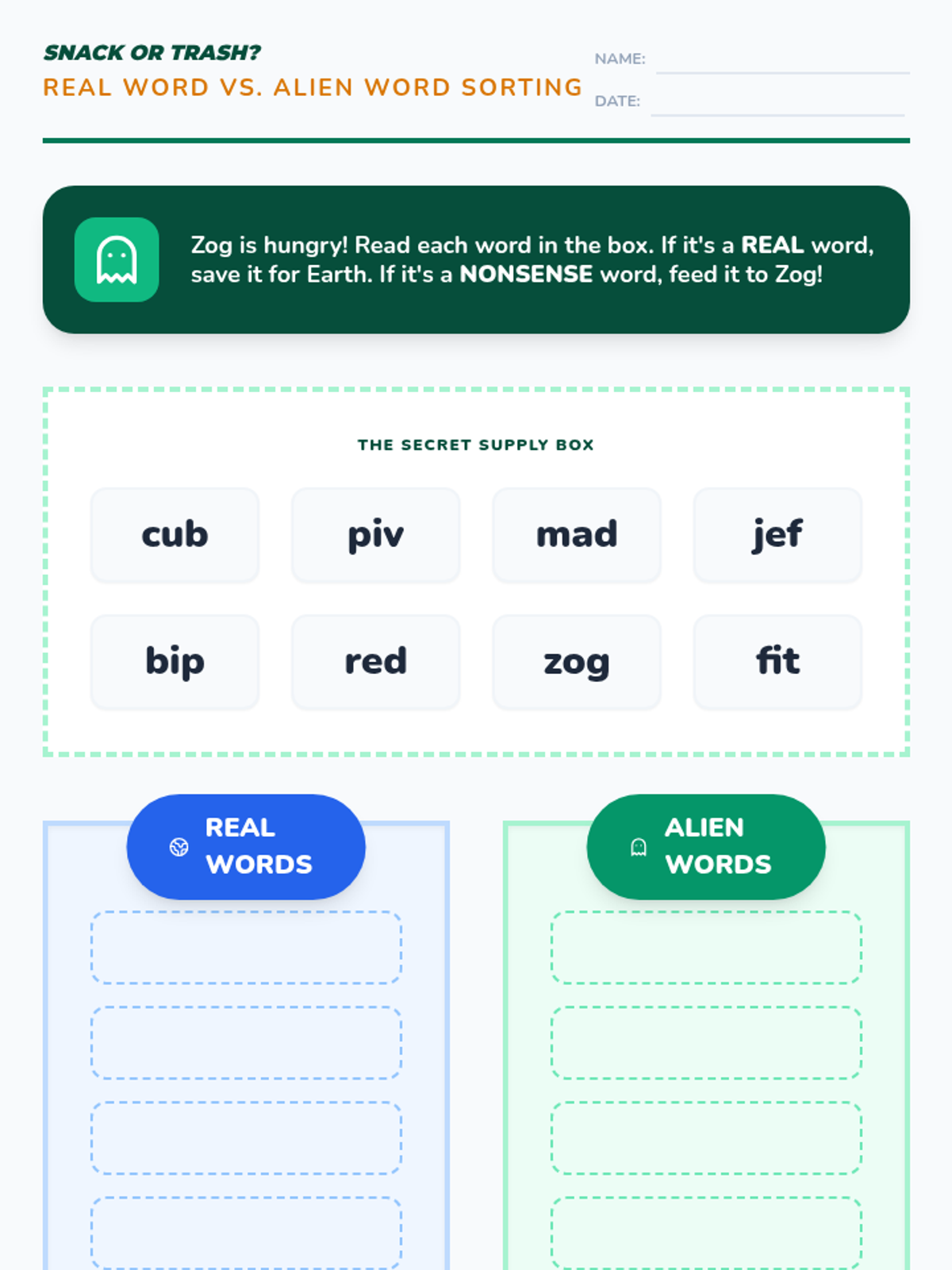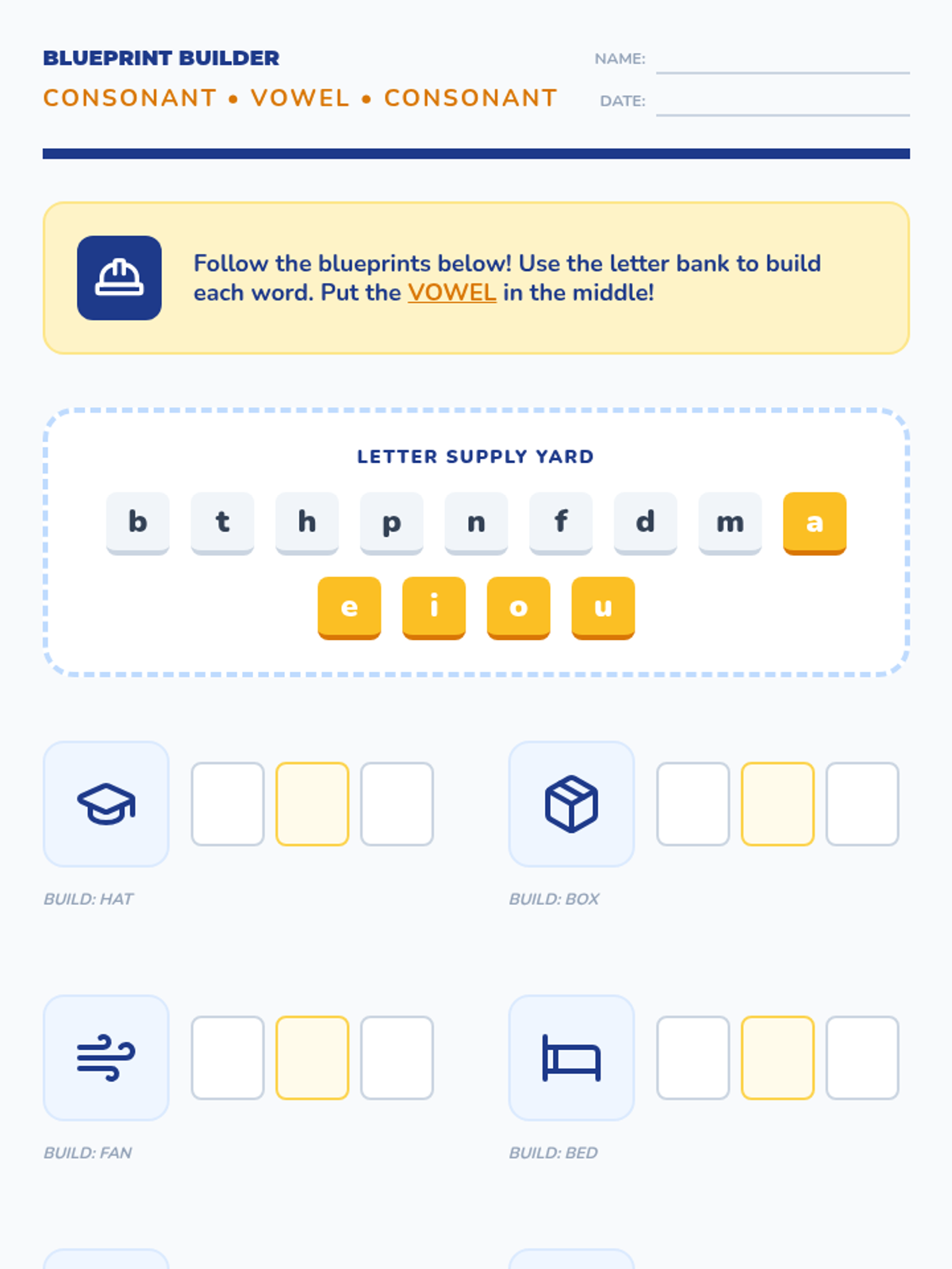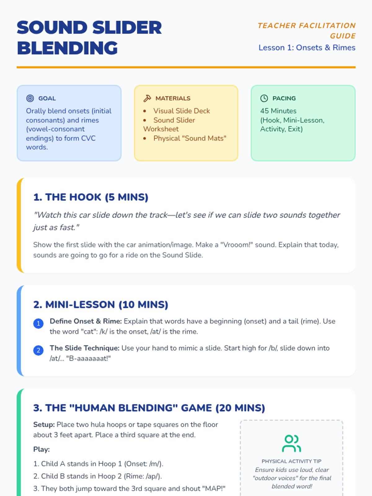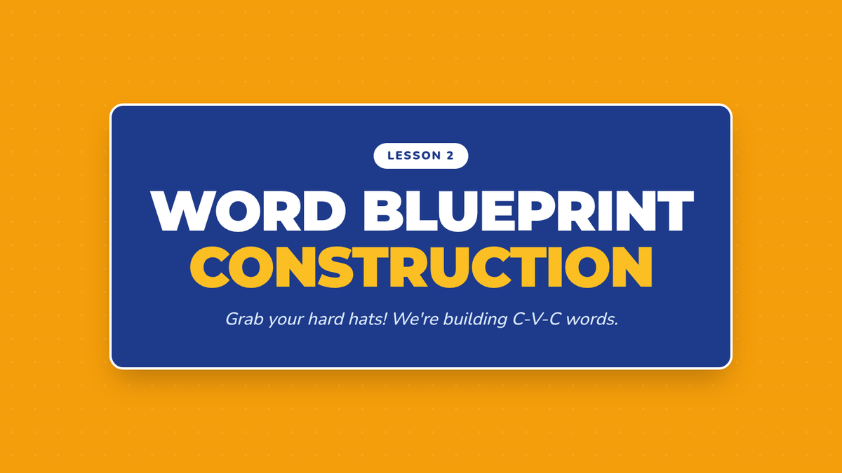A game-based sequence designed to help 1st-grade students master CVC word construction. Through physical movement, construction-themed activities, and playful 'alien' sorting, students learn to blend onsets and rimes, manipulate sounds, and achieve rapid recognition fluency.