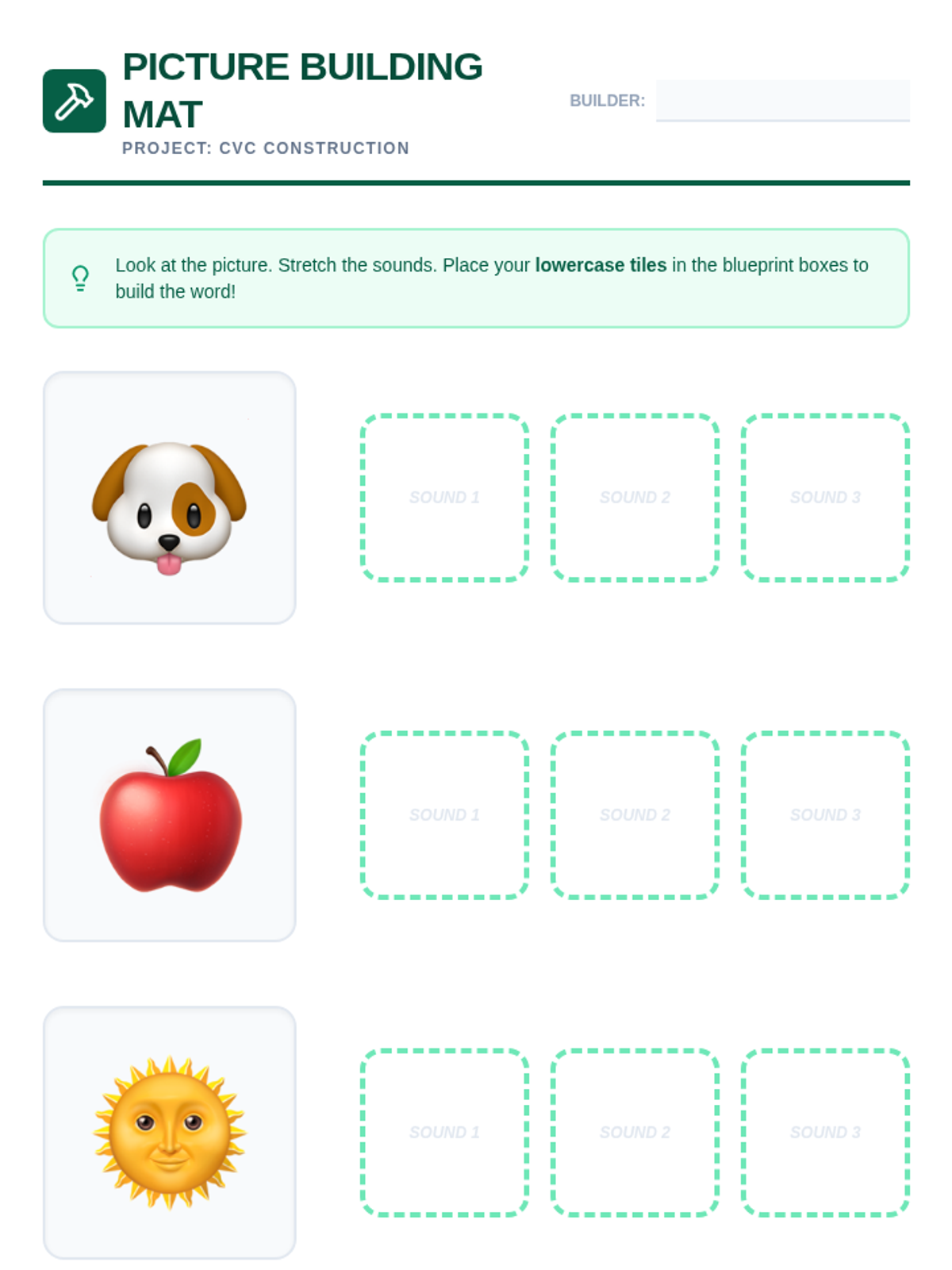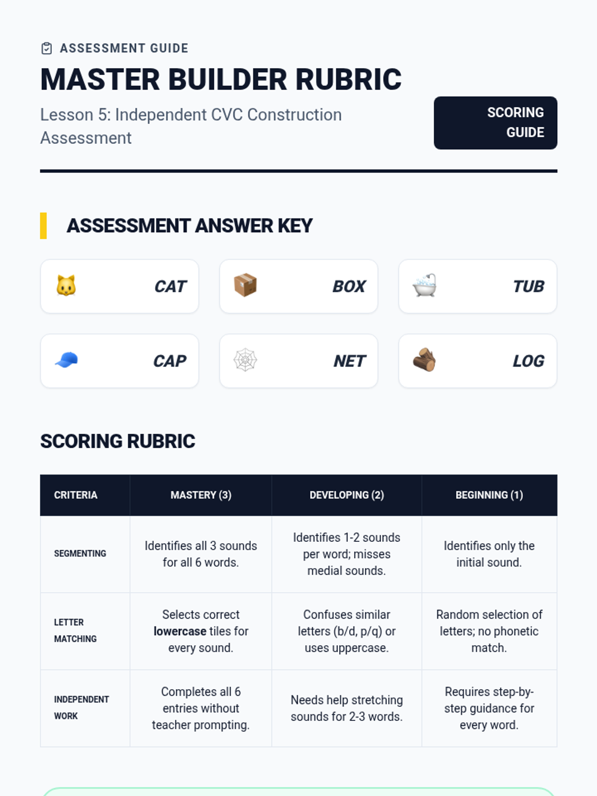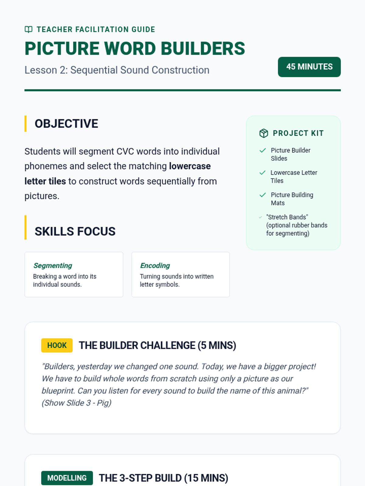 A comprehensive Kindergarten phonics sequence focusing on synthesizing lowercase letter-sounds to construct Consonant-Vowel-Consonant (CVC) words. Students progress from initial sound substitution to independent encoding through hands-on building and manipulation.