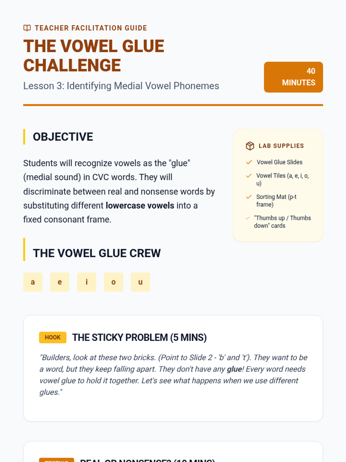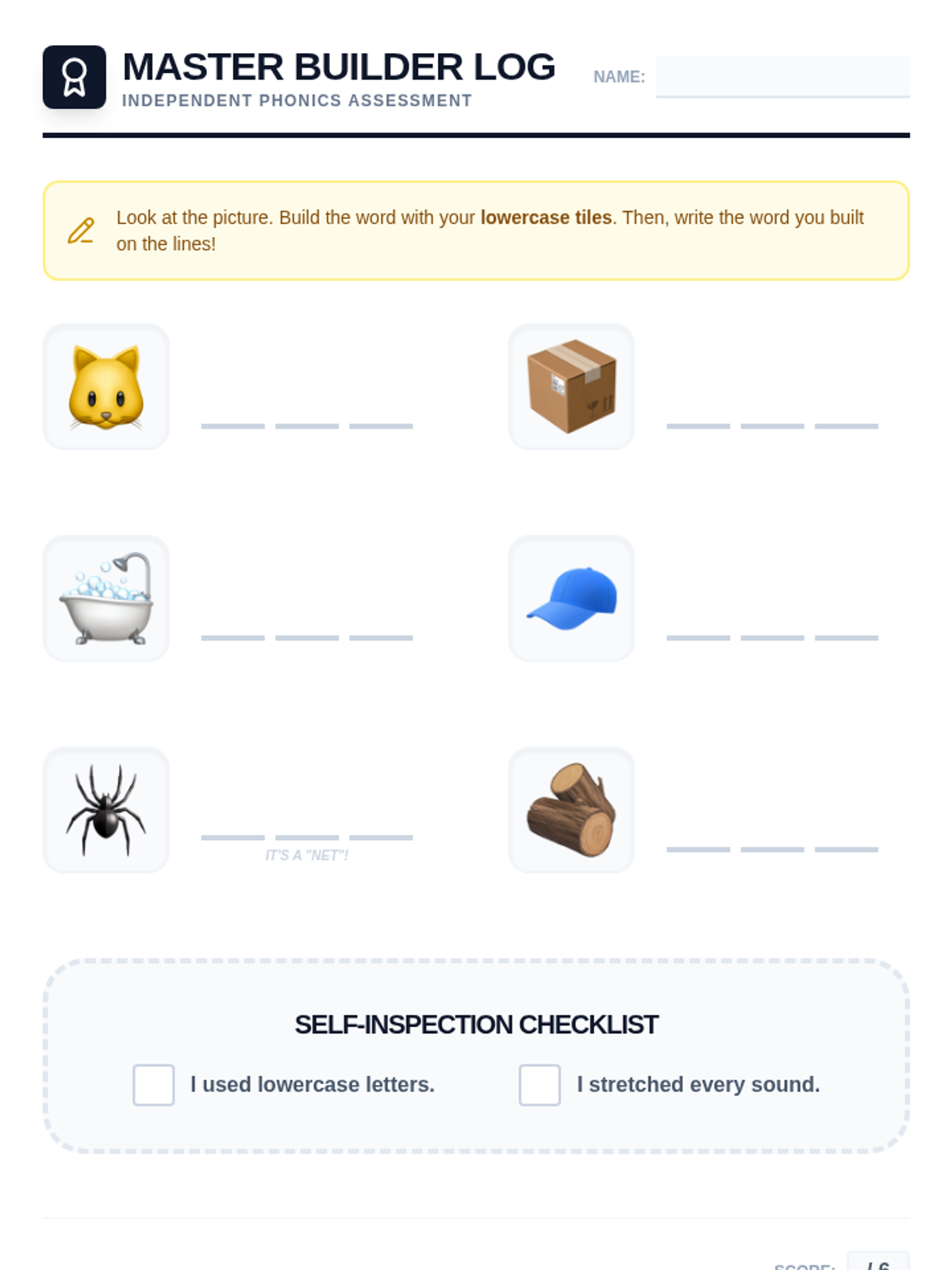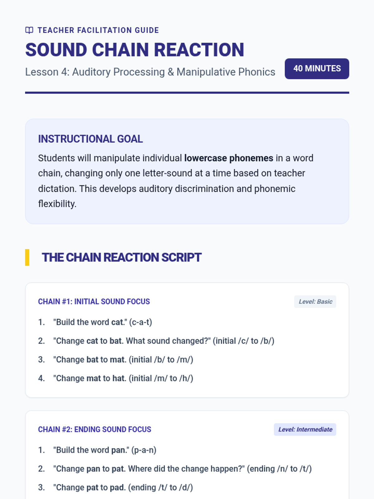 A comprehensive Kindergarten phonics sequence focusing on synthesizing lowercase letter-sounds to construct Consonant-Vowel-Consonant (CVC) words. Students progress from initial sound substitution to independent encoding through hands-on building and manipulation.