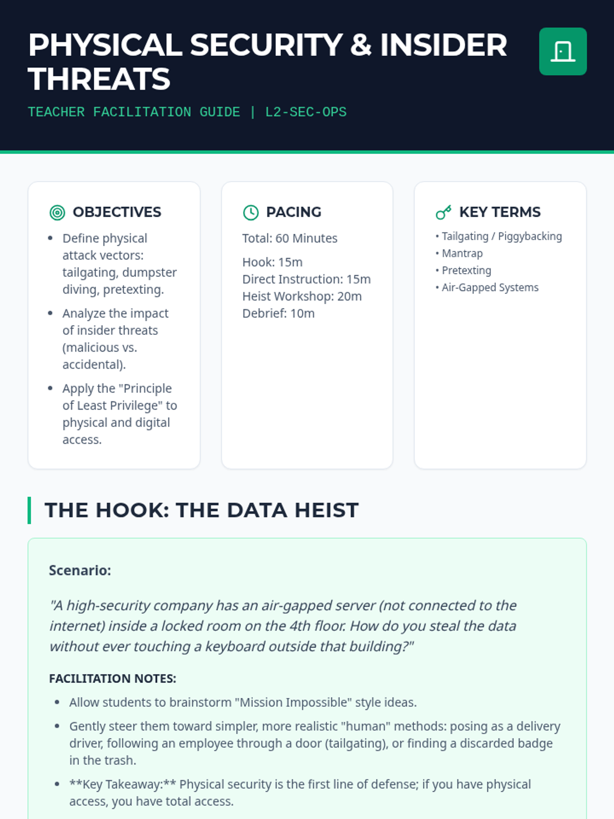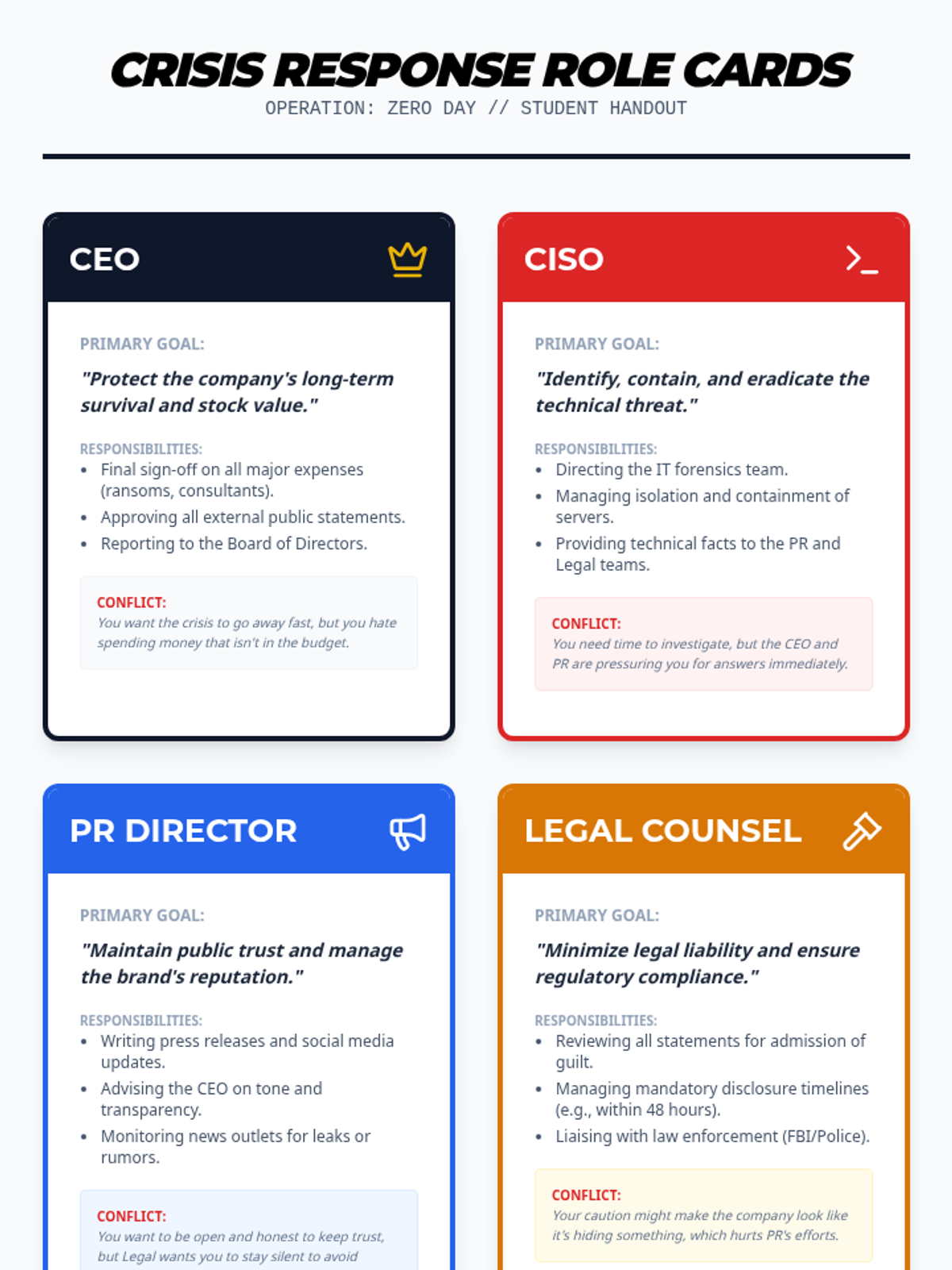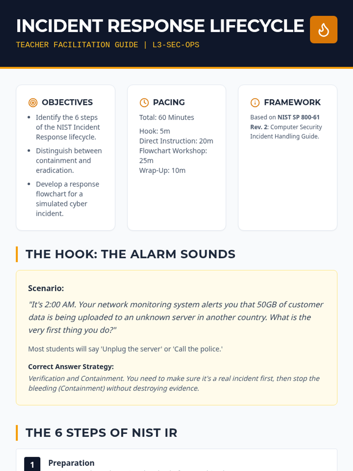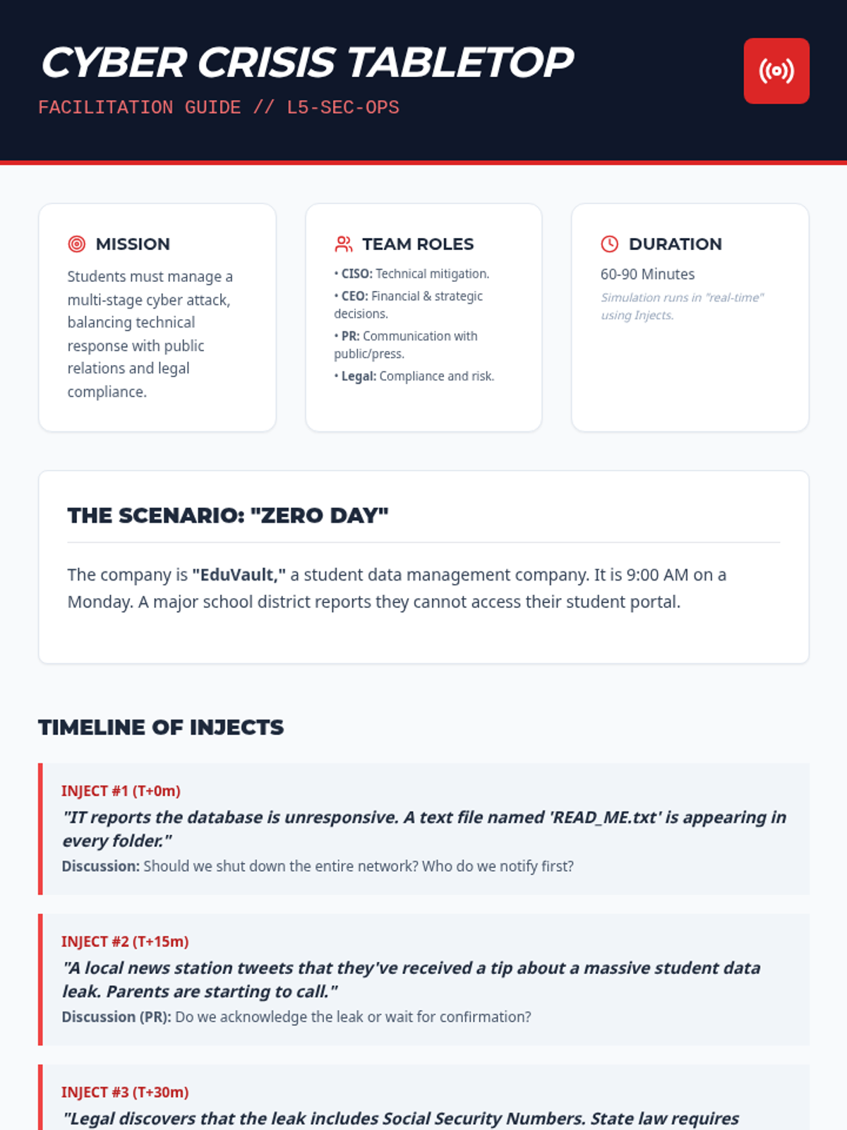 A comprehensive 12th-grade cybersecurity unit focused on the human element, social engineering tactics, and organizational resilience through incident response and disaster recovery planning. Students move from identifying personal phishing threats to managing a corporate-scale cyber crisis in a tabletop simulation.