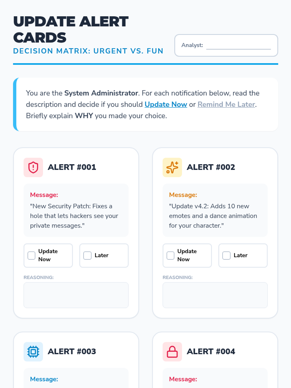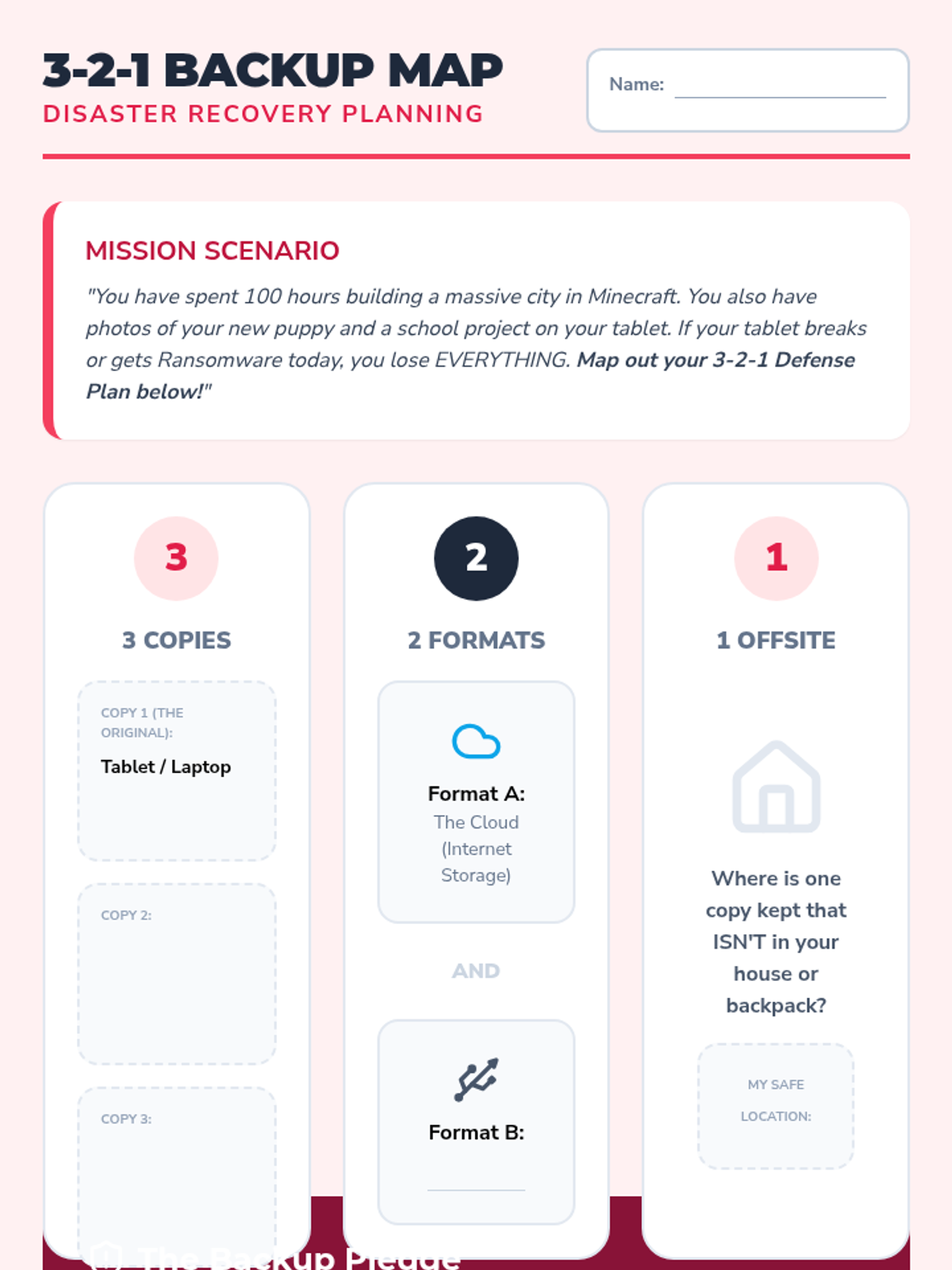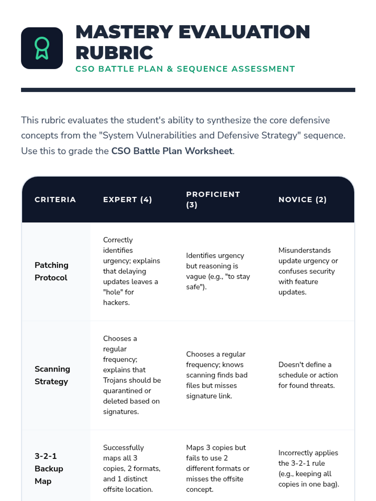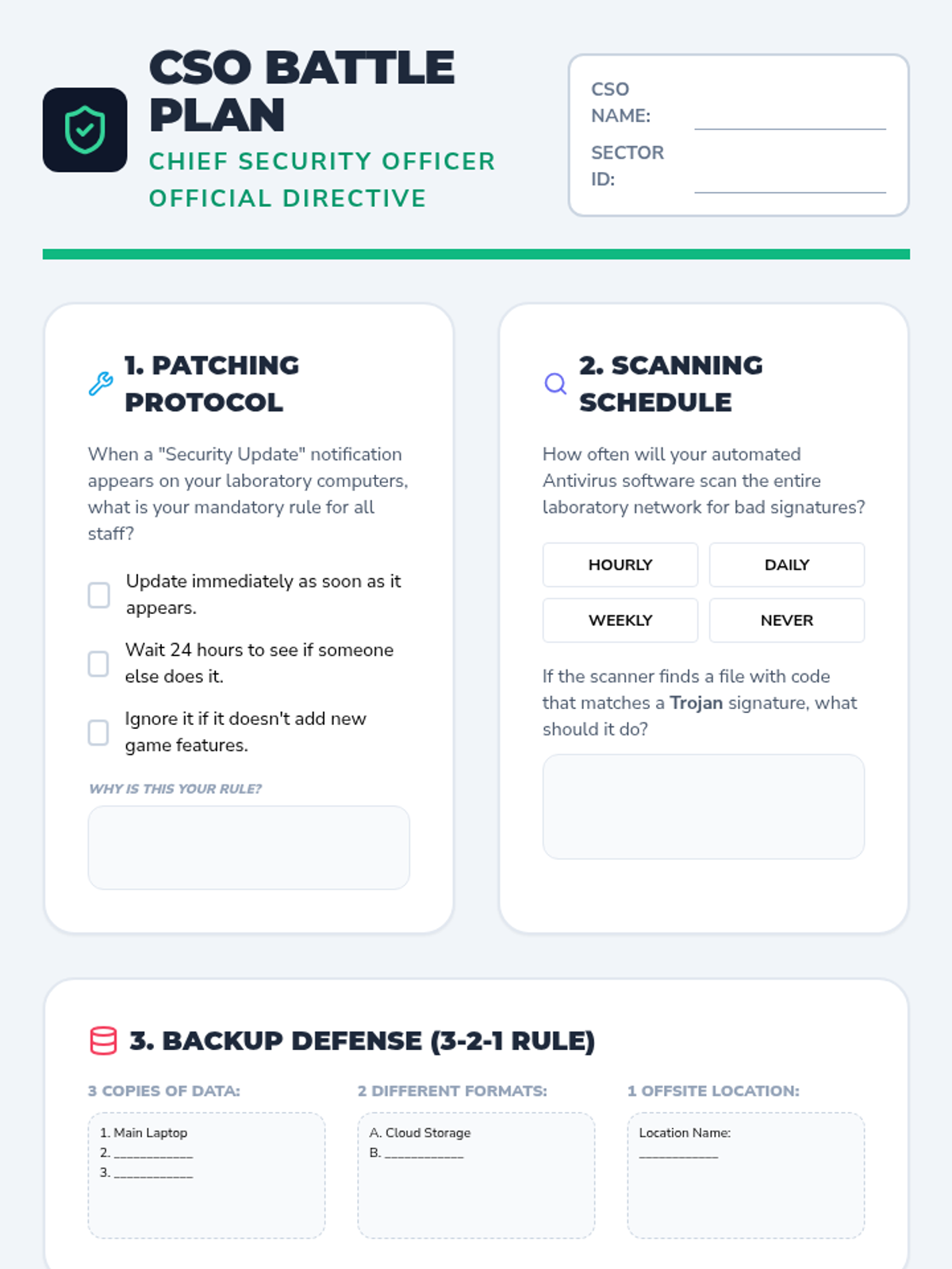 Students explore software threats and defensive strategies, culminating in the creation of a comprehensive 'Cyber Defense Plan'. Through hands-on activities like malware trading cards and backup simulations, they learn to keep digital devices healthy.