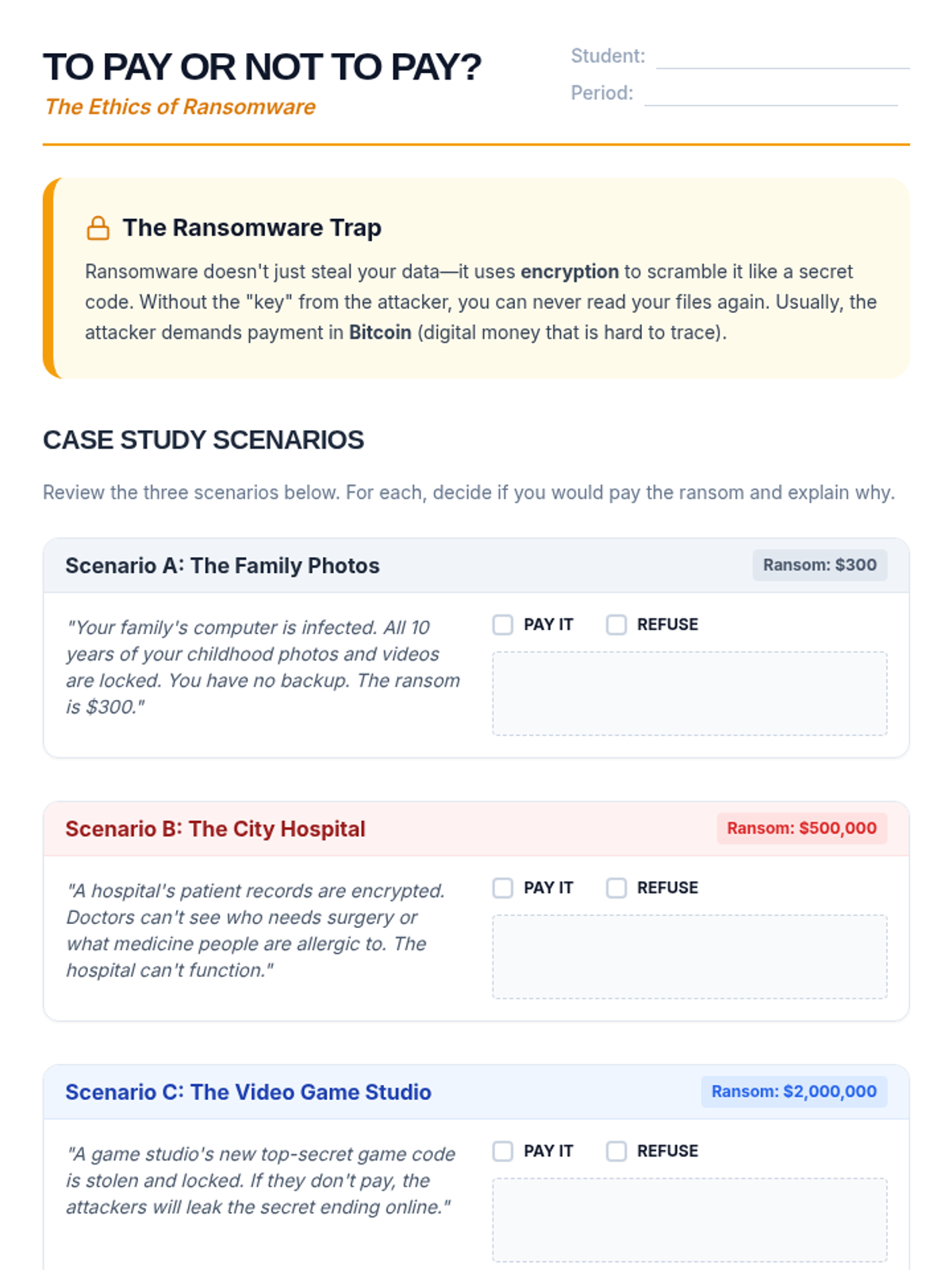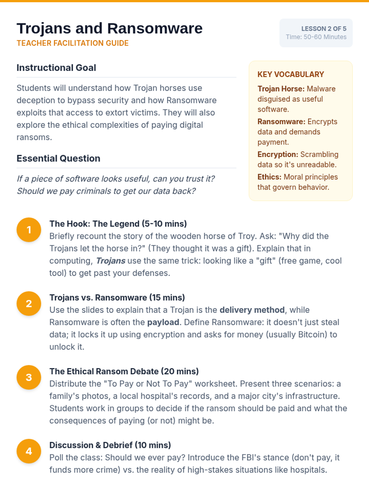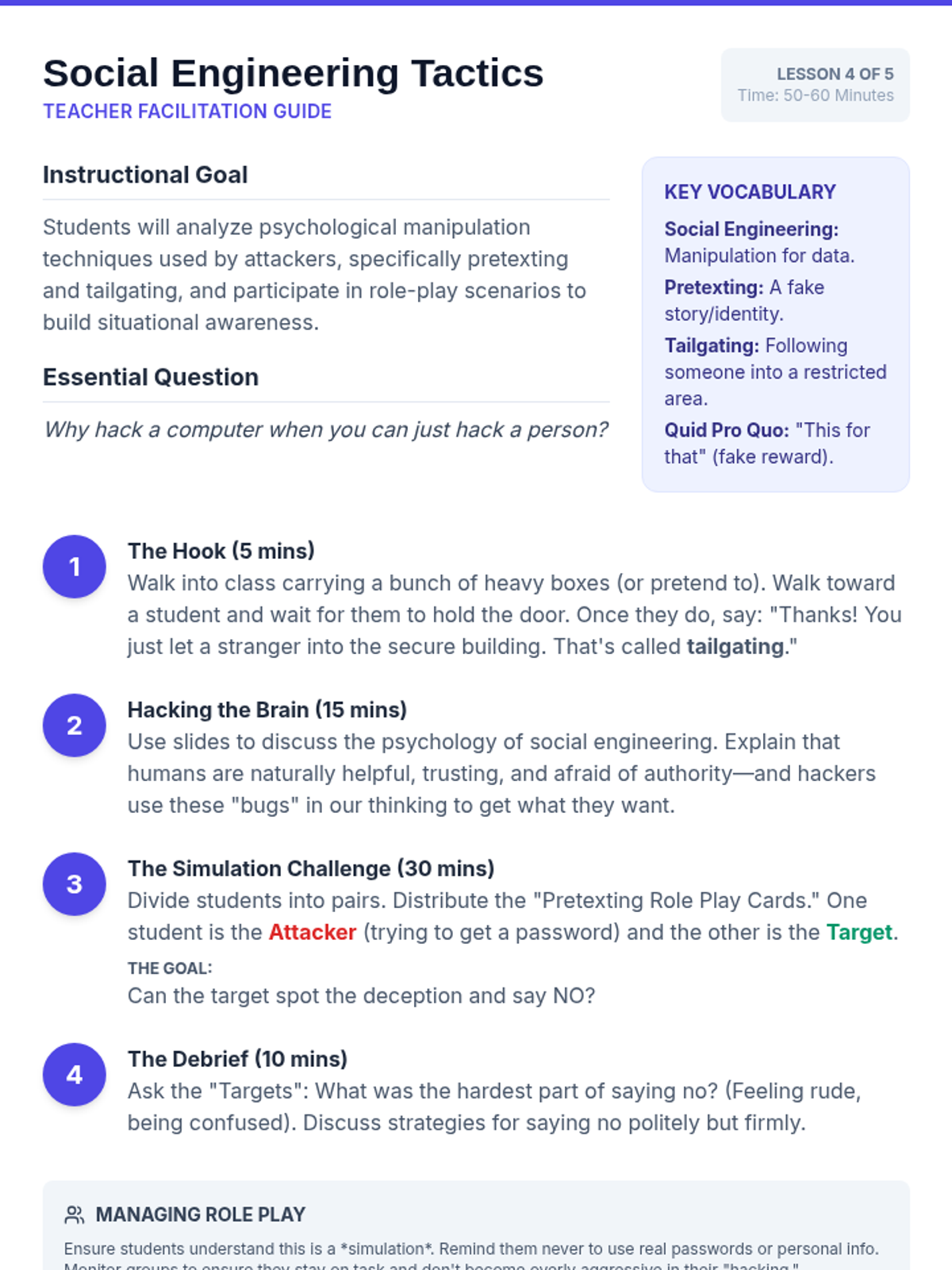 An inquiry-driven exploration of malware and social engineering, focusing on how attackers exploit software and human psychology. Students learn to identify threats and advocate for digital safety.