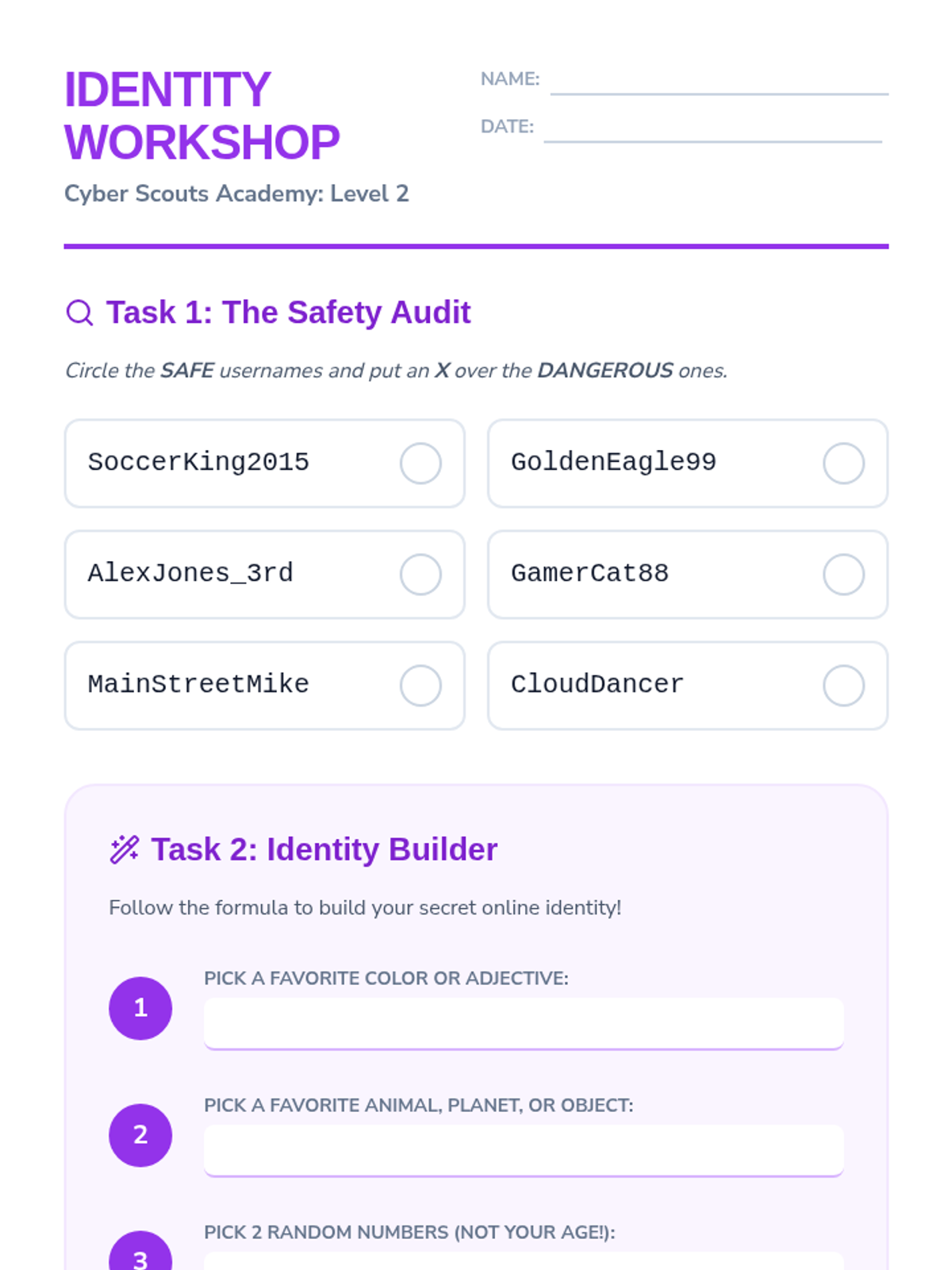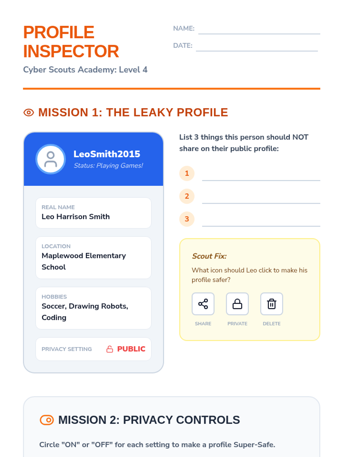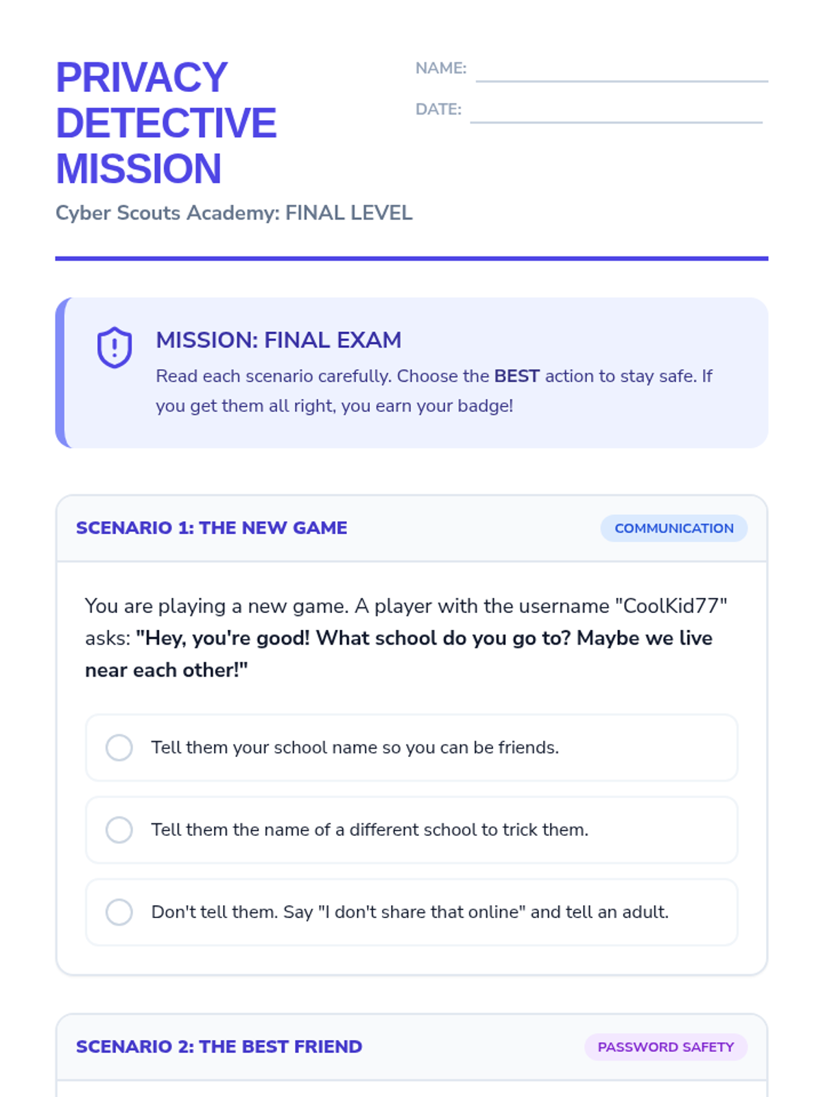 A comprehensive digital citizenship sequence for 3rd grade students focusing on distinguishing personal from public information, creating safe identities, and securing digital accounts through passwords and privacy settings.