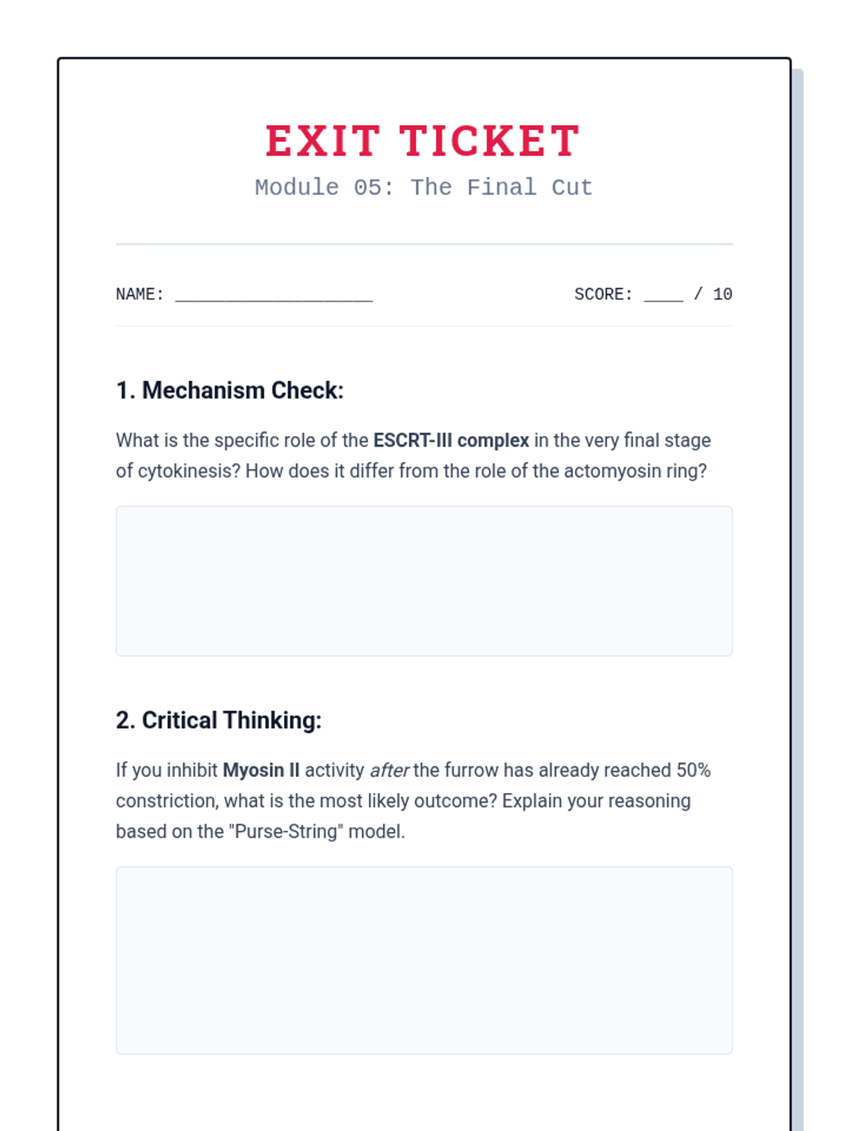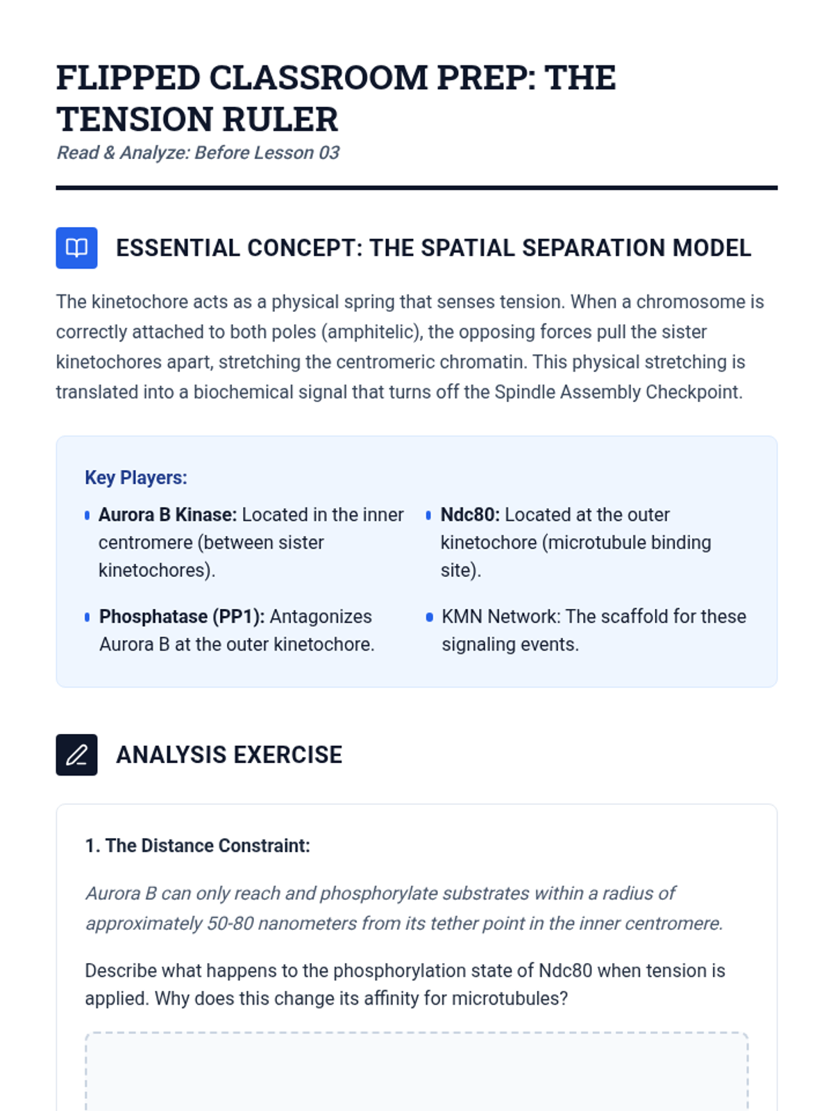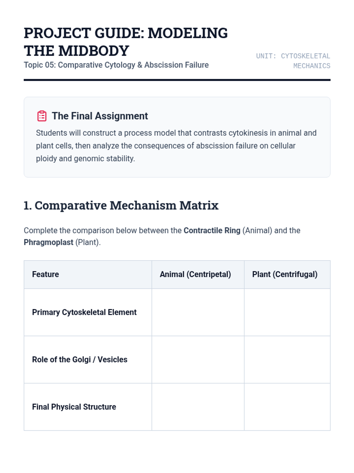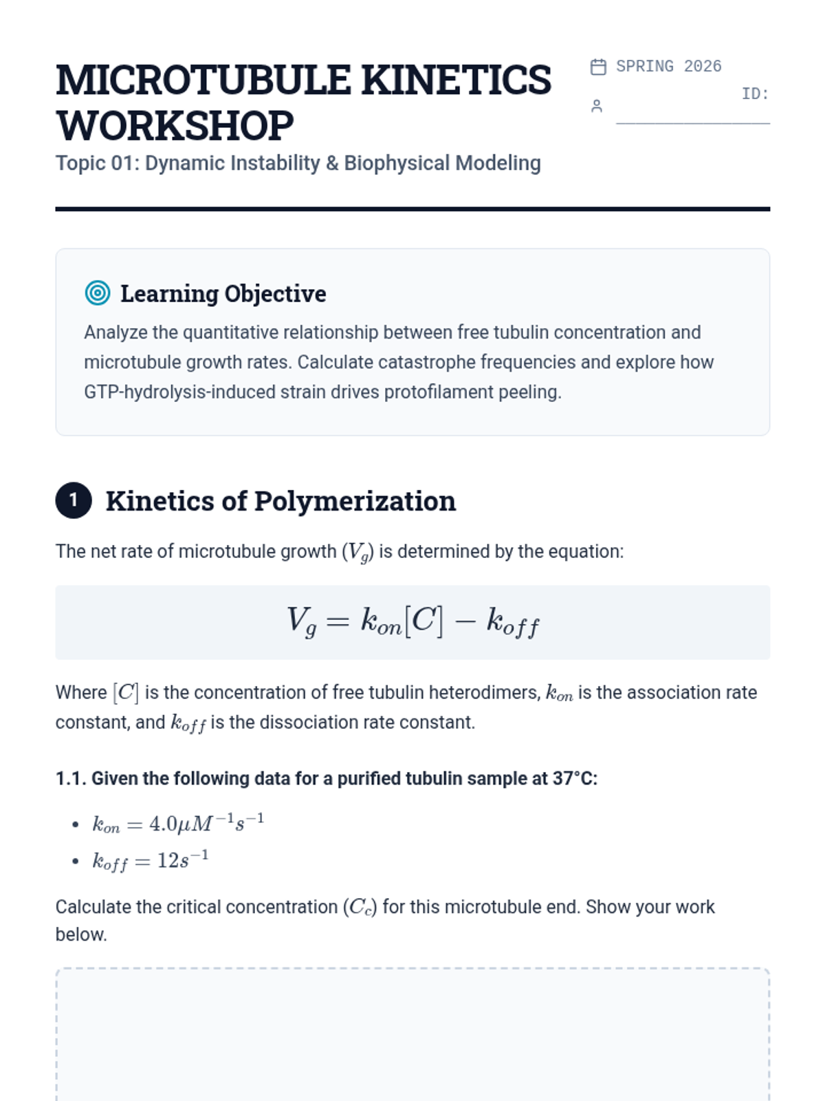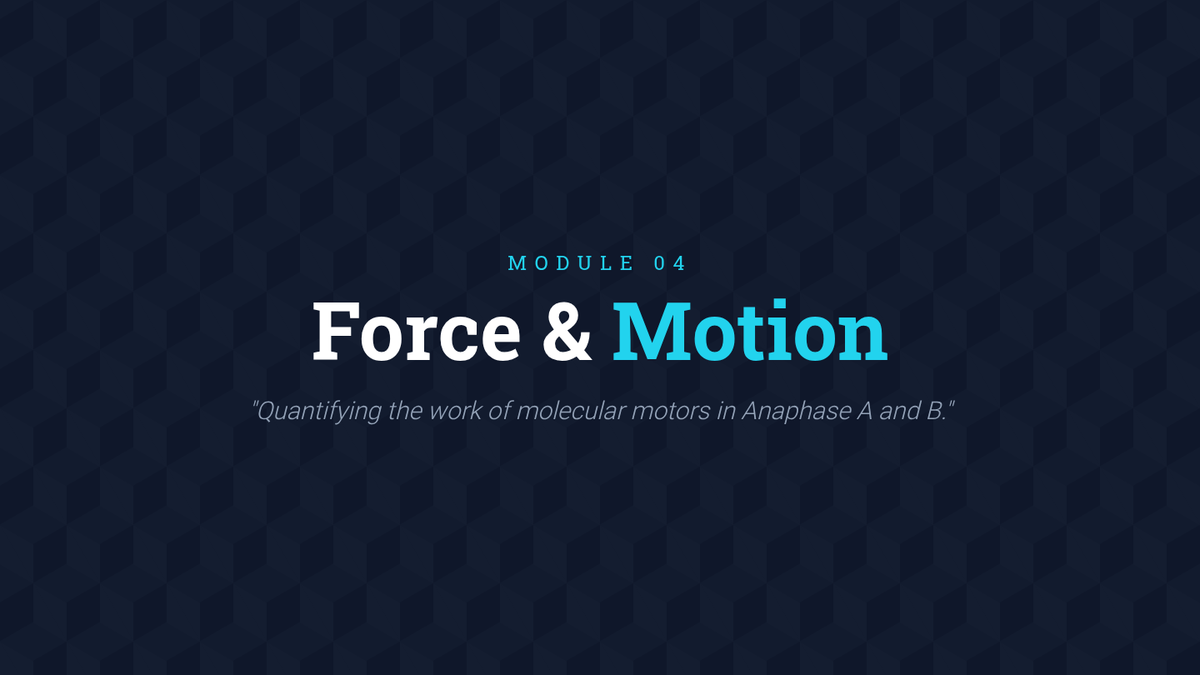 An undergraduate-level investigation into the biophysical and structural mechanics driving mitosis, focusing on microtubule dynamics, kinetochore capture, motor proteins, and cytokinesis. Students analyze force generation and structural biology through microscopy data and quantitative modeling.
