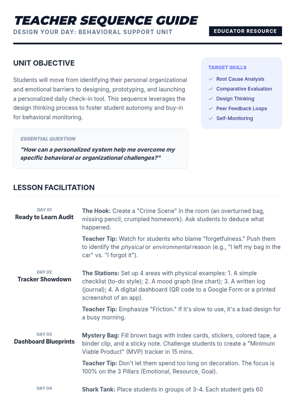 A project-based sequence where 6th-grade students design, prototype, and launch personalized daily check-in tools to manage their behavioral and organizational goals. Students move from identifying obstacles to creating a sustainable self-monitoring system.