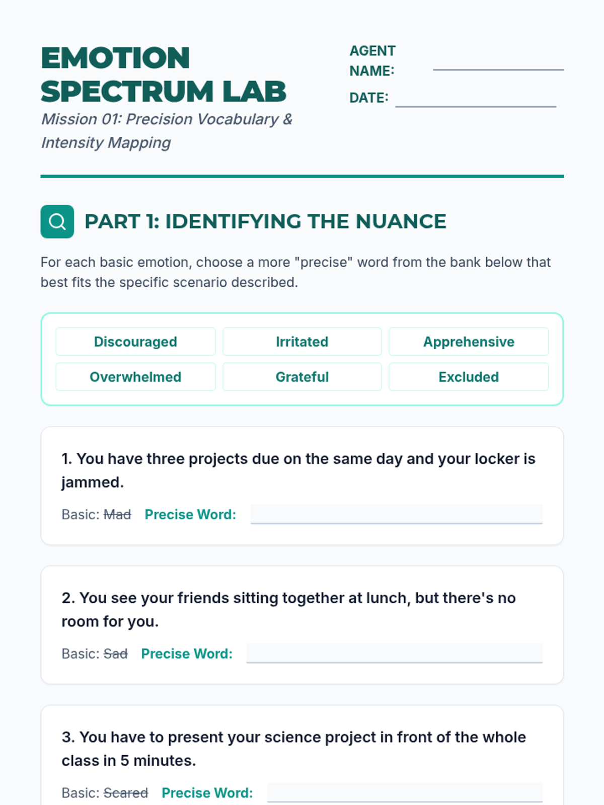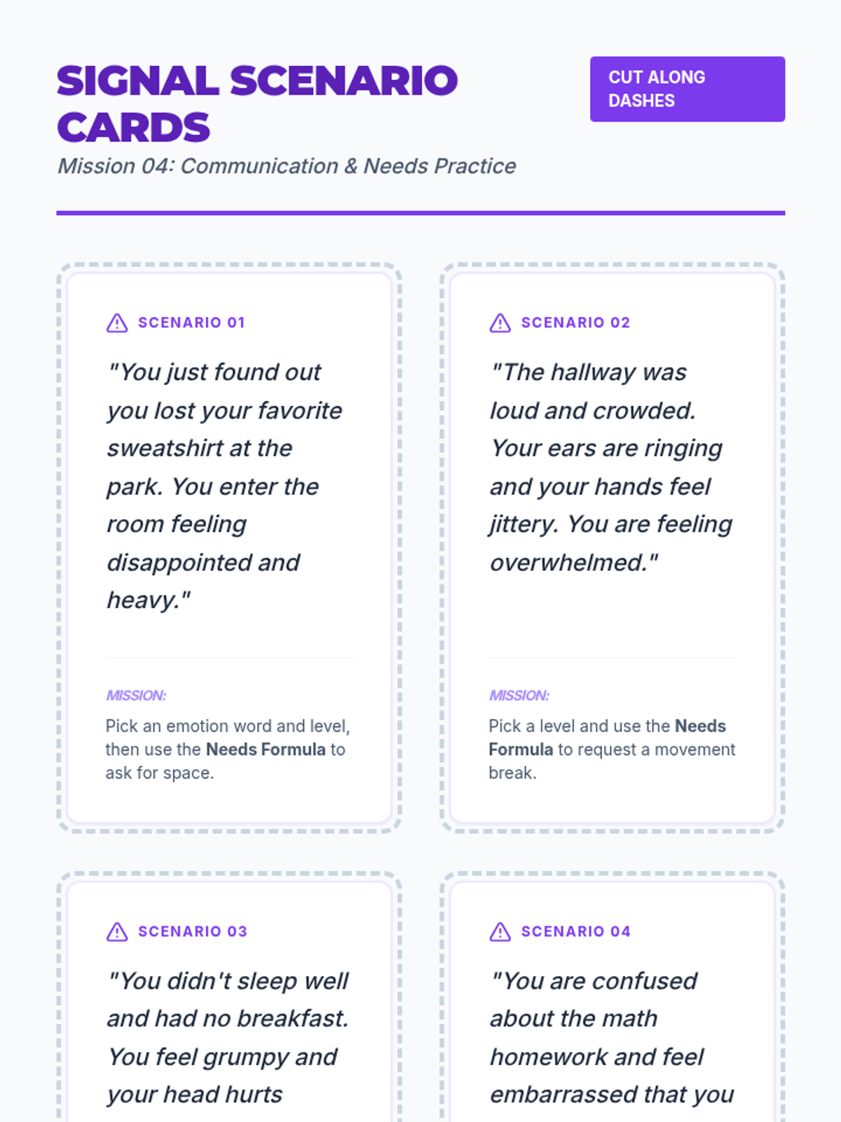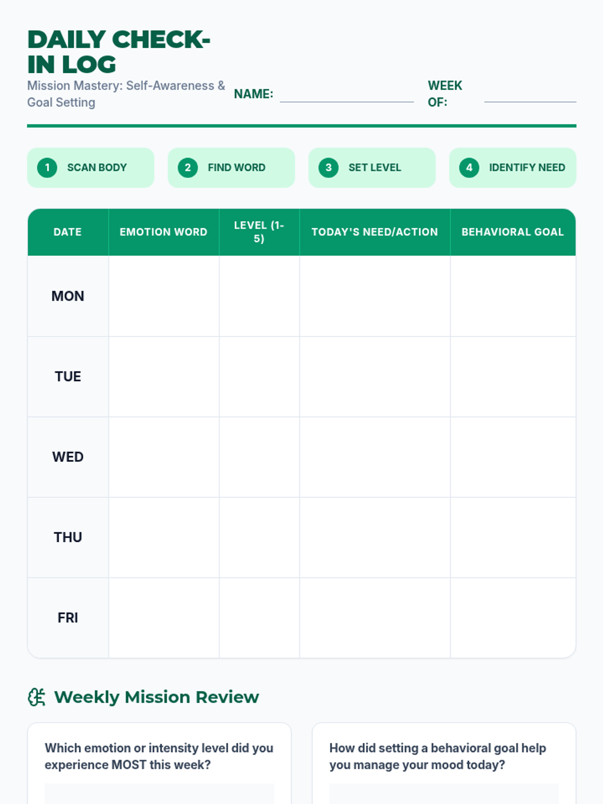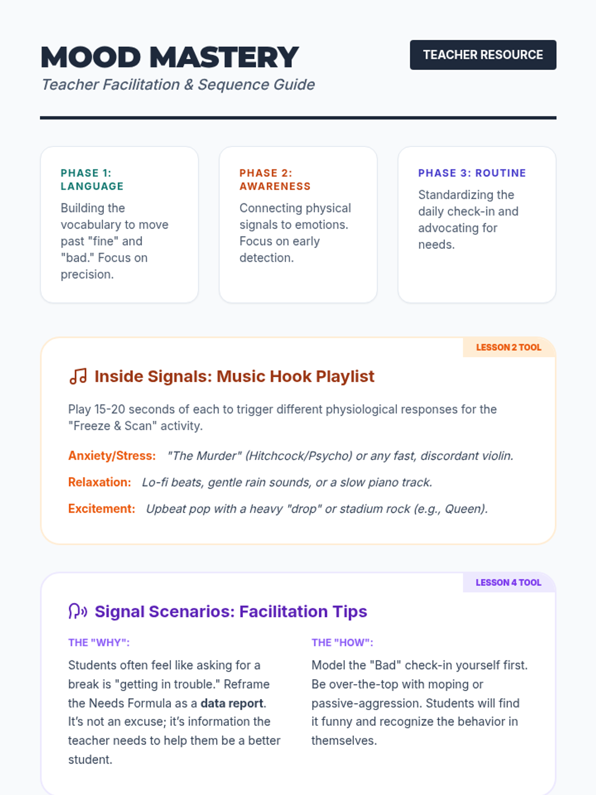 A comprehensive sequence for 6th graders to master emotional identification, body awareness, and the communication of needs through a structured daily check-in routine. students build a precise vocabulary, recognize physical cues, and practice self-advocacy to improve classroom success.