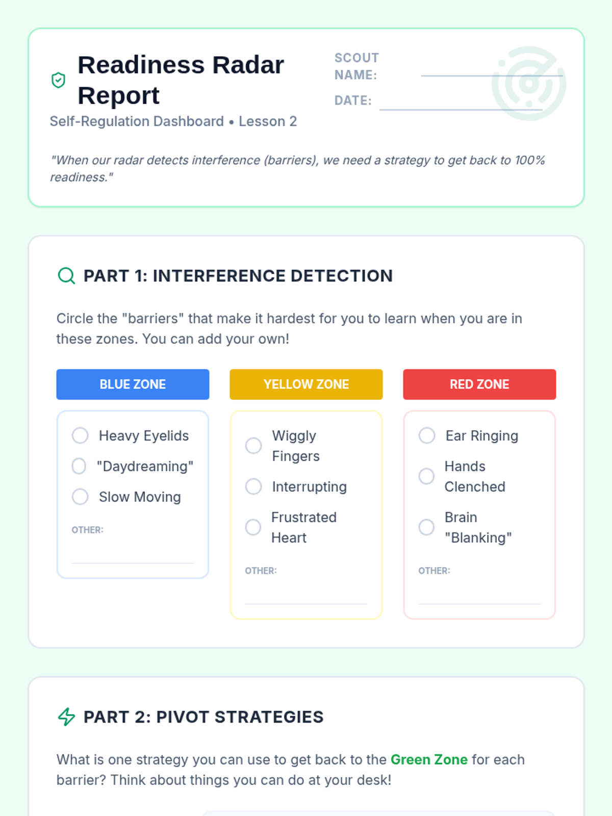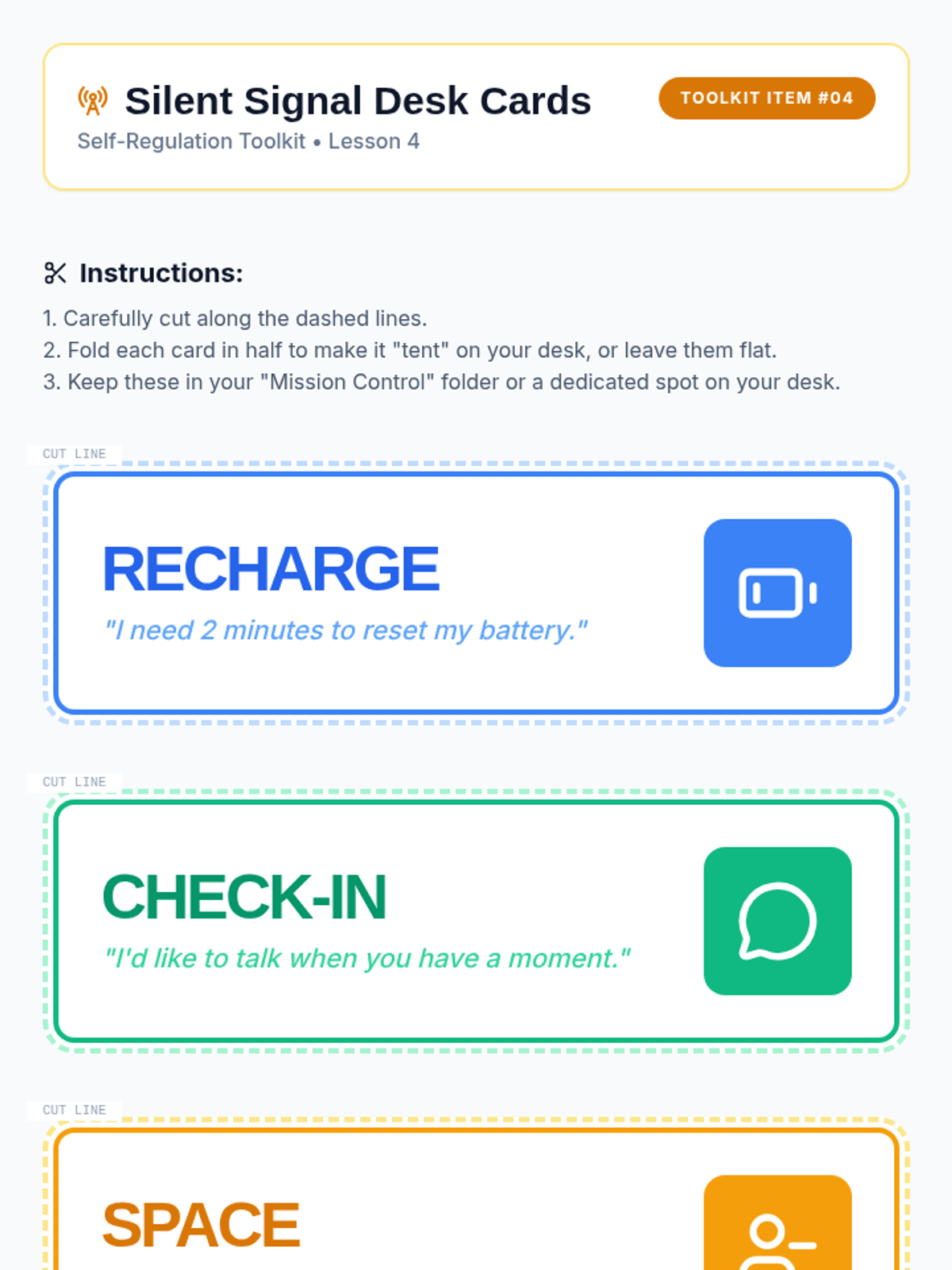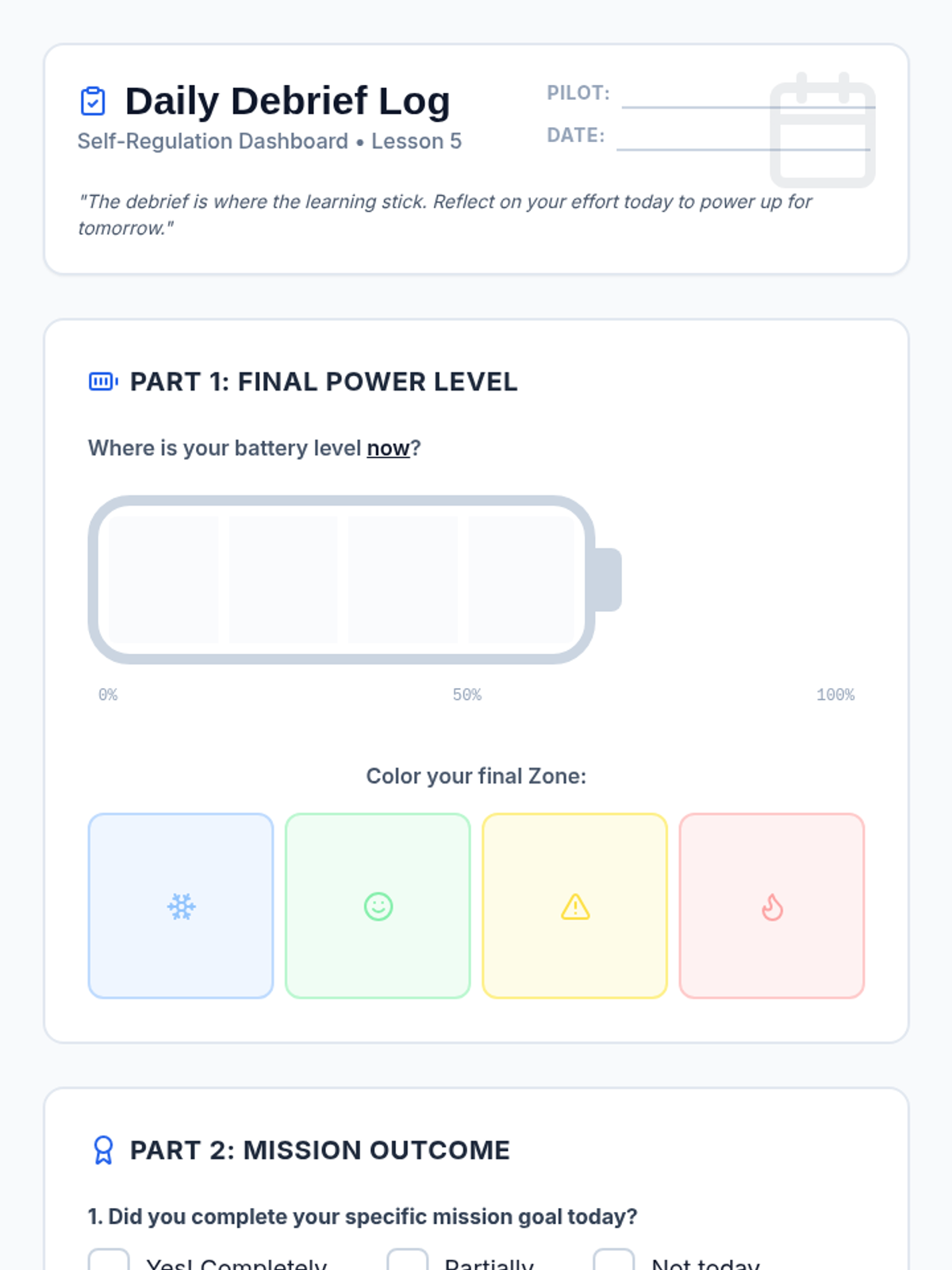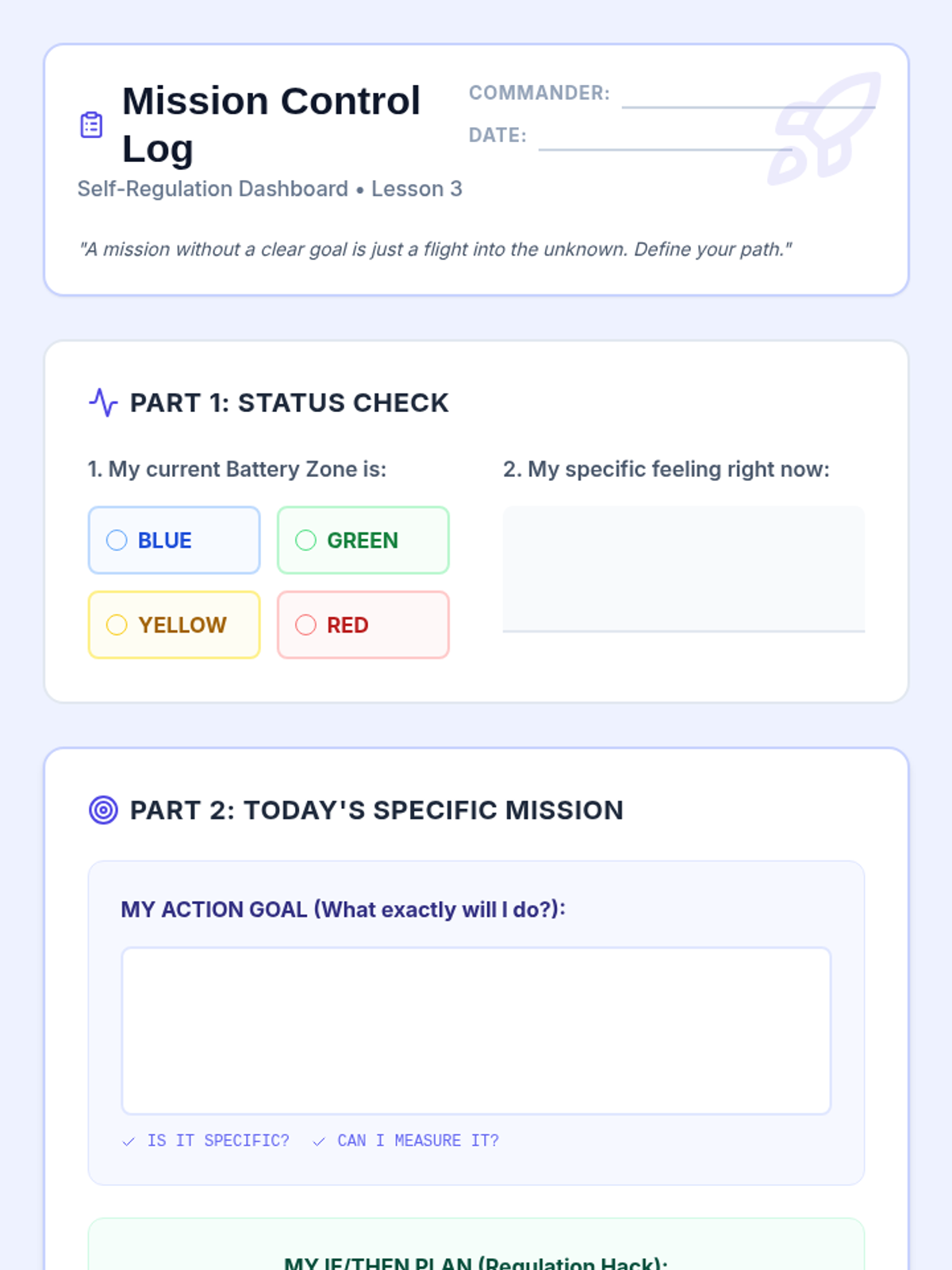 A comprehensive 5-lesson sequence designed to teach 4th-grade students self-regulation through daily emotional check-ins, goal setting, and non-verbal communication. Students learn to identify their internal state using a battery metaphor and connect it to their readiness for learning.