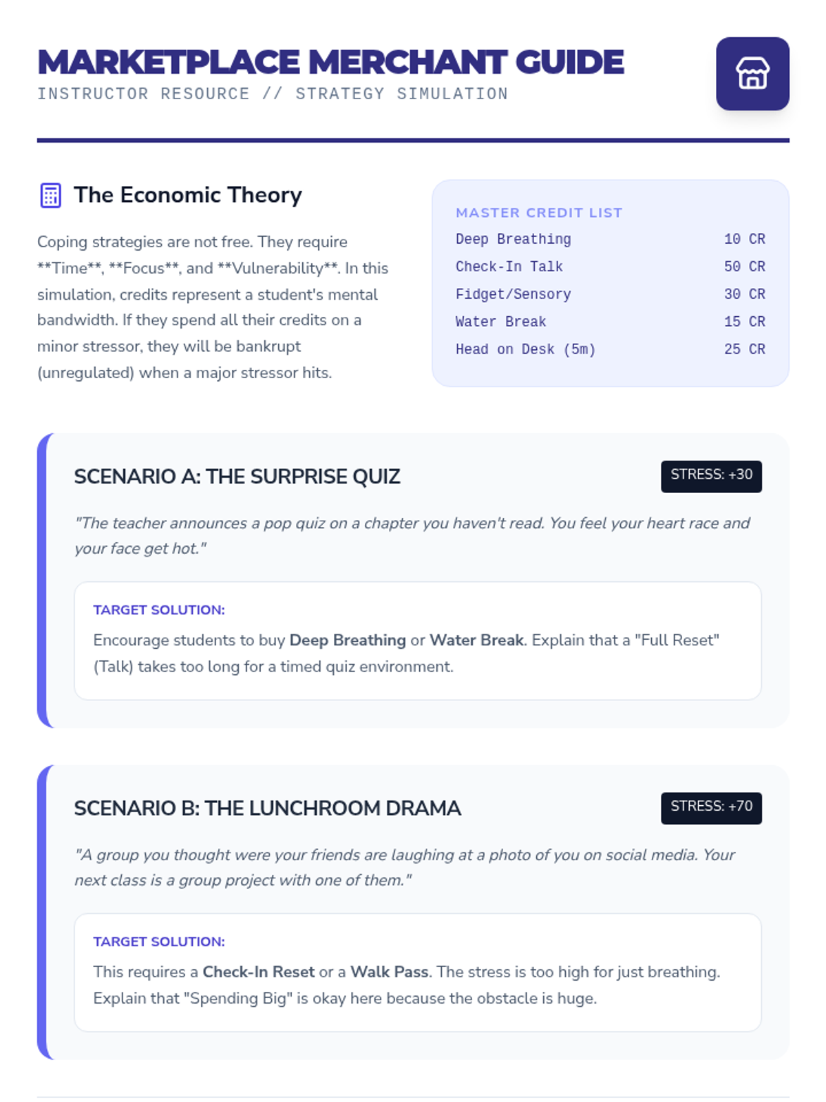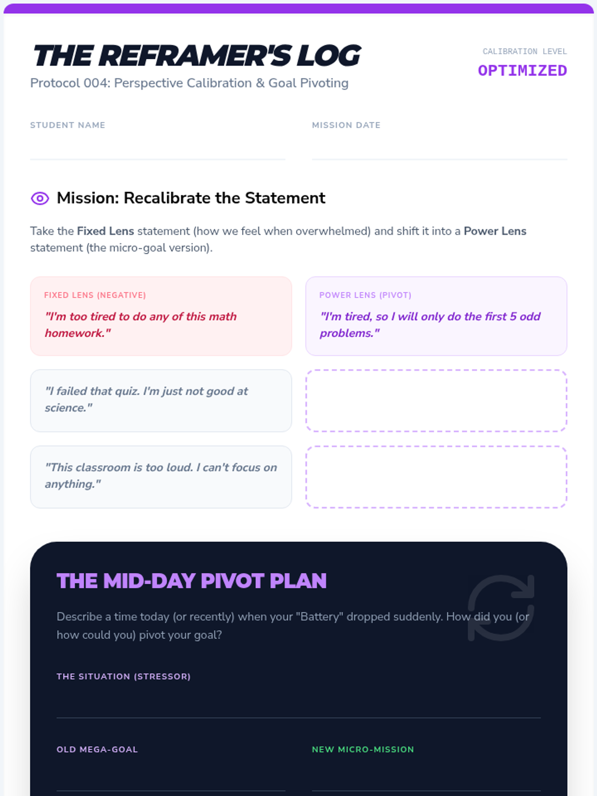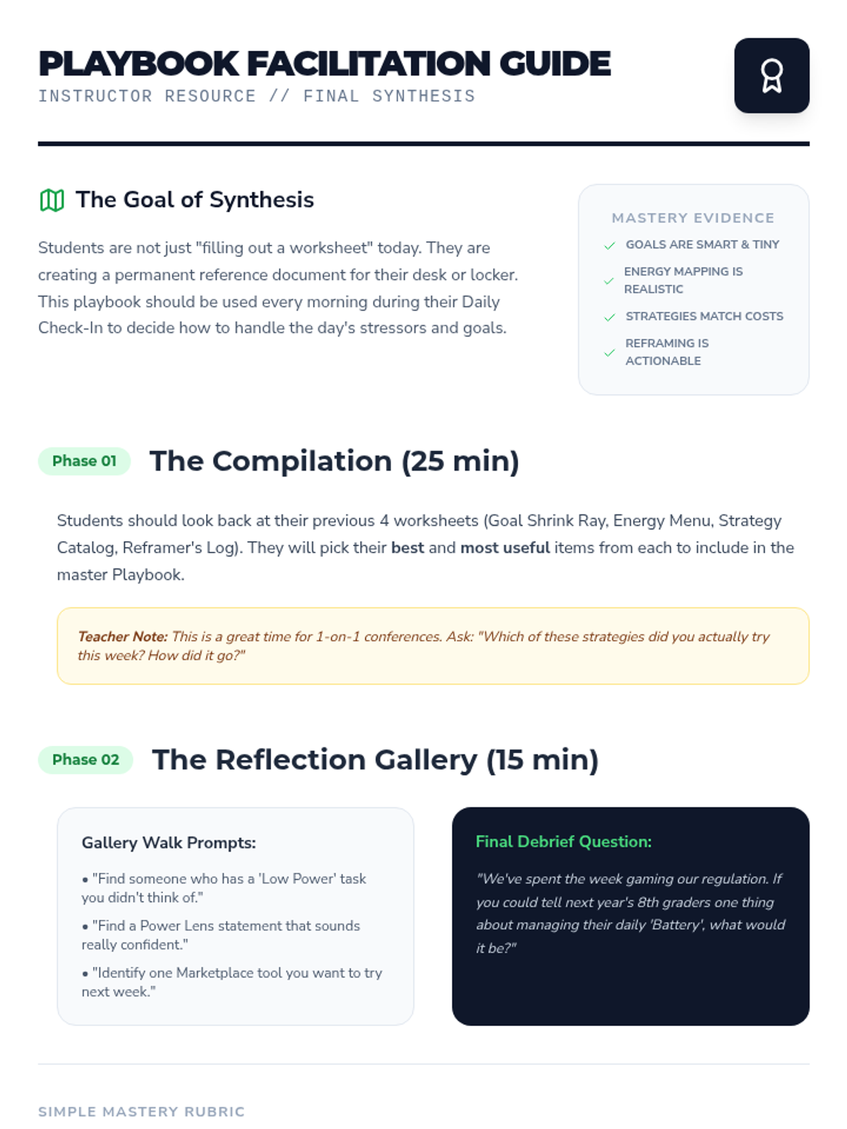 This sequence uses a gamified, mastery-based approach to teach 8th-grade students how to link daily check-ins with micro-goal setting and energy management. Students learn to navigate stressors as 'game obstacles' and select the right 'coping tools' based on their current 'energy battery.'