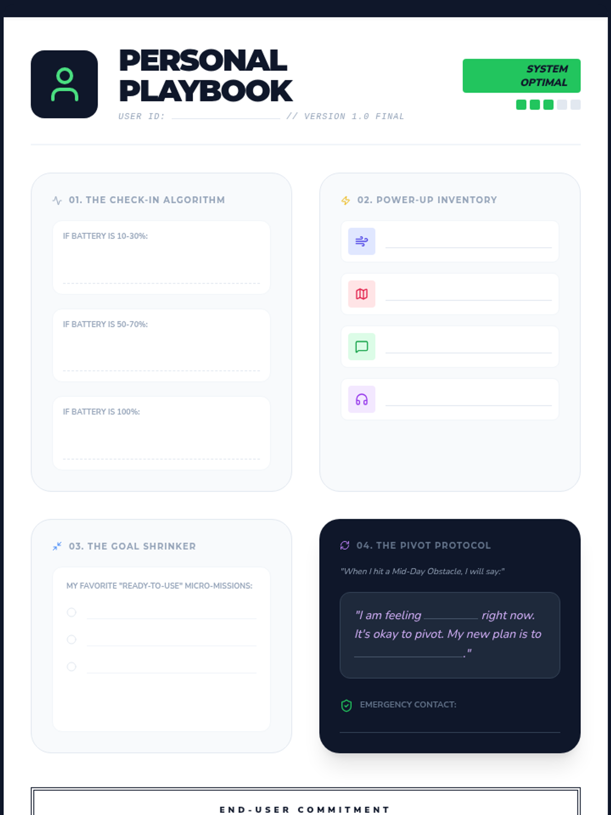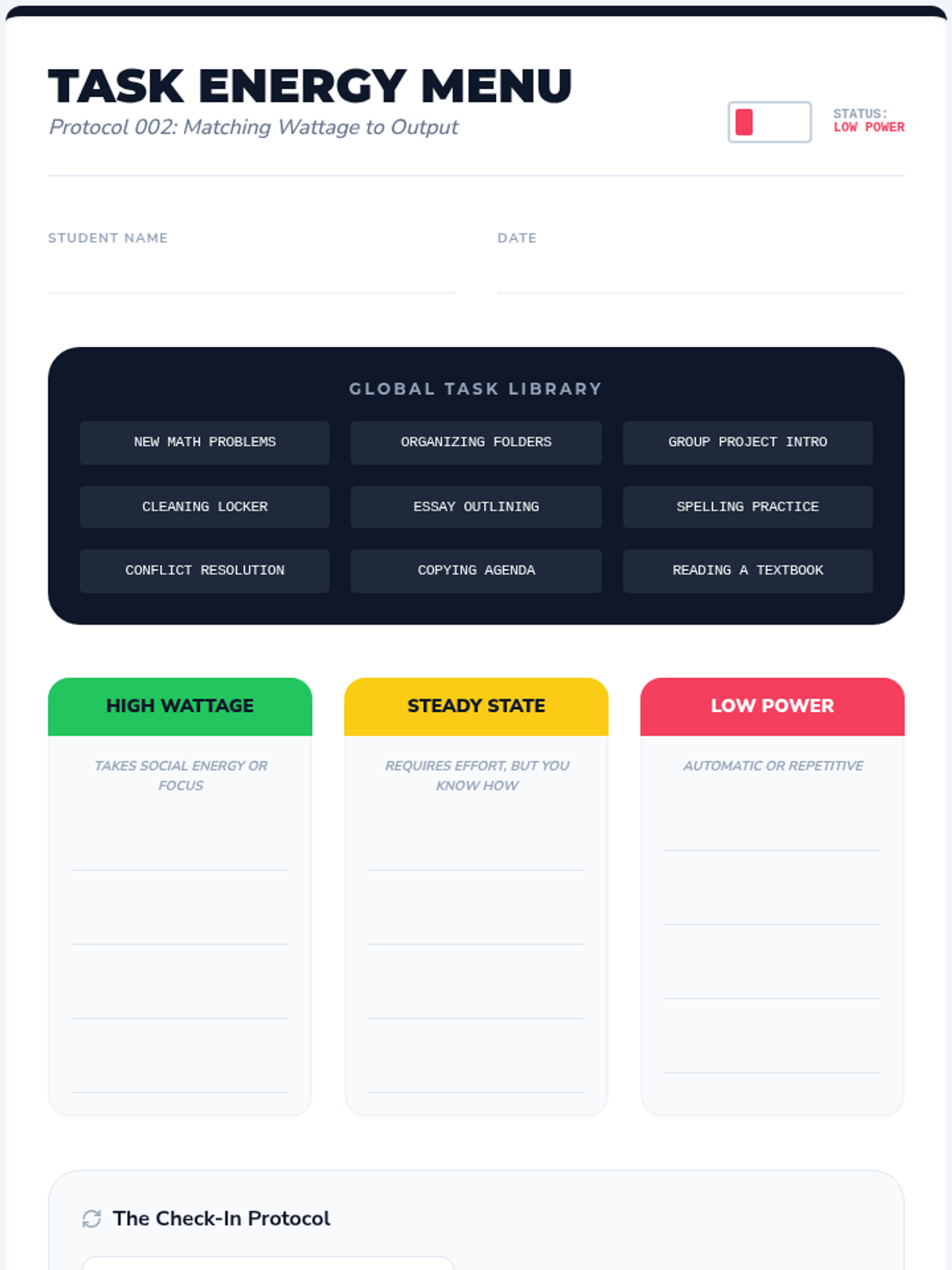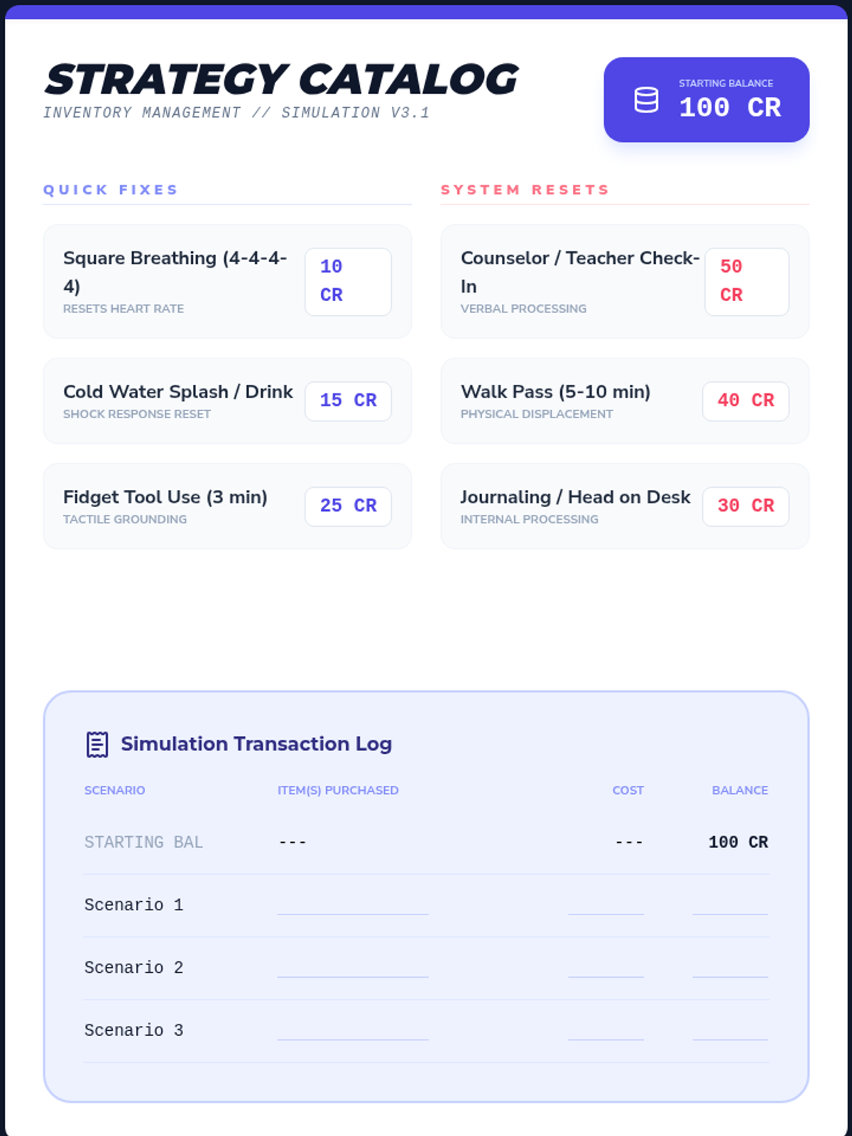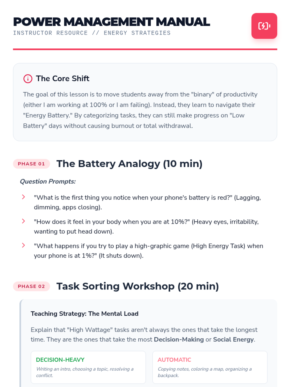 This sequence uses a gamified, mastery-based approach to teach 8th-grade students how to link daily check-ins with micro-goal setting and energy management. Students learn to navigate stressors as 'game obstacles' and select the right 'coping tools' based on their current 'energy battery.'