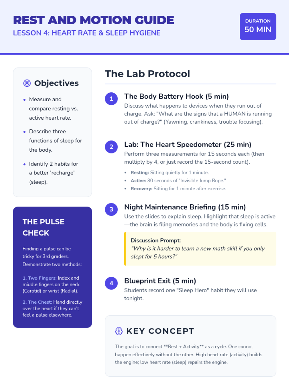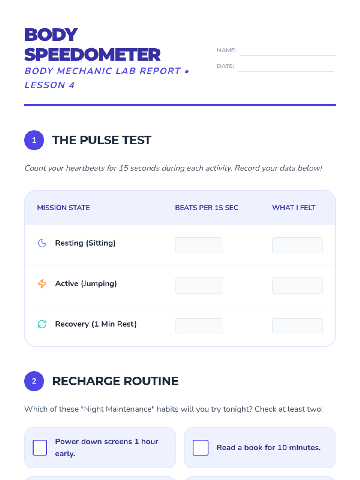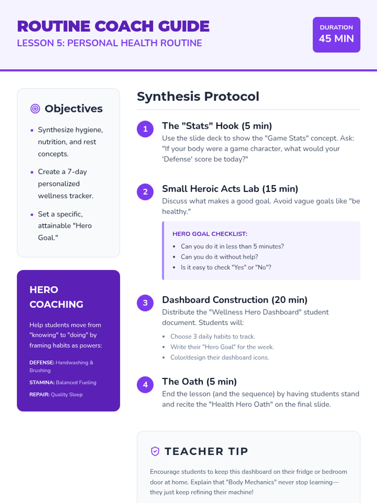 A comprehensive health sequence for 3rd graders focused on hygiene, nutrition, and self-care. Students learn the science behind daily habits and design a personalized wellness tracking system.