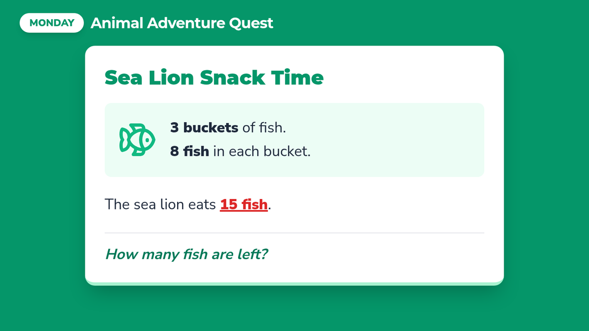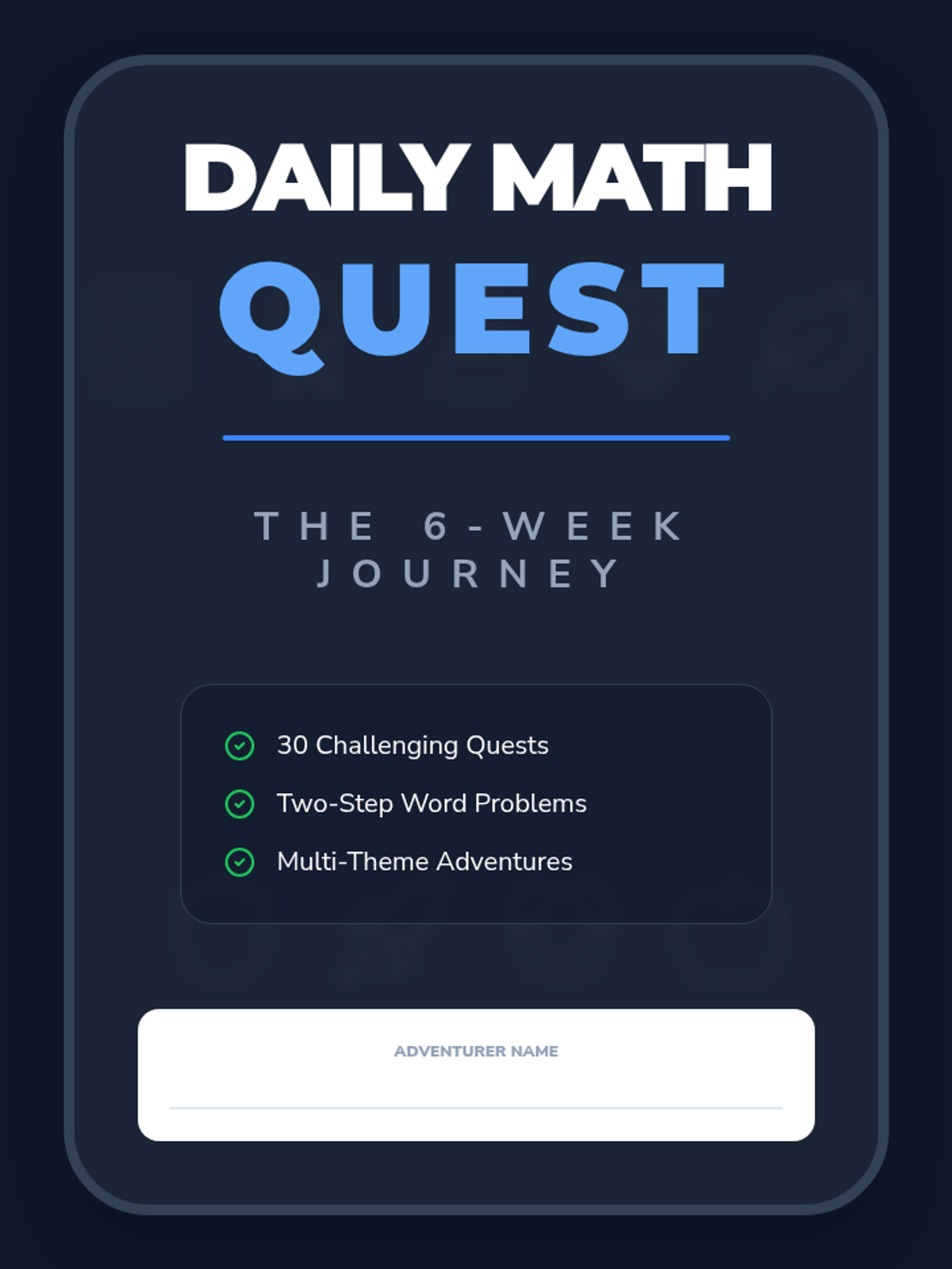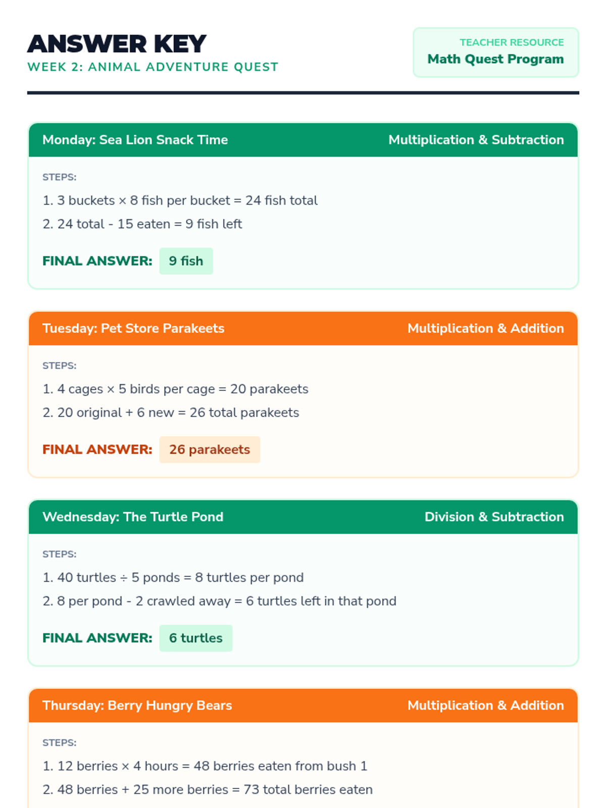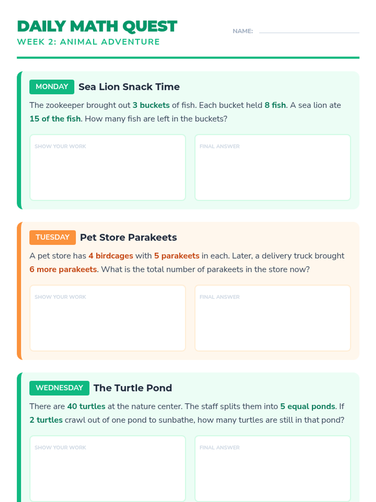 A 6-week program of daily two-step math word problems featuring everyday life, animals, fantasy, and seasonal themes. Each week includes a worksheet, a slide deck for daily projection, and an answer key.