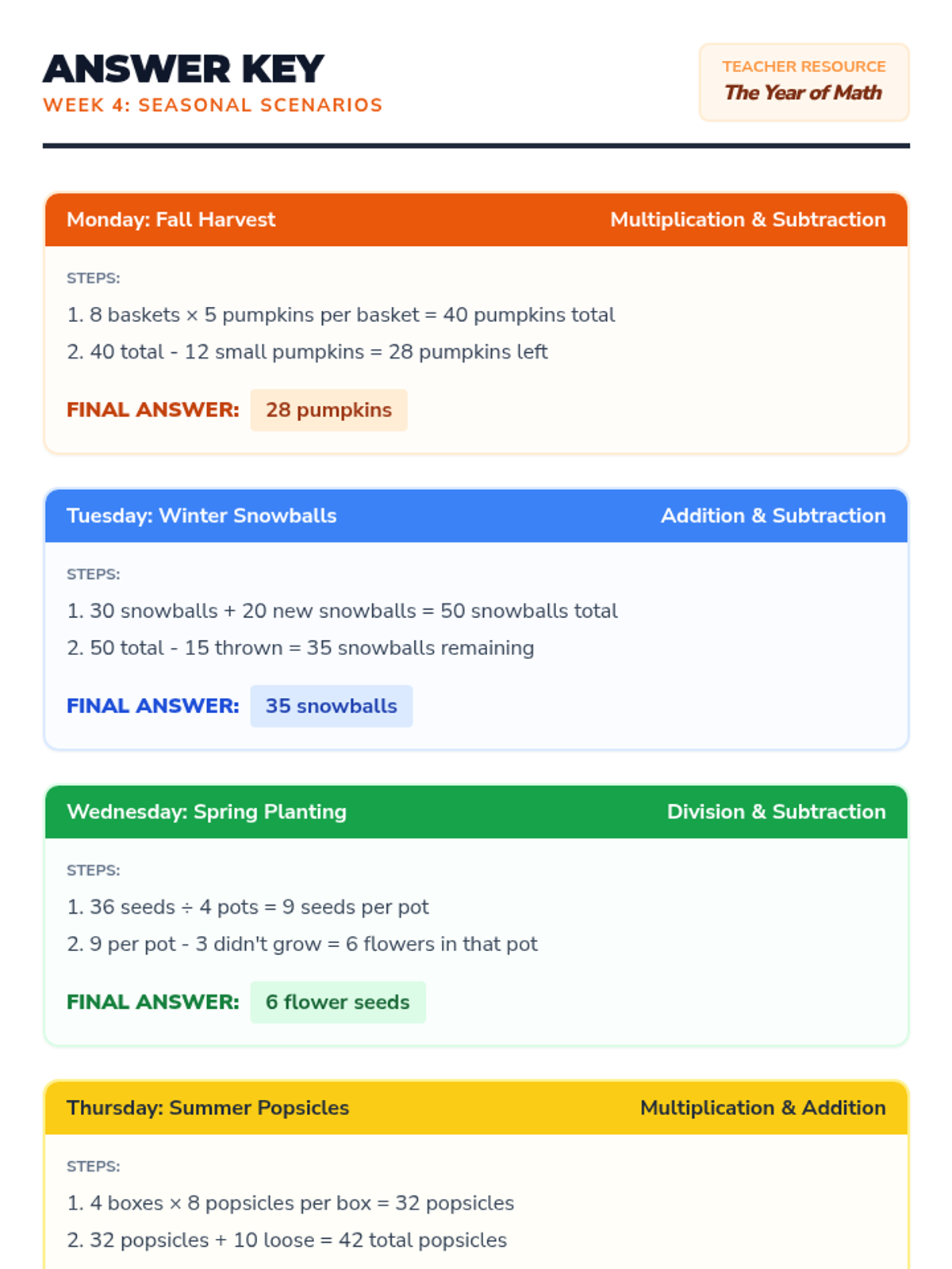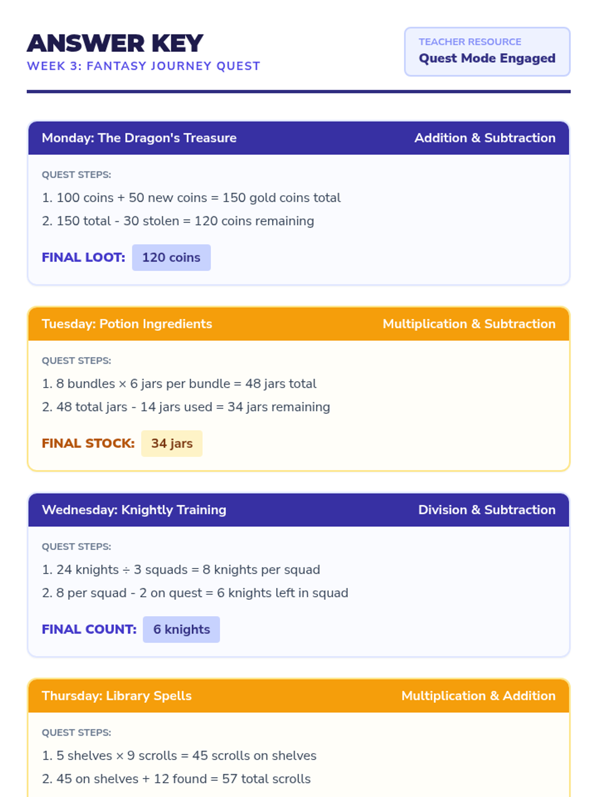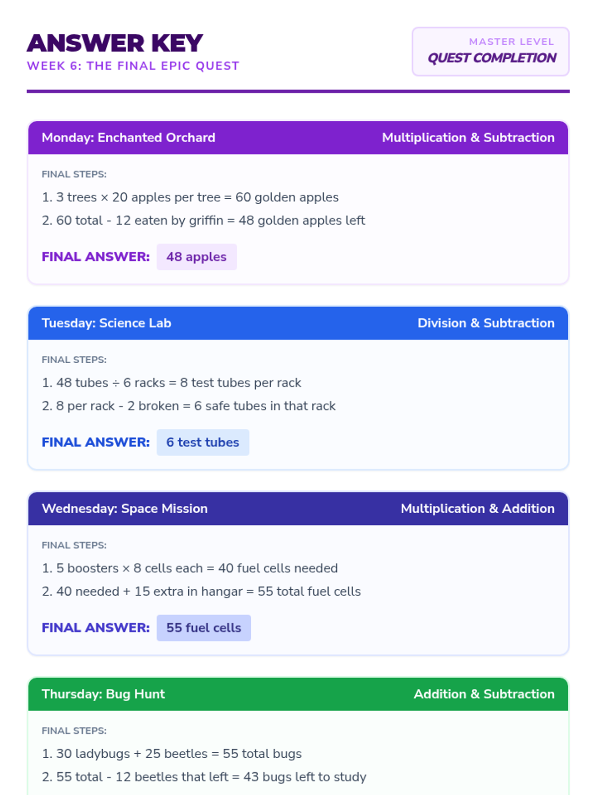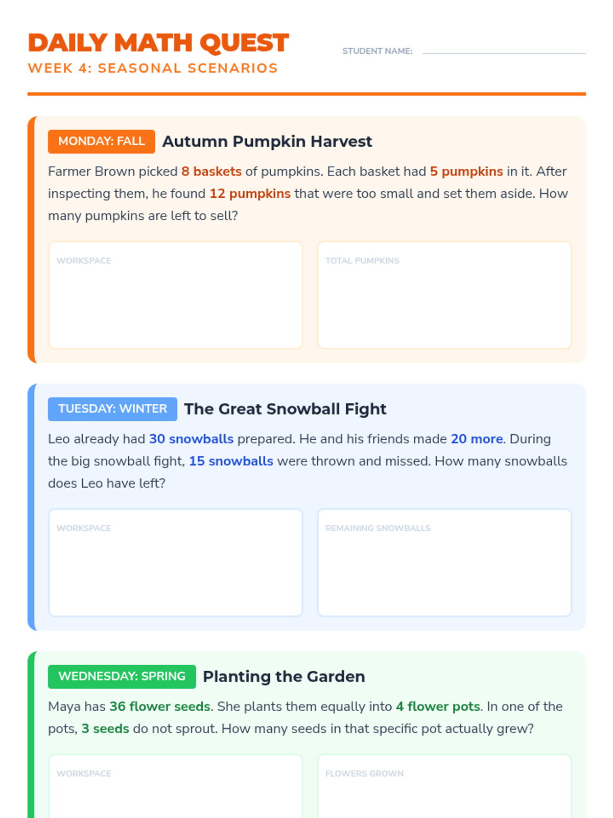 A 6-week program of daily two-step math word problems featuring everyday life, animals, fantasy, and seasonal themes. Each week includes a worksheet, a slide deck for daily projection, and an answer key.