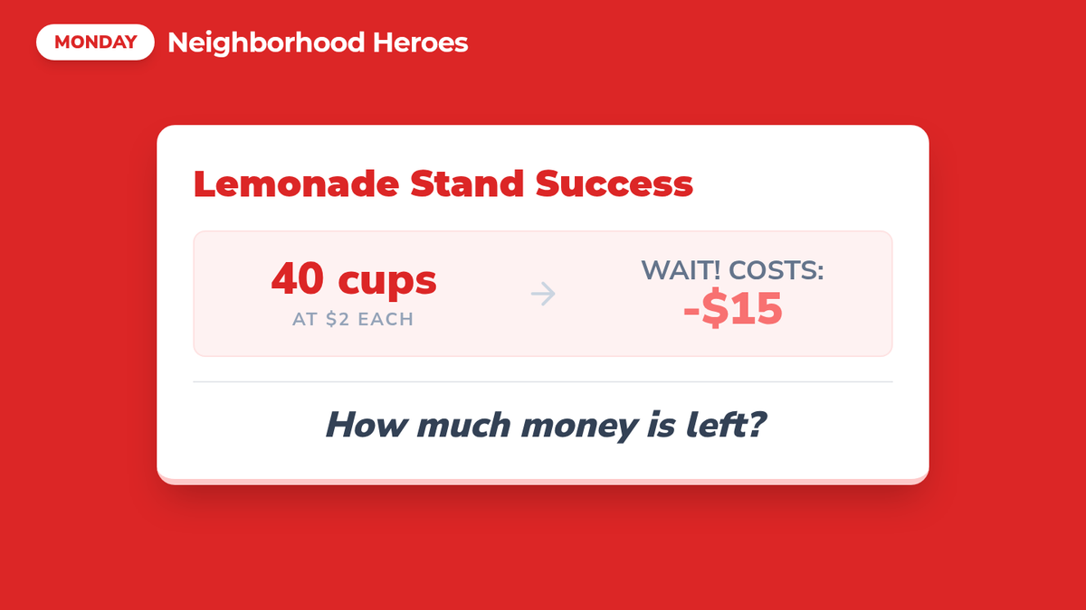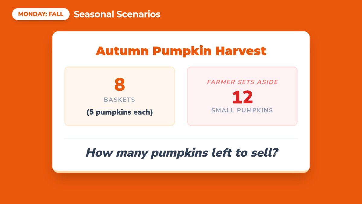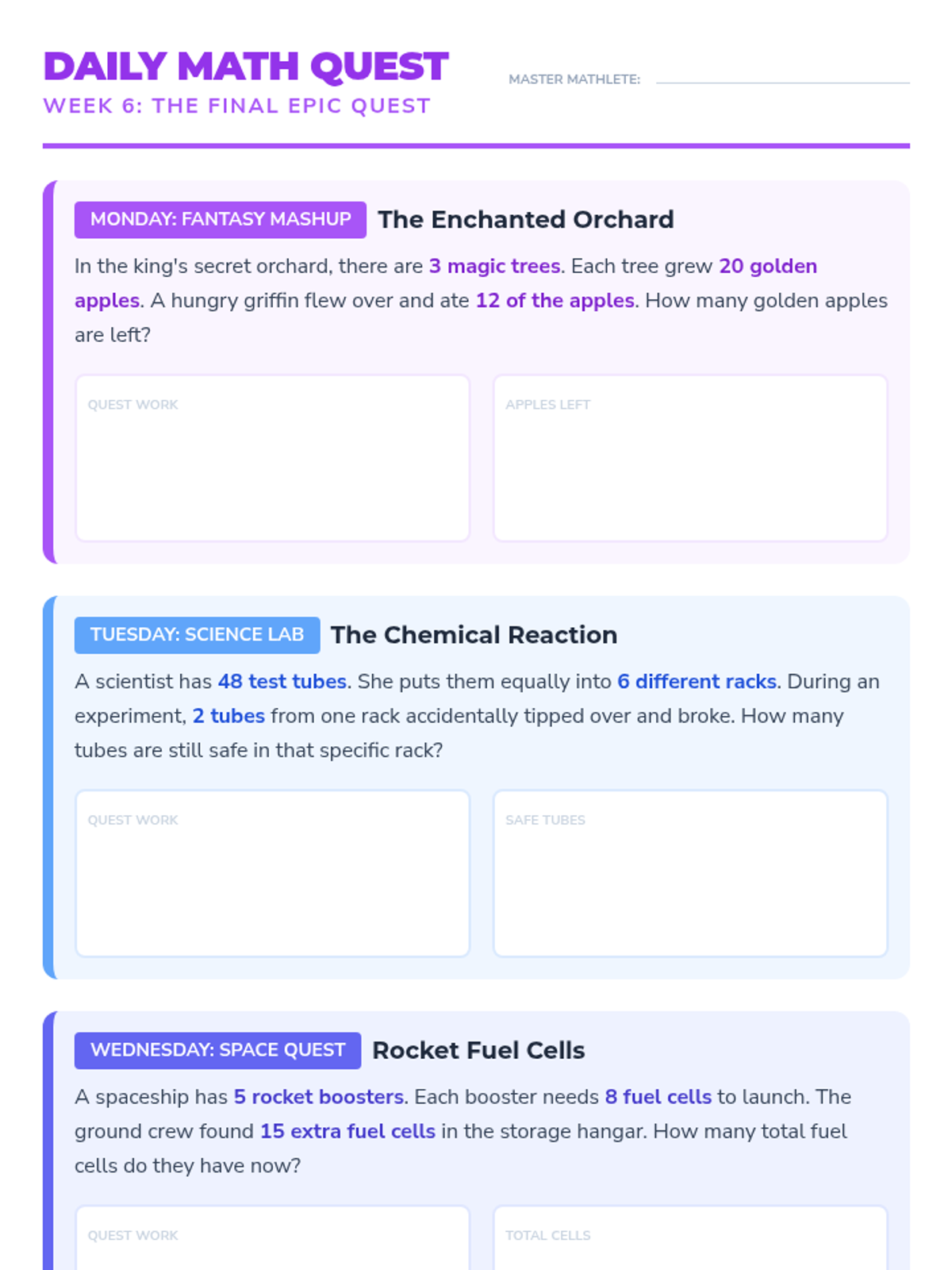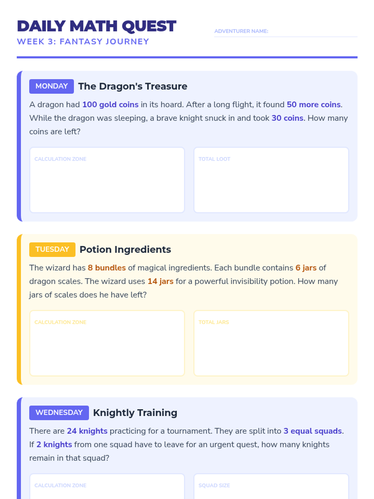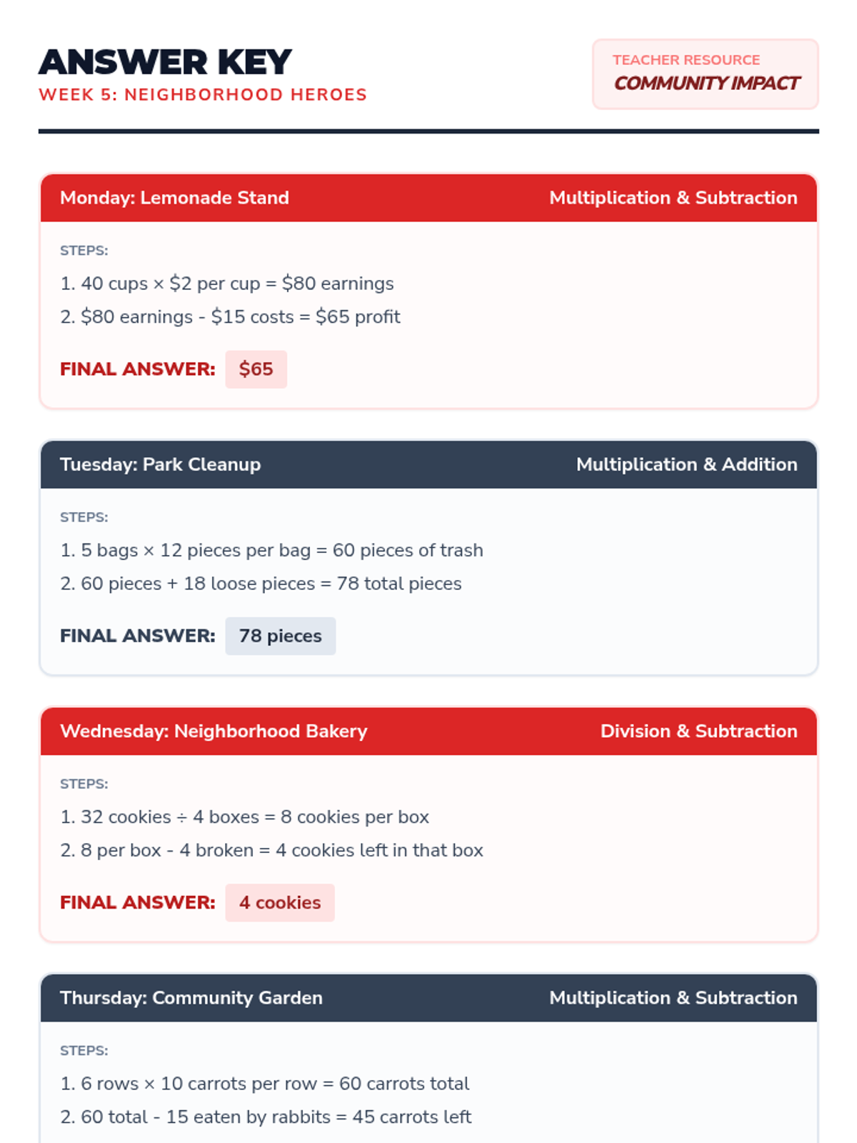 A 6-week program of daily two-step math word problems featuring everyday life, animals, fantasy, and seasonal themes. Each week includes a worksheet, a slide deck for daily projection, and an answer key.