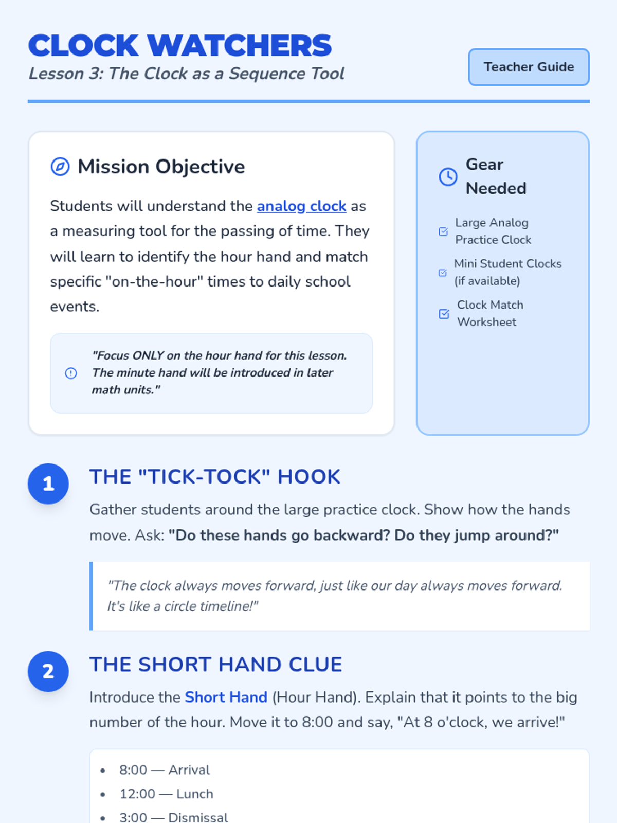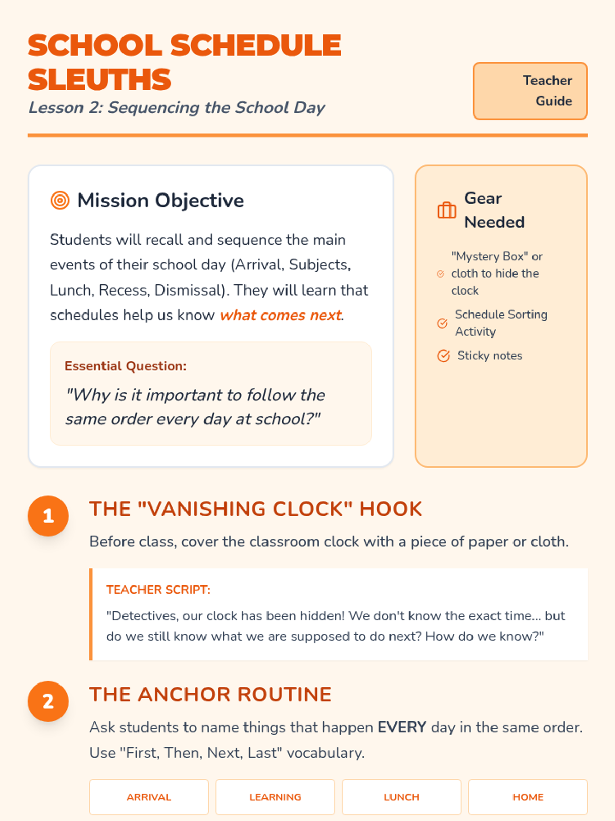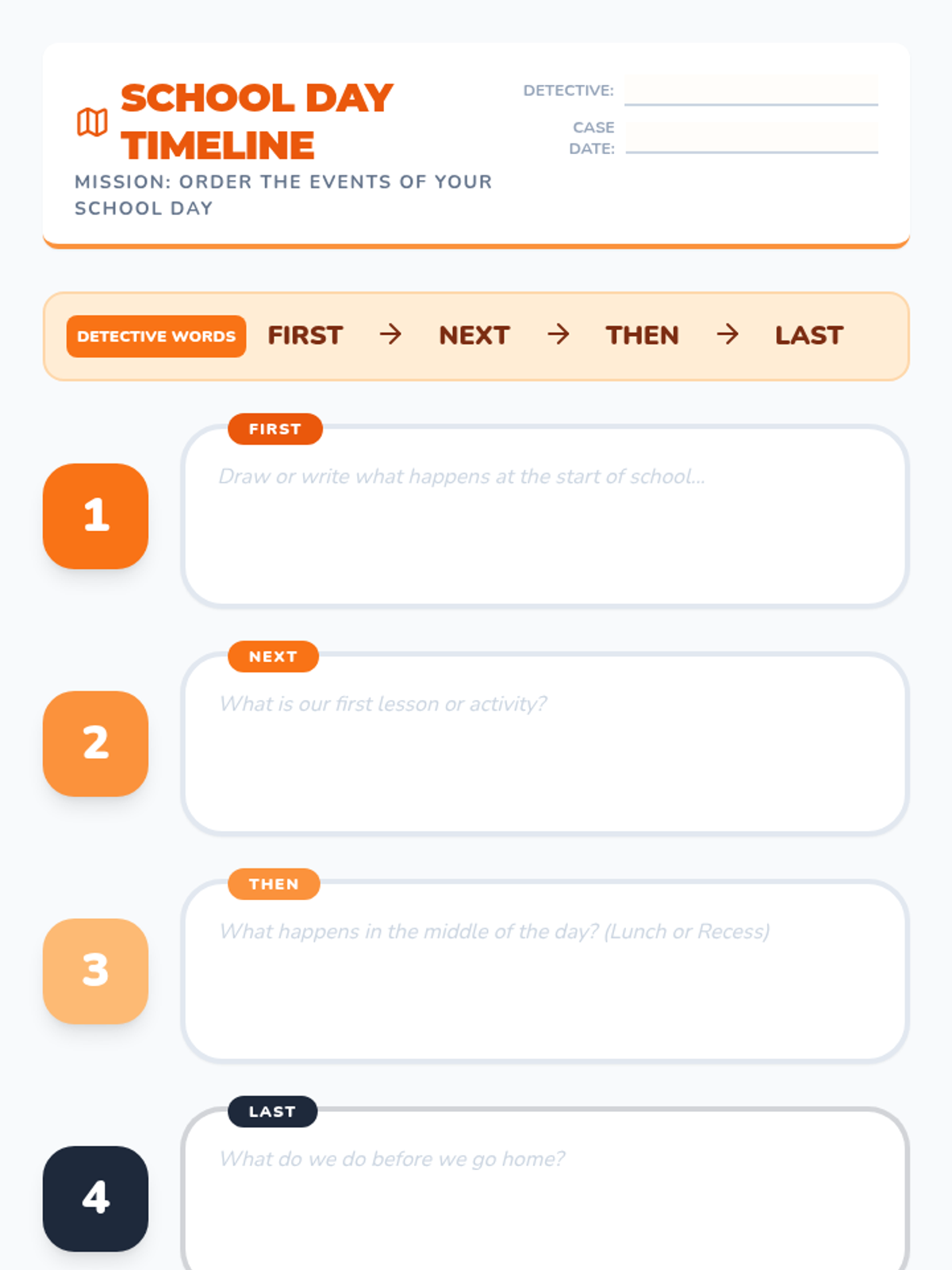 A 5-lesson sequence for 1st graders exploring daily routines, temporal vocabulary, and the logical ordering of events using the 'Day Detectives' theme. Students will master the concepts of Morning, Afternoon, and Night, while learning to use clocks and schedules to organize their world.
