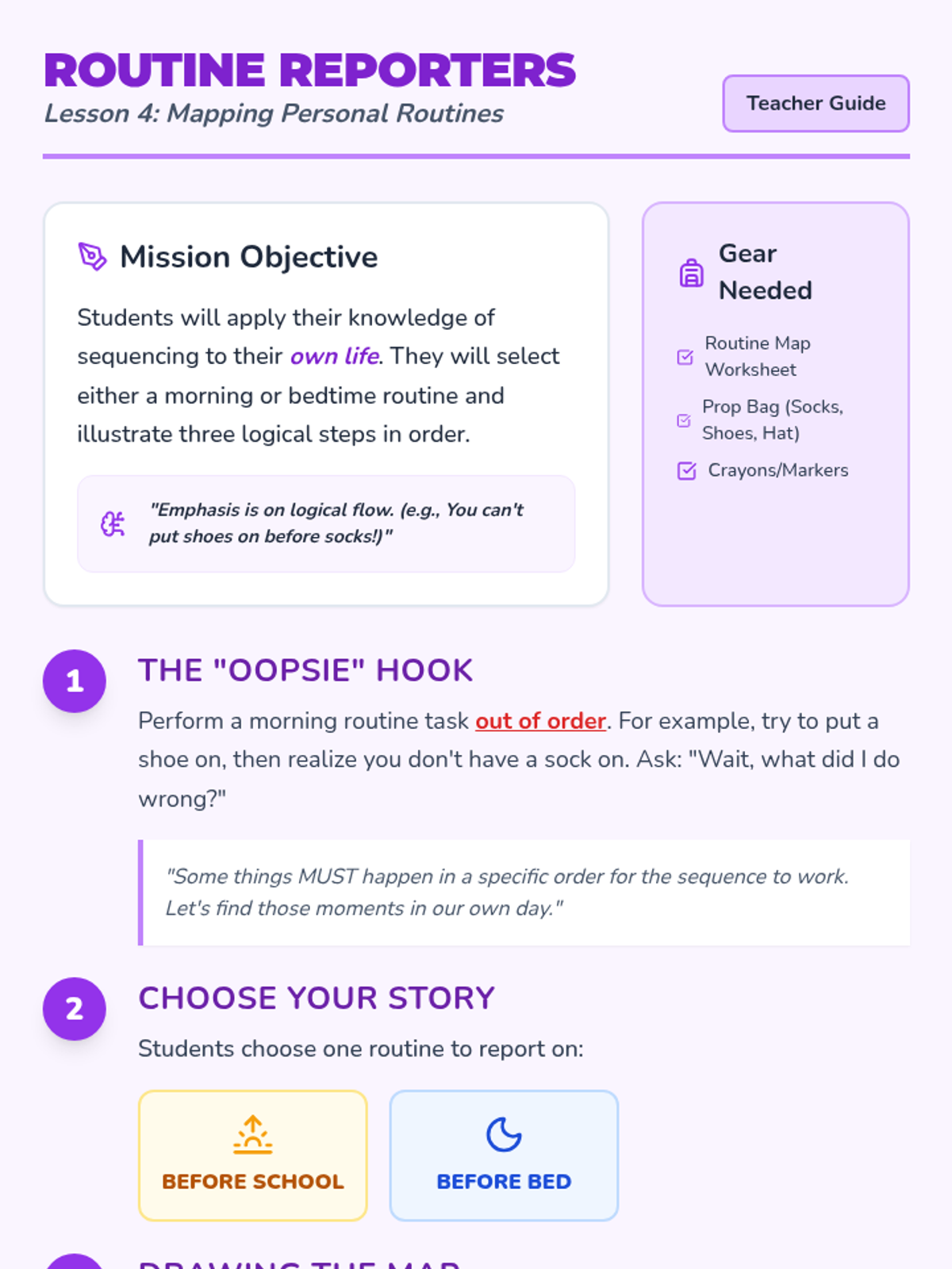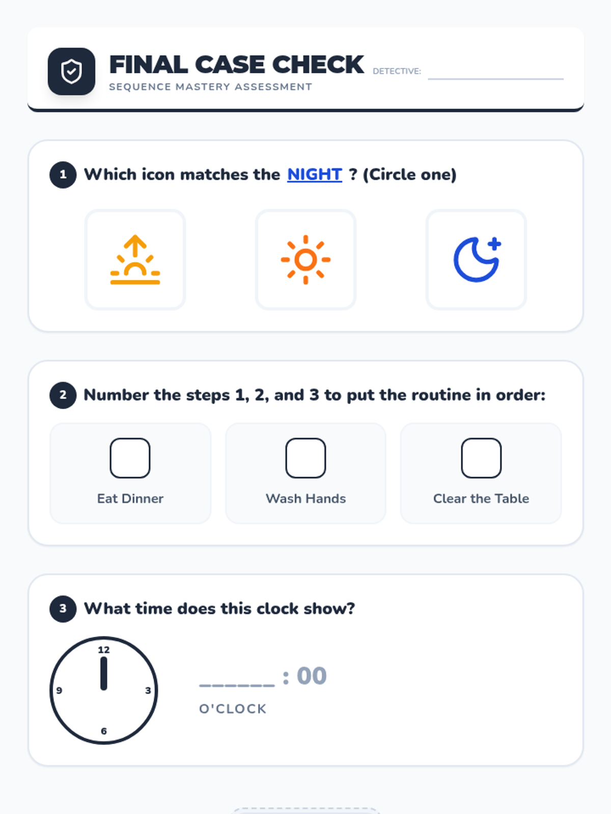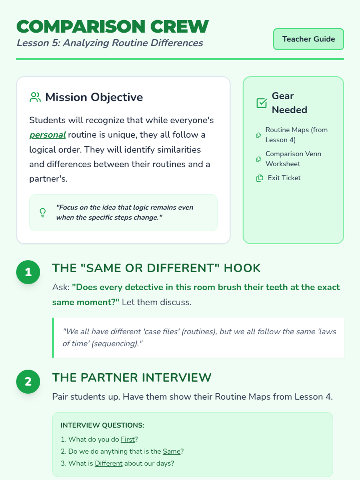 A 5-lesson sequence for 1st graders exploring daily routines, temporal vocabulary, and the logical ordering of events using the 'Day Detectives' theme. Students will master the concepts of Morning, Afternoon, and Night, while learning to use clocks and schedules to organize their world.